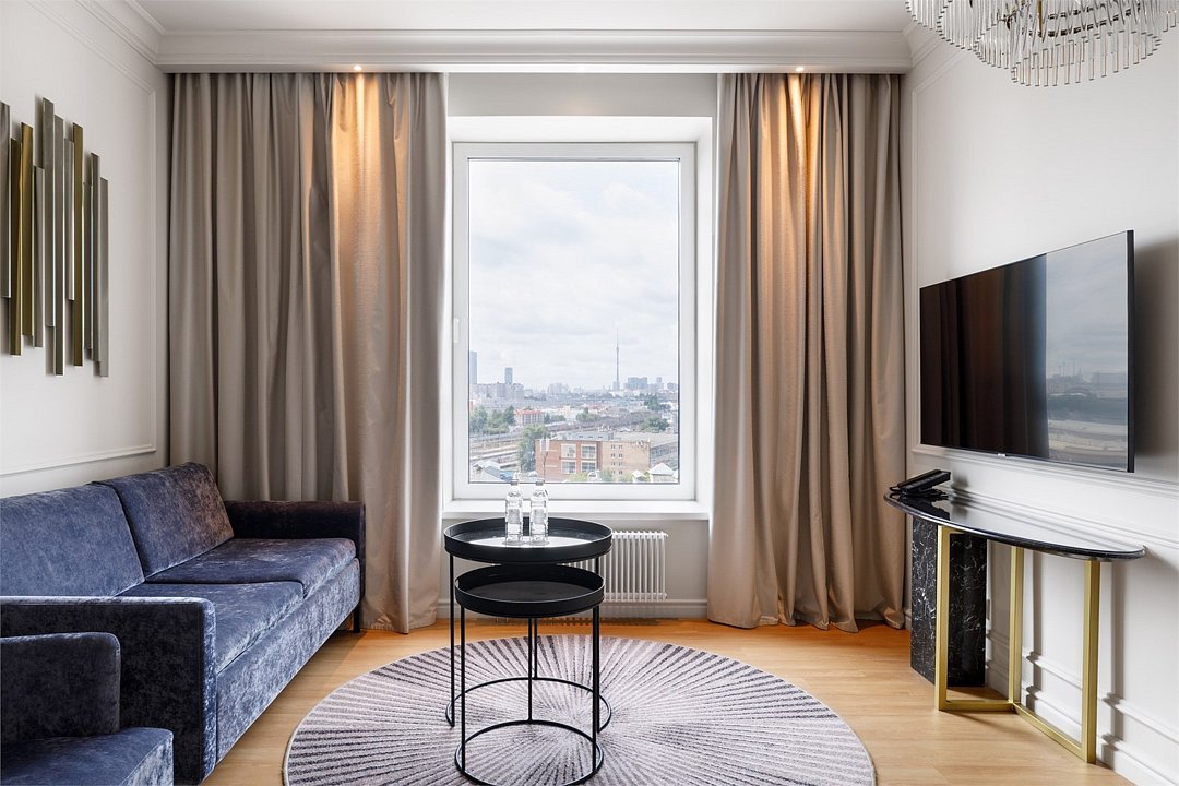 Просторный номер площадью 70 кв. м. поражает своим великолепным дизайном, продуманной планировкой и панорамными видами на столицу. В этом уникальном пространстве вас ждут две отдельные спальни, каждая из которых оформлена в современном стиле с элементами роскоши. Одна спальня оснащена 1 кроватью (160х200), вторая - 1 кроватью (180х200). Мягкие пастельные тона, высококачественные материалы и утонченные детали создают атмосферу спокойствия и уюта. Здесь вы найдете всё для полноценного отдыха и расслабления. Гостиная – сердце нашего Люкса. Просторный раскладной диван приглашает к отдыху после насыщенного дня, а удобное место для работы позволяет оставаться продуктивным даже вдали от офиса. Зеркальный журнальный столик и дополнительные места для гостей делают гостиную идеальной для проведения встреч и общения. В номере предусмотрен вместительный шкаф для одежды, где найдется место для всех ваших вещей. Капсульная кофе-машина позволит вам наслаждаться ароматным кофе в любое время суток, создавая уютную атмосферу домашнего уюта. Погрузитесь в мир абсолютного релакса и наслаждения в наших роскошных ванных комнатах, каждая из которых оснащена тропическим душем и системой тёплого пола. Эти продуманные детали обеспечат вам максимальный комфорт и истинное удовольствие от водных процедур, превращая каждое посещение ванной комнаты в мини-спа ритуал. Для вашего удобства и гармонии во время проживания, мы предоставляем мягкие махровые халаты и косметические принадлежности премиум-класса. Эти изысканные аксессуары, заботливо подготовленные нами, позволят вам почувствовать себя по-настоящему особенным и окружённым заботой на протяжении всего пребывания. И, конечно же, панорамные виды на Москву станут настоящим украшением вашего пребывания. С высоты нашего люкса открываются завораживающие пейзажи столицы, которые будут радовать вас каждый день. Также Вы сможете воспользоваться услугами фитнес-центра и бесплатным WI-FI. Обратите внимание, что фотосессия в общественных зонах отеля предоставляется за дополнительную плату. Для уточнения деталей, пожалуйста, свяжитесь с отелем.Услуги и удобства