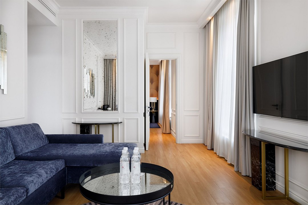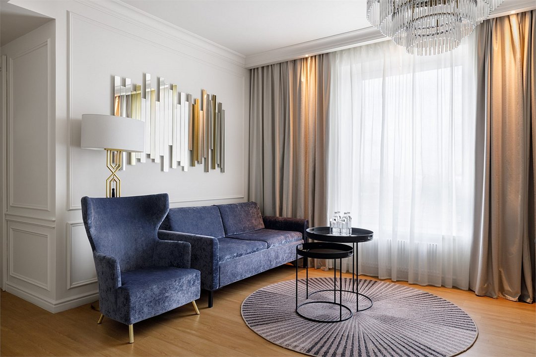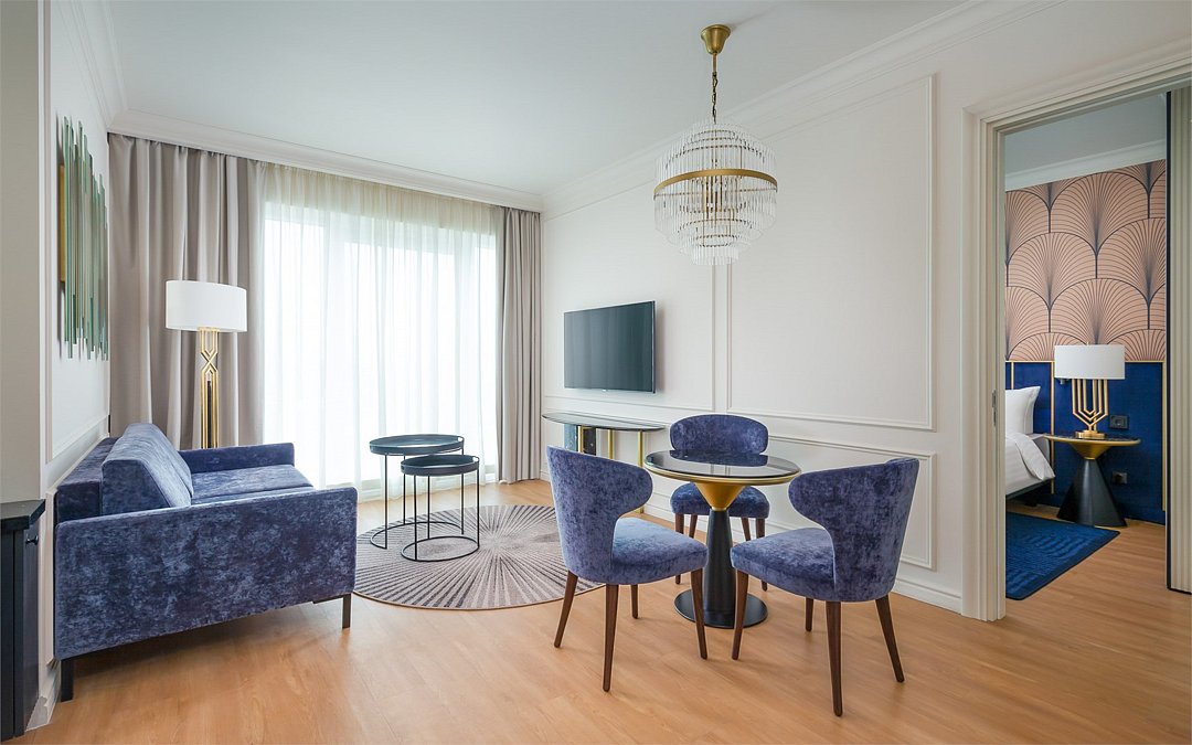 Этот просторный номер включает отдельную гостиную и спальню, предоставляя вам больше пространства для отдыха и работы. В спальне вас ждет великолепная кровать (180х200) с мягким изголовьем и прикроватным освещением, создающим уютную атмосферу для вашего ночного отдыха. Гостиная оборудована удобным раскладным диваном, журнальным зеркальным столиком и телевизором со спутниковым вещанием, что делает её идеальным местом для расслабления или проведения деловых встреч. Капсульная кофе-машина позволит вам наслаждаться свежеприготовленным кофе в любое время дня. Ванная комната с тропическим душем и теплым полом обеспечит вам максимальный комфорт и удовольствие от водных процедур. Махровый халат и косметические принадлежности премиум-класса добавят нотку роскоши вашему пребыванию. Также Вы сможете воспользоваться услугами фитнес-центра и бесплатным WI-FI. Обратите внимание, что фотосессия в общественных зонах отеля предоставляется за дополнительную плату. Для уточнения деталей, пожалуйста, свяжитесь с отелем.Услуги и удобства