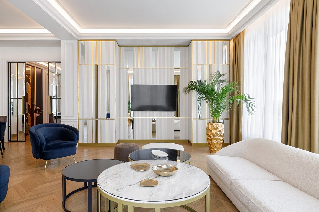 Wi-Fi, интернет, телефон, кондиционер, светильник, фен, будильник, электронные замки, кофемашина, утюг, душевая кабина, теплый пол, халаты, банные полотенца, тапочки, гигиенические средства, косметические средства, гладильная доска, кресла, тумбы, стулья, шкаф для одежды, гардеробная, вешалки, журнальный столик, багажная тумба, зеркало, пуфики, мебельный гарнитур, обслуживание номеров, сейф, раковина, мягкая мебель, косметическое зеркало, питьевая вода, гостиная зона, отопление, вид на город, кресло, две спальни, ламинат, две кровати «King size», стаканы, туалетный столик, две ванные комнаты, стол, туалетный столик, туалетные средства, сплит-система, раскладной диван, внутренний телефон, телевизор с плоским экраном, гостиничная парфюмерия, номер для некурящих, пуфик, три телевизора, набор для приготовления чая и кофе, мини-бар (платно), можно с питомцами, лежанка, мискаВ гостиничном номере