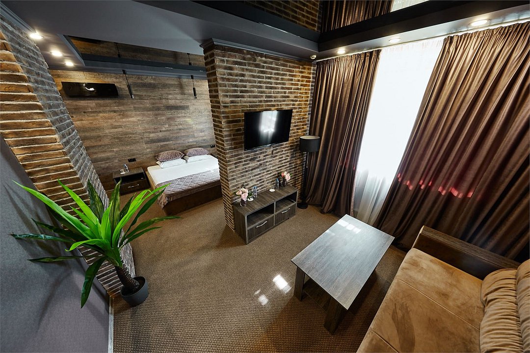 Номер площадью 44 м², элегантный современный номер, с двумя пространствами, отделёнными перегородкой, спальня с широкой кроватью и гостиная зона с диваном и ванной комнатой.Услуги и удобства