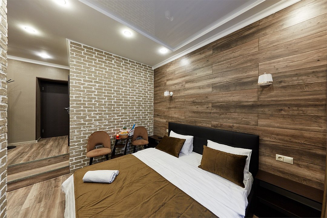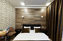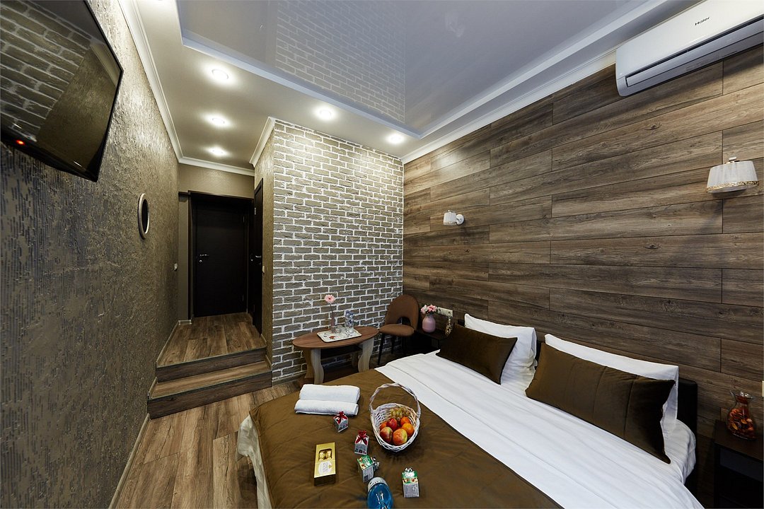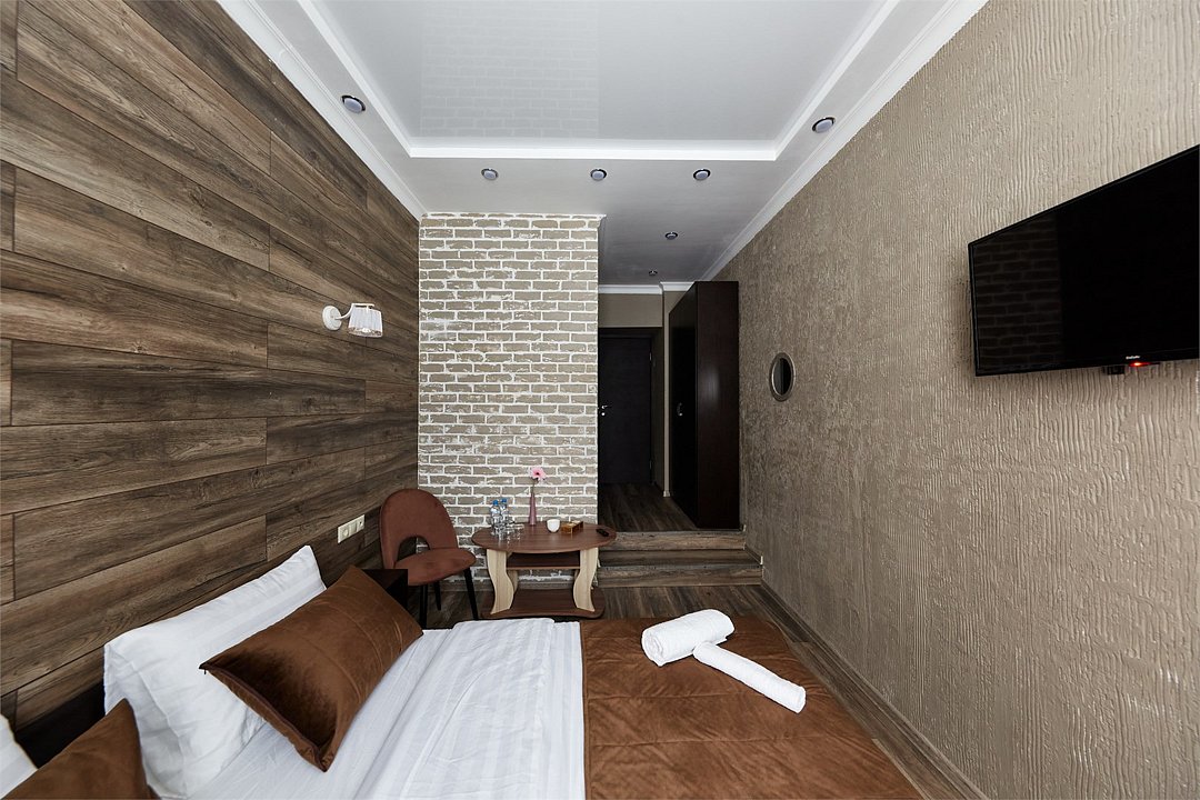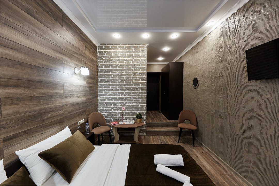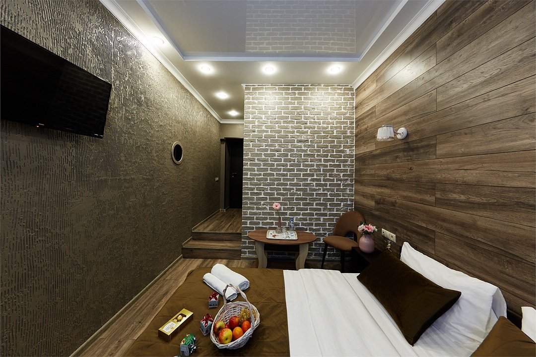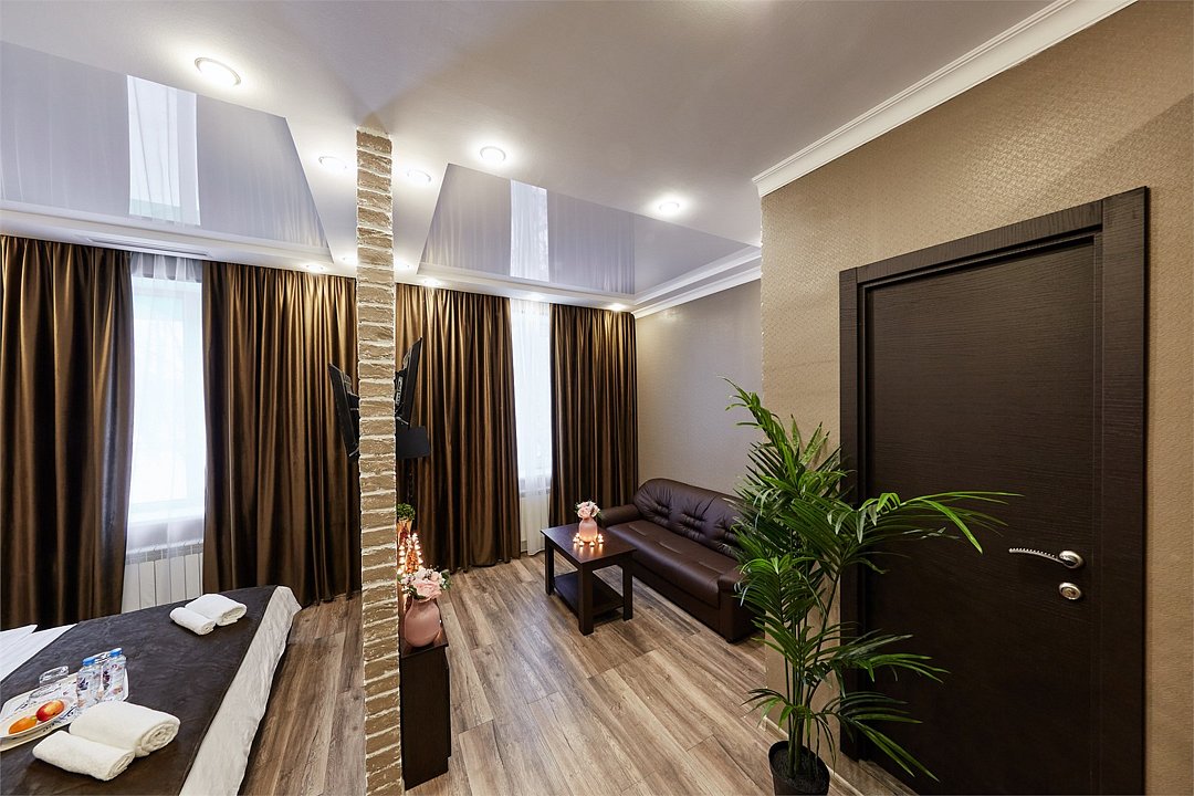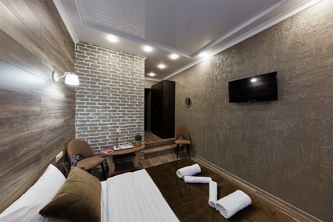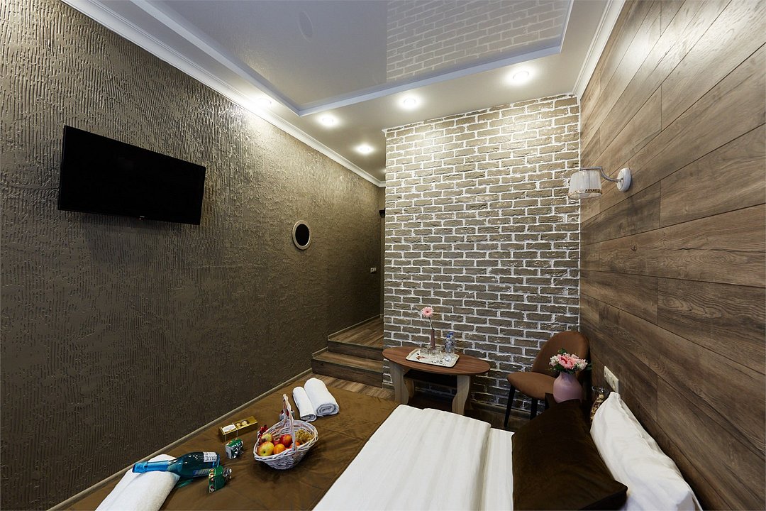 Большое пространство комнаты разделено перегородкой на гостинную и спальню. В номере двуспальная кровать, телевизор, чайник, холодильник, санузел, утюг, фен. Есть кресла, стол и диван. В ванной комнате душевая кабина, санузел и биде. журнальный. 2 кресла. бидеУслуги и удобства