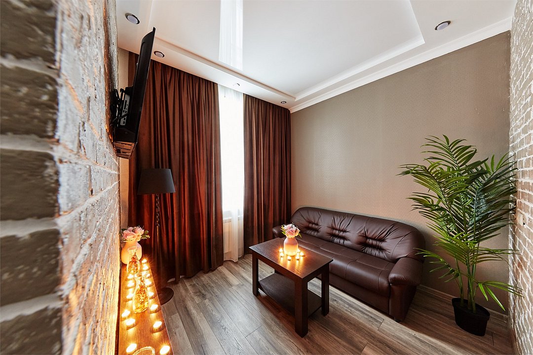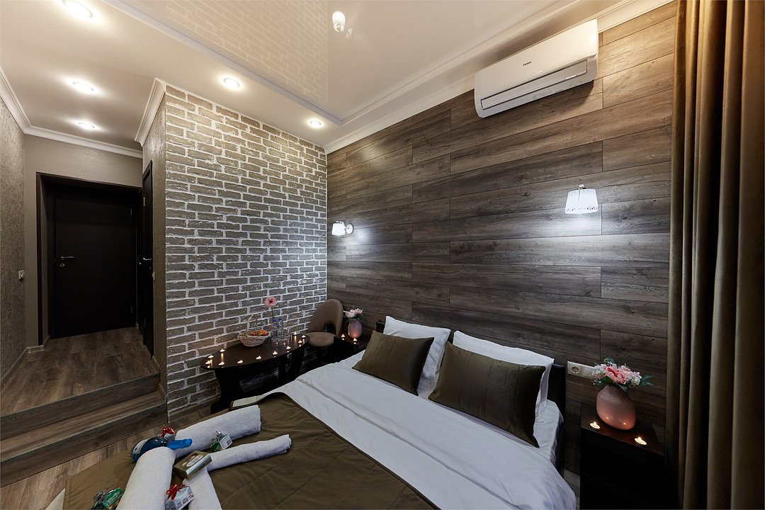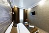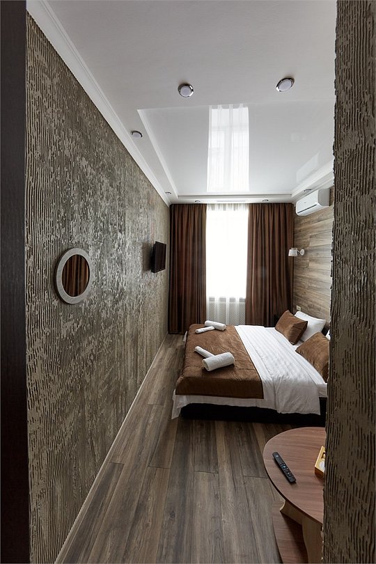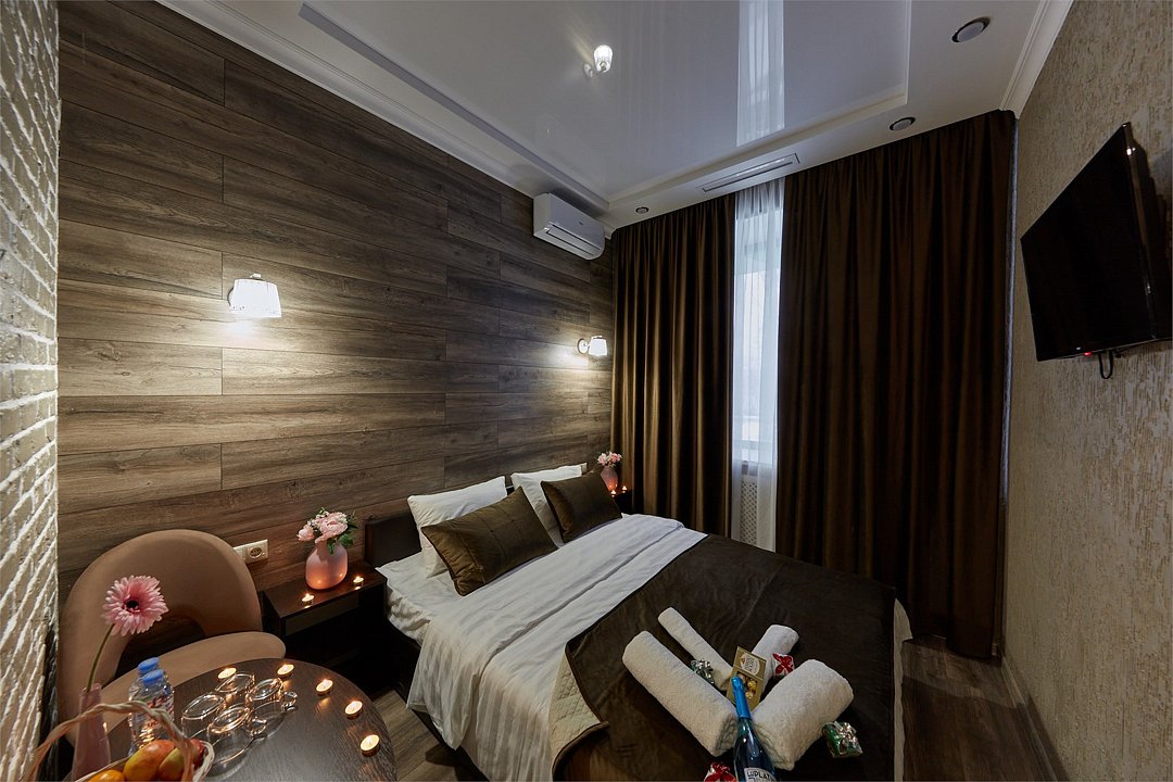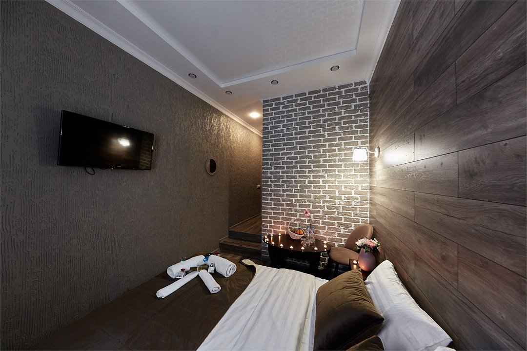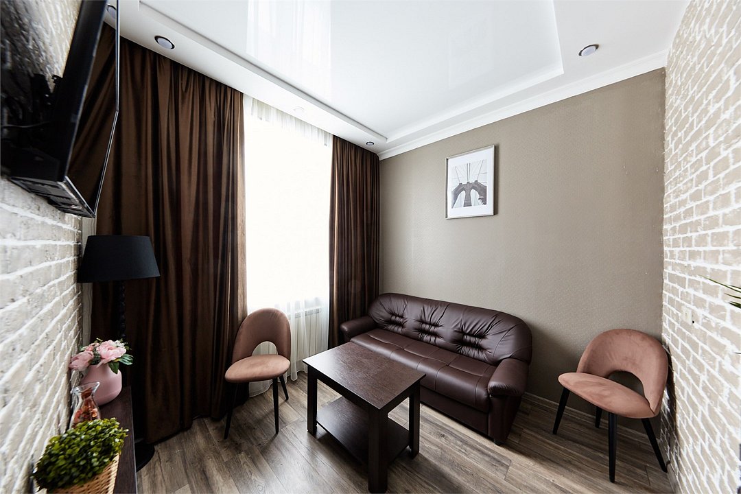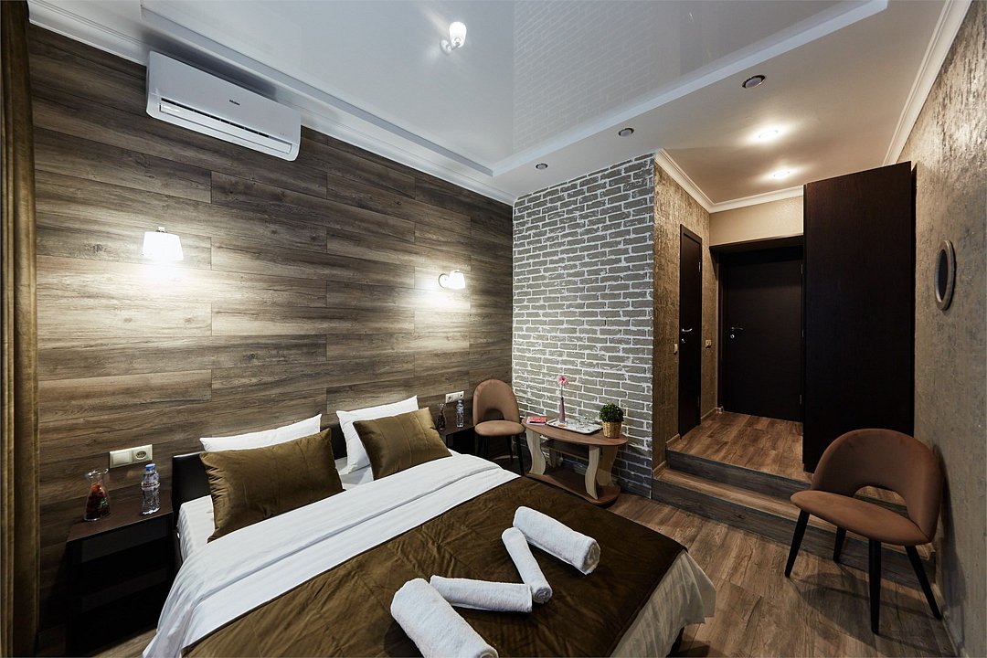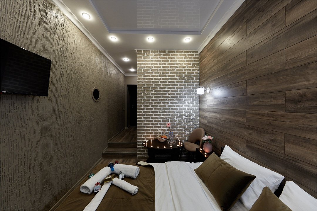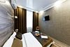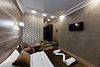 Большое пространство комнаты разделено перегородкой на гостинную и спальню. В номере двуспальная кровать, телевизор, чайник, холодильник, санузел, утюг, фен. Есть кресла, стол и диван. В ванной комнате душевая кабина, санузел и биде. журнальный. 2 кресла. бидеУслуги и удобства