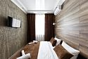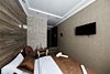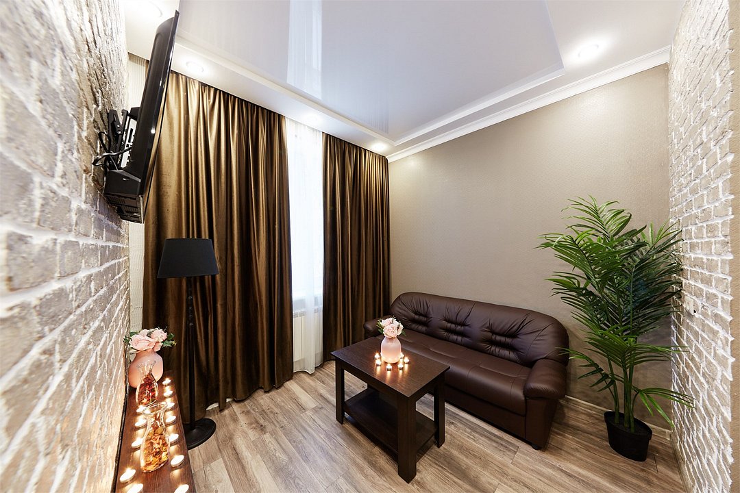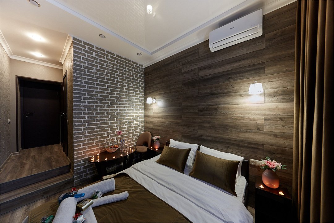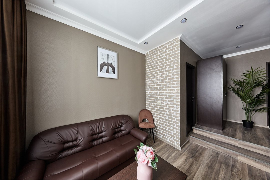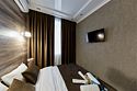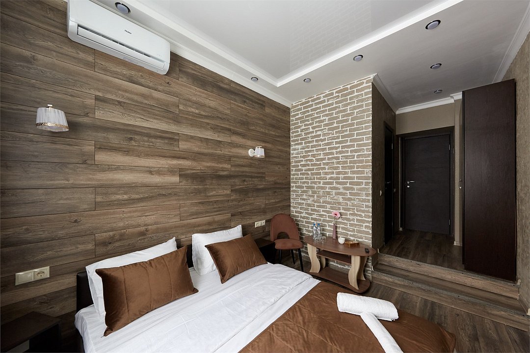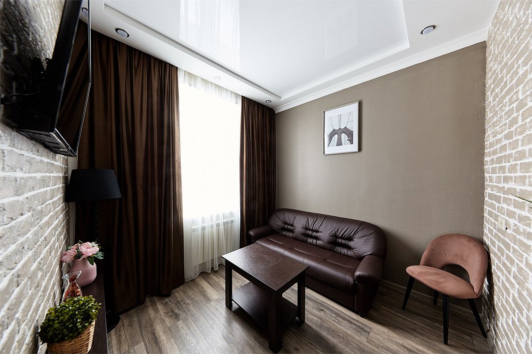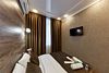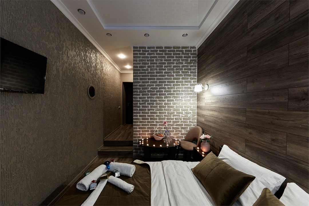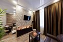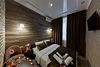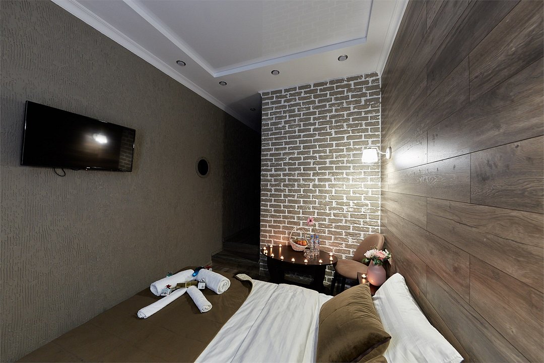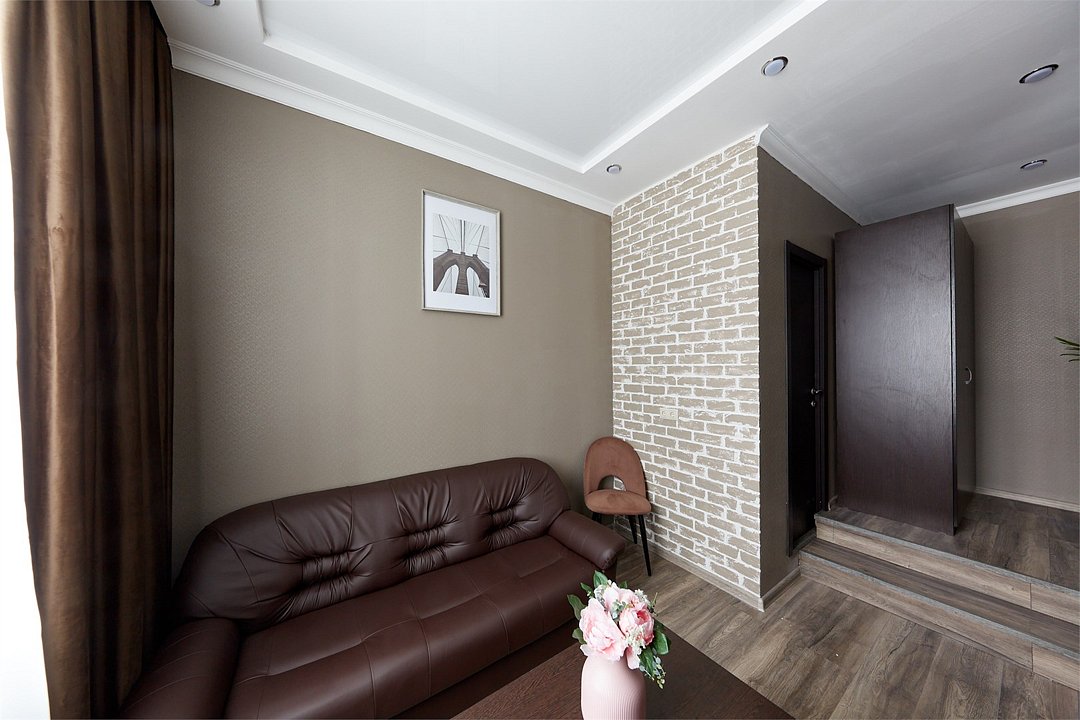 Большое пространство комнаты разделено перегородкой на гостинную и спальню. В номере двуспальная кровать, телевизор, чайник, холодильник, санузел, утюг, фен. Есть кресла, стол и диван. В ванной комнате душевая кабина, санузел и биде. журнальный. 2 кресла. бидеУслуги и удобства