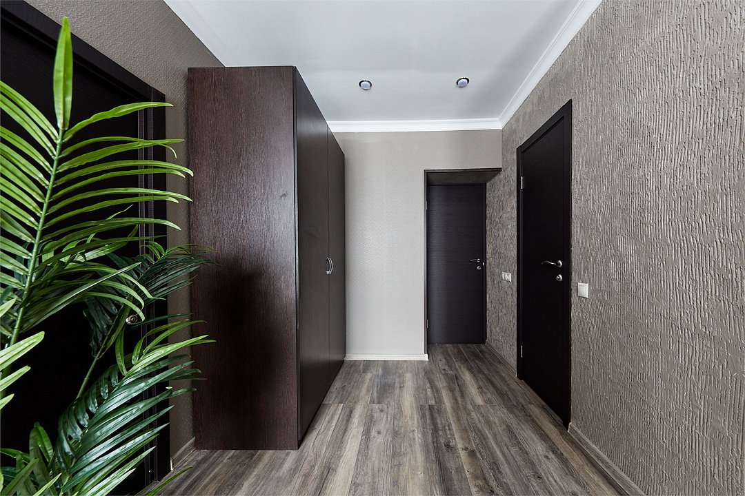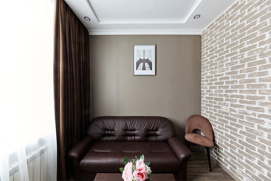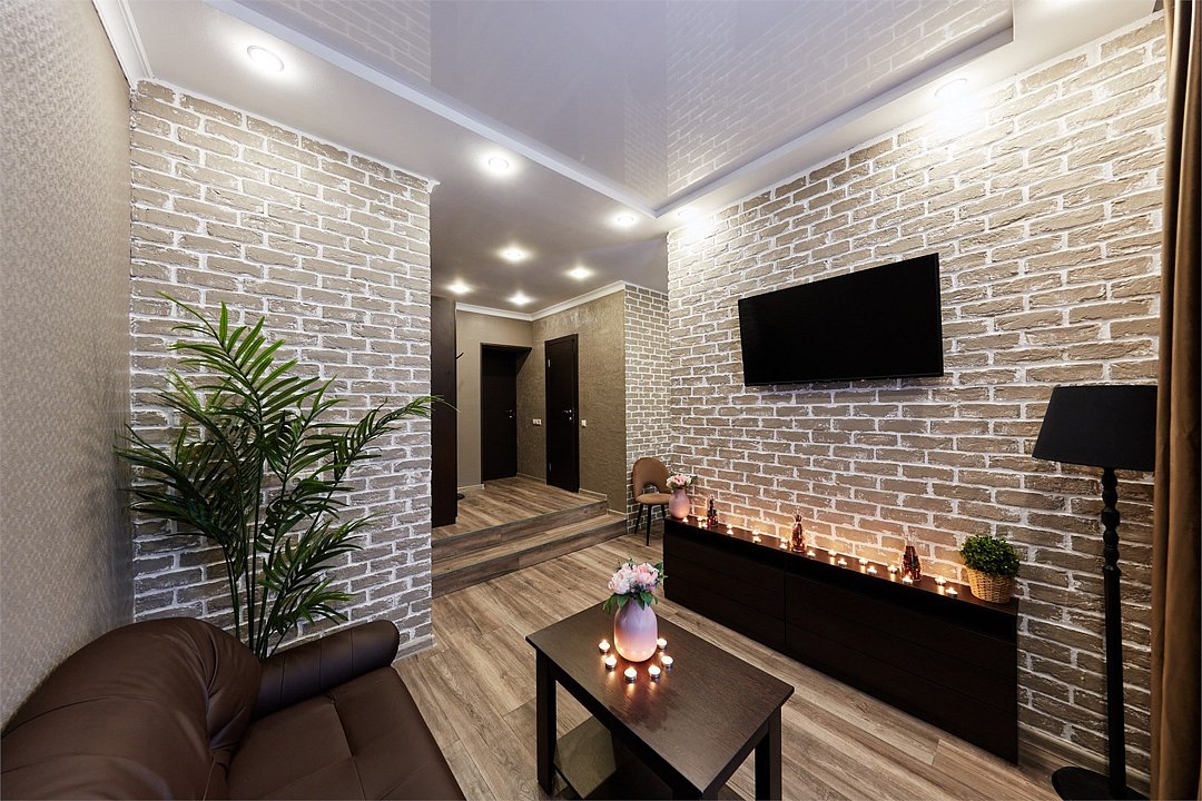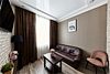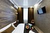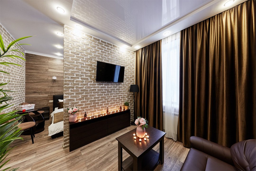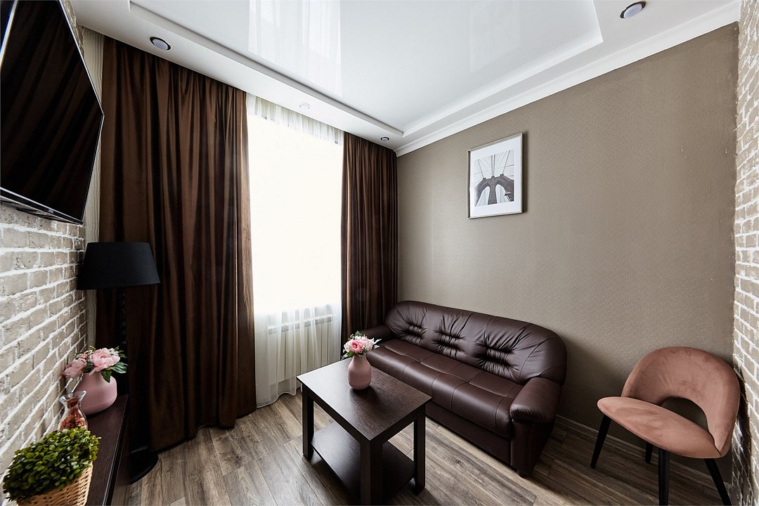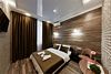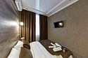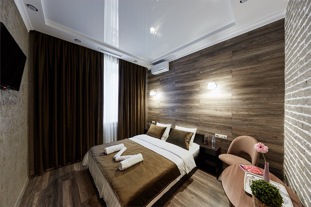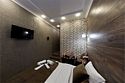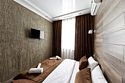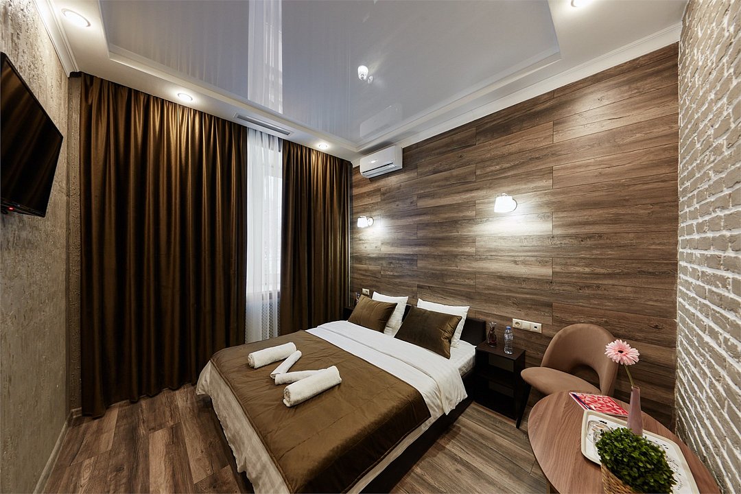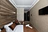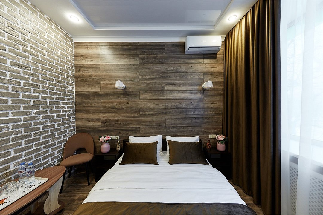 Большое пространство комнаты разделено перегородкой на гостинную и спальню. В номере двуспальная кровать, телевизор, чайник, холодильник, санузел, утюг, фен. Есть кресла, стол и диван. В ванной комнате душевая кабина, санузел и биде. журнальный. 2 кресла. бидеУслуги и удобства