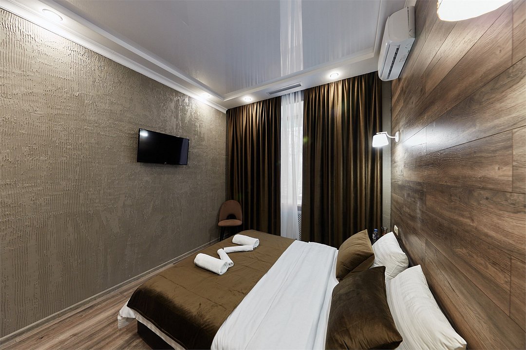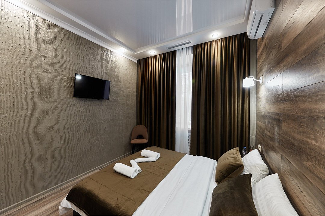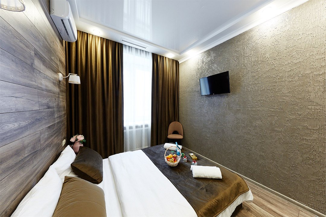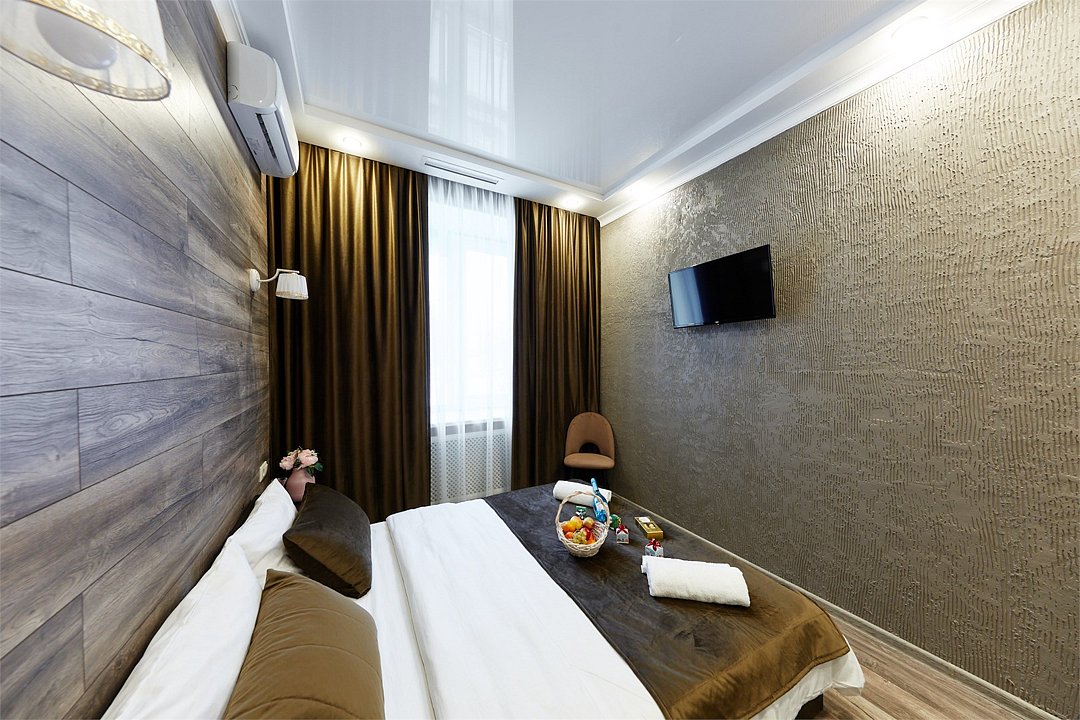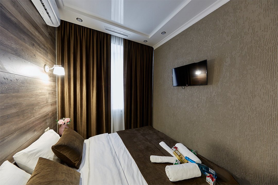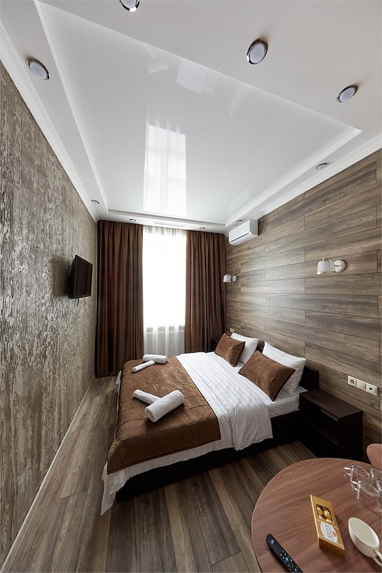 В номере двуспальная кровать, телевизор, чайник, санузел в номере, фен, утюг. Есть открытый шкаф, кресло, столик. Окна выодят во двор. В ванной комнате душевая кабинаУслуги и удобства