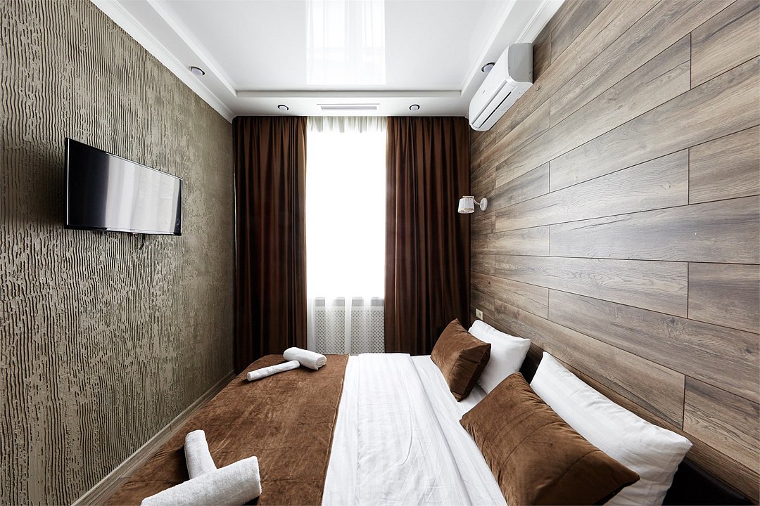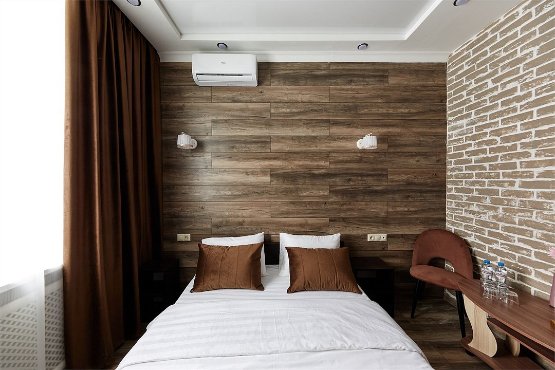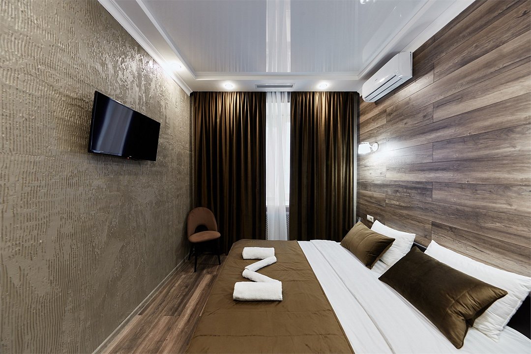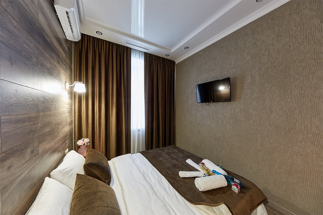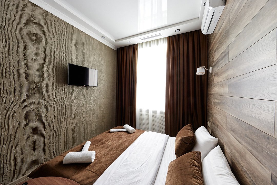 В номере двуспальная кровать, телевизор, чайник, санузел в номере, фен, утюг. Есть открытый шкаф, кресло, столик. Окна выодят во двор. В ванной комнате душевая кабинаУслуги и удобства