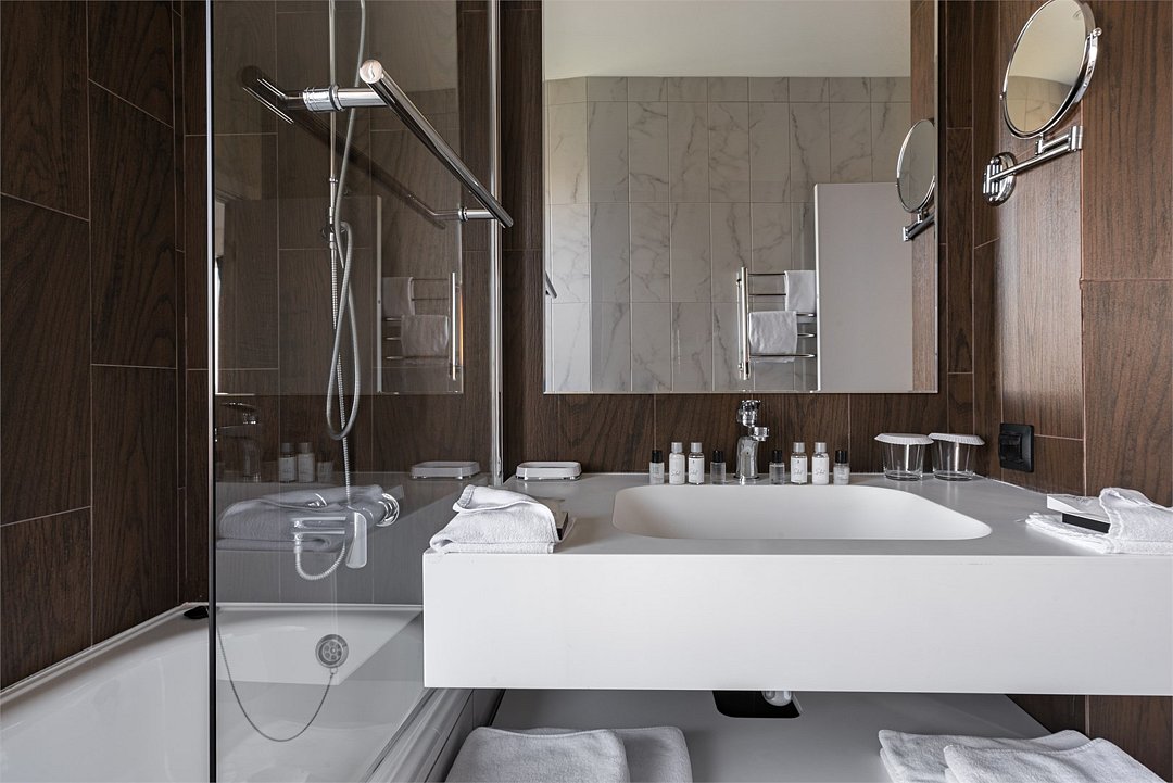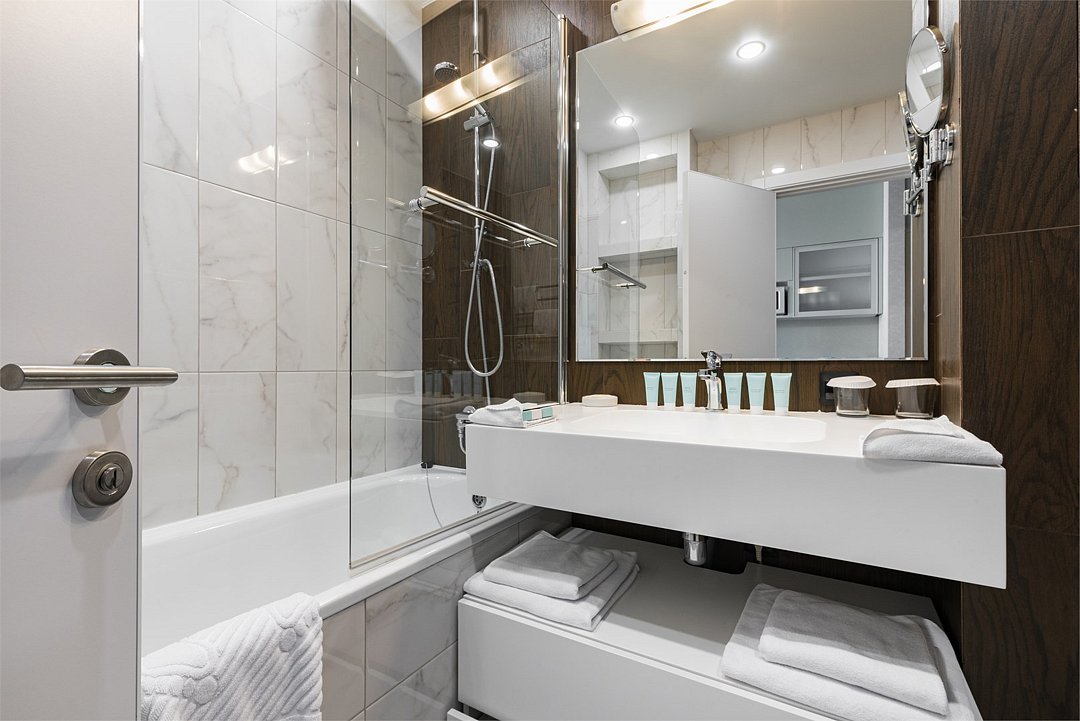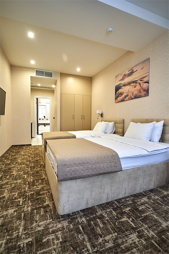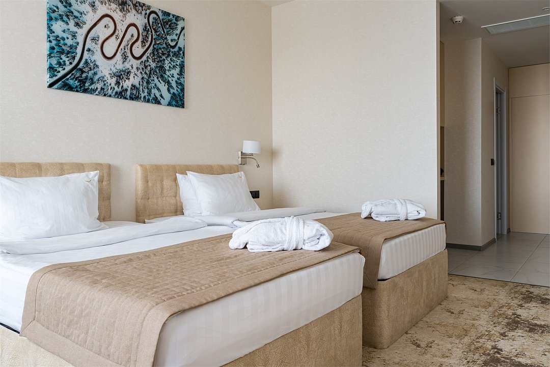 Номер «Супериор» с раздельными кроватями — просторный вариант размещения для четырёх гостей. В номере: две раздельные кровати и удобный двуспальный диван, который служит дополнительным спальным местом. Также к услугам гостей мини-кухня с техникой и посудой, ванная комната с полноценной ванной. Идеально подойдёт для семьи, друзей или коллег, ценящих комфорт и личное пространство. В данной категории имеются смежные номера. Вы можете заранее забронировать место в подземном паркинге (оплачивается отдельно). Количество мест ограничено.Услуги и удобства