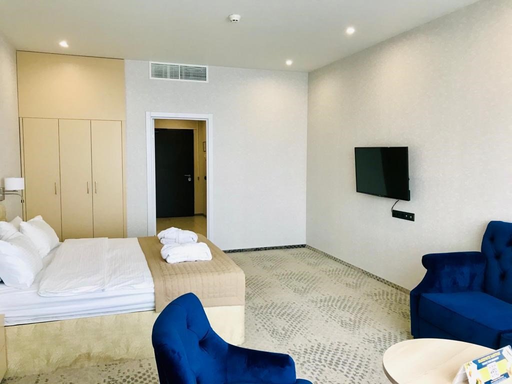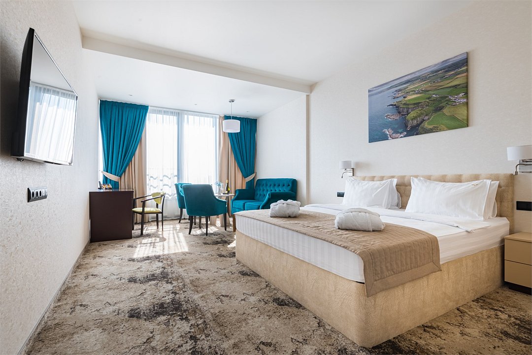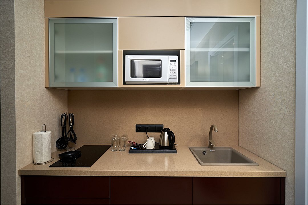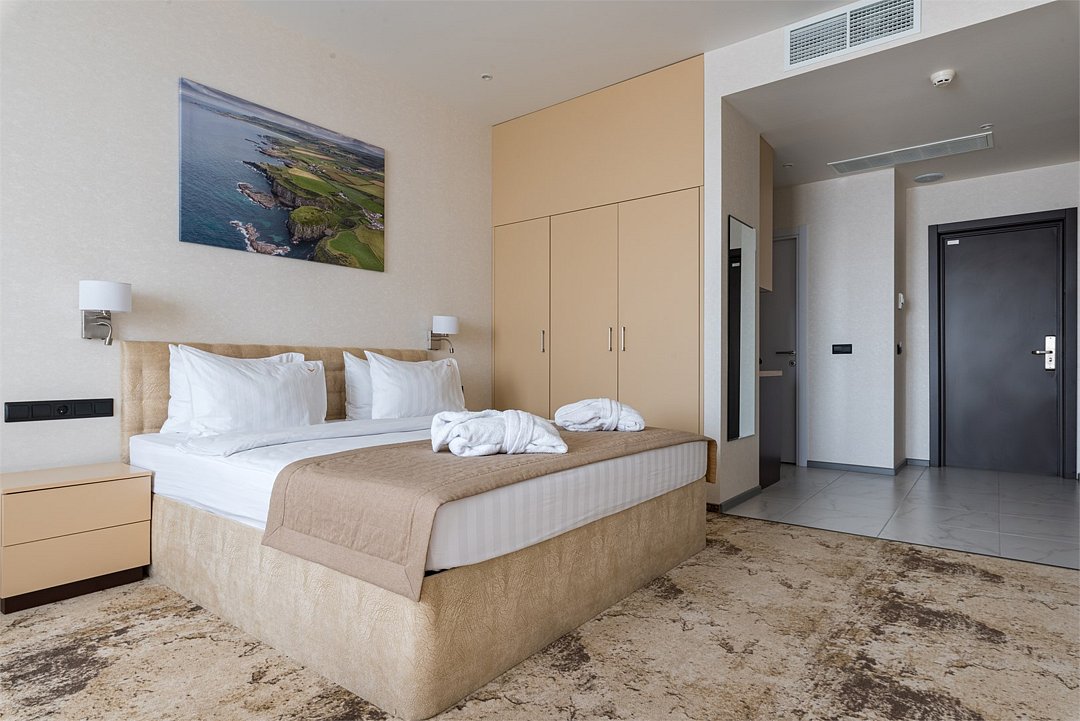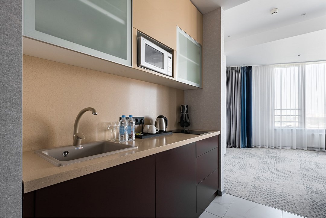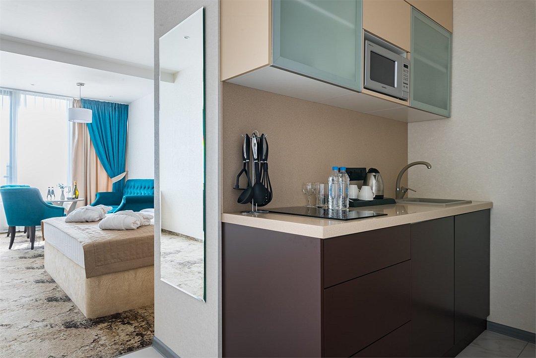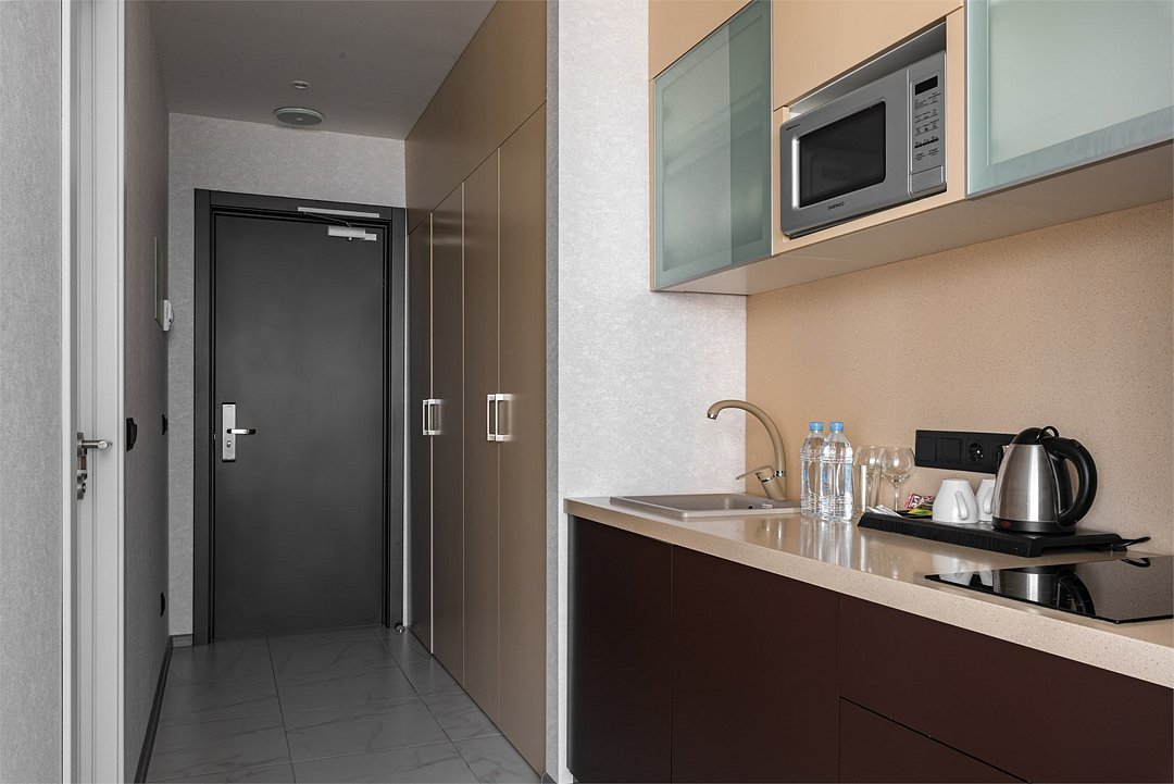 Номер категории «Сьют» — это сочетание элегантного дизайна и расширенного комфорта. Просторный номер подойдёт для семьи или компании до четырёх гостей. Здесь — двуспальная кровать, удобный двуспальный диван, полноценная зона отдыха, а также мини-кухня с техникой и посудой, где можно приготовить домашний ужин. Ванная комната с большой ванной станет приятным завершением дня. Идеальный выбор для тех, кто ценит пространство, уют и приватность — будь то отдых всей семьёй, поездка с друзьями или длительное проживание. Все номера данной категории разной планировки. Имеются смежные номера. Вы можете заранее забронировать место в подземном паркинге (оплачивается отдельно). Количество мест ограничено.Услуги и удобства