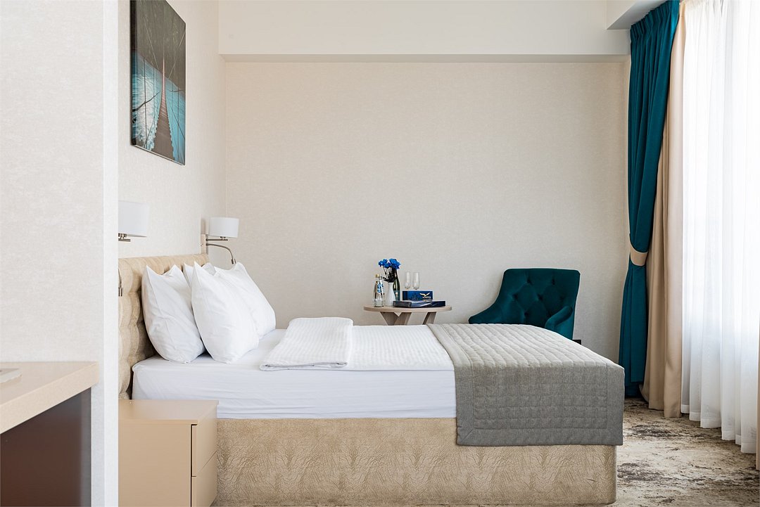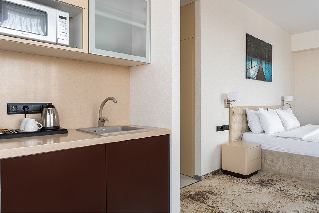 Номер категории «Комфорт» — это сочетание стиля, уюта и функциональности. Просторное помещение оснащено двуспальной кроватью, мини-кухней с необходимой техникой и посудой, зоной отдыха и ванной комнатой с полноценной ванной. Продуманные детали интерьера и спокойная атмосфера создают идеальные условия для отдыха после насыщенного дня. Подходит для размещения 1–2 гостей. ВОЗМОЖНО РАЗМЕЩЕНИЕ С РЕБЕНКОМ ДО 3-ех ЛЕТ (БЕЗ ПРЕДОСТАВЛЕНИЯ ДОП.МЕСТА) В данной категории есть смежные номера. Все номера данной категории разной планировки и разные по площади от 25 кв. м. и более. Вы можете заранее забронировать место в подземном паркинге (оплачивается отдельно). Количество мест ограничено.Услуги и удобства