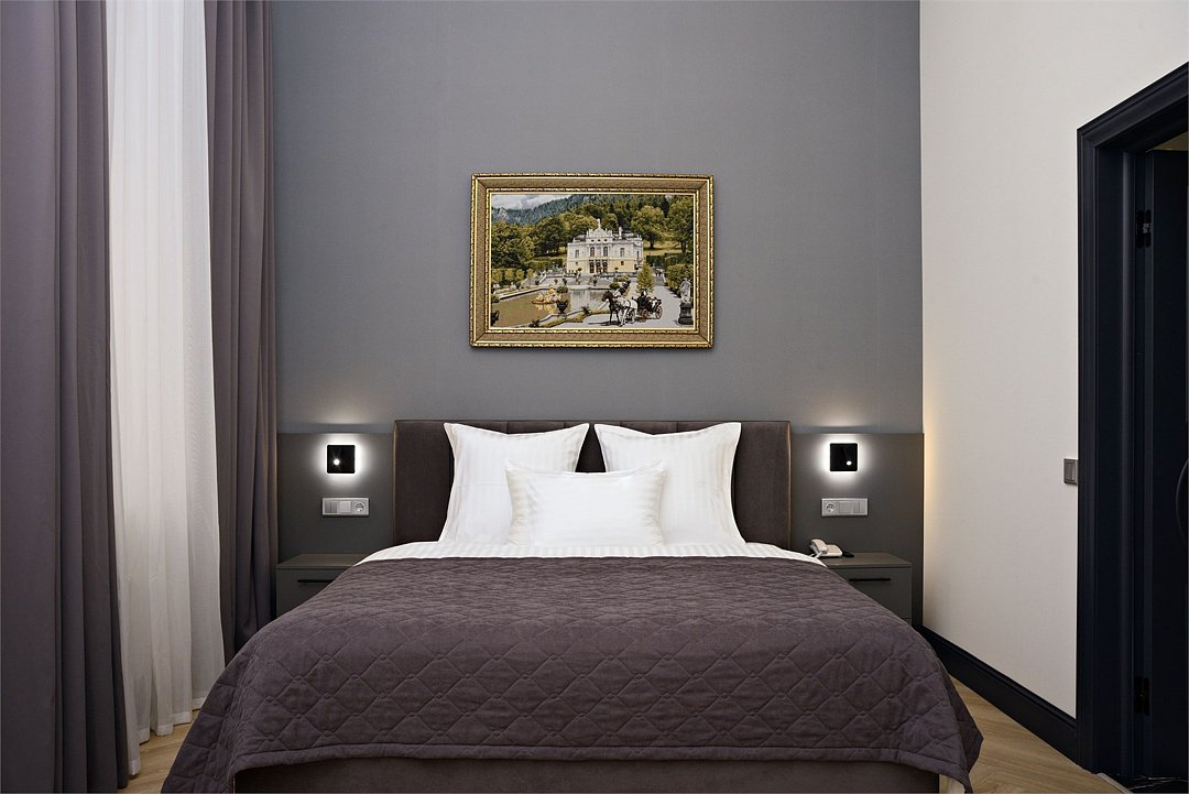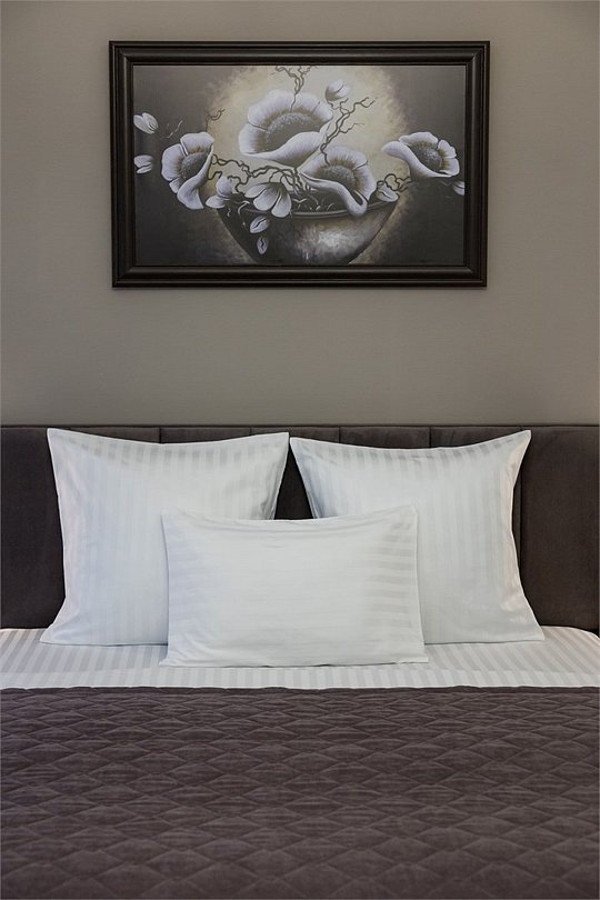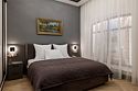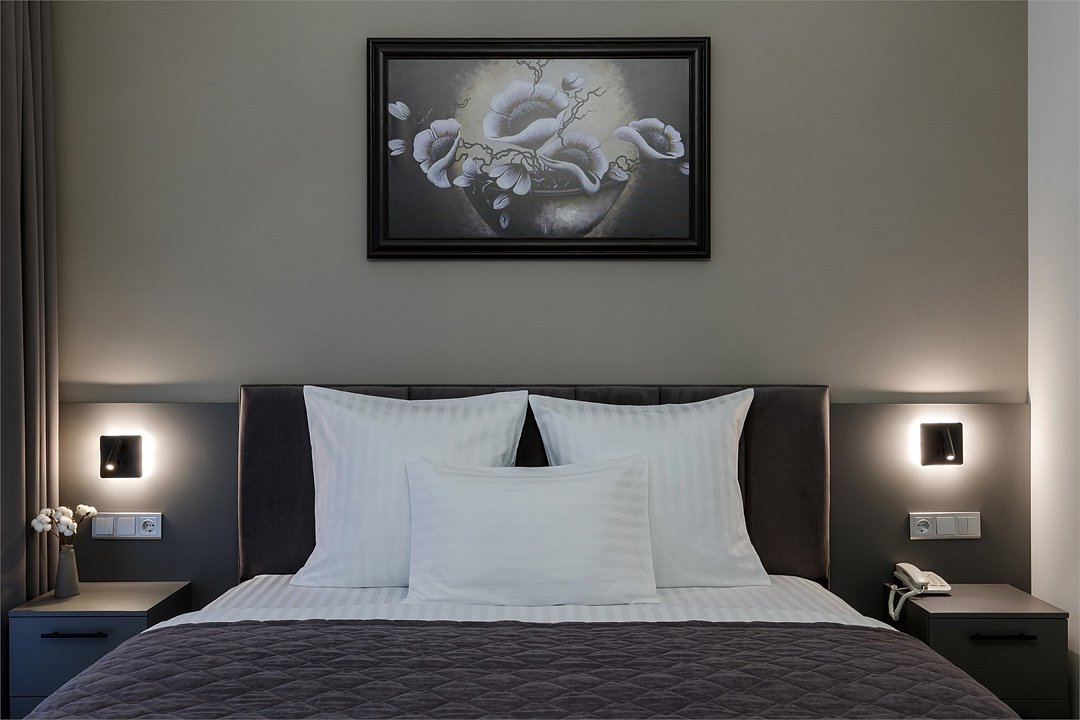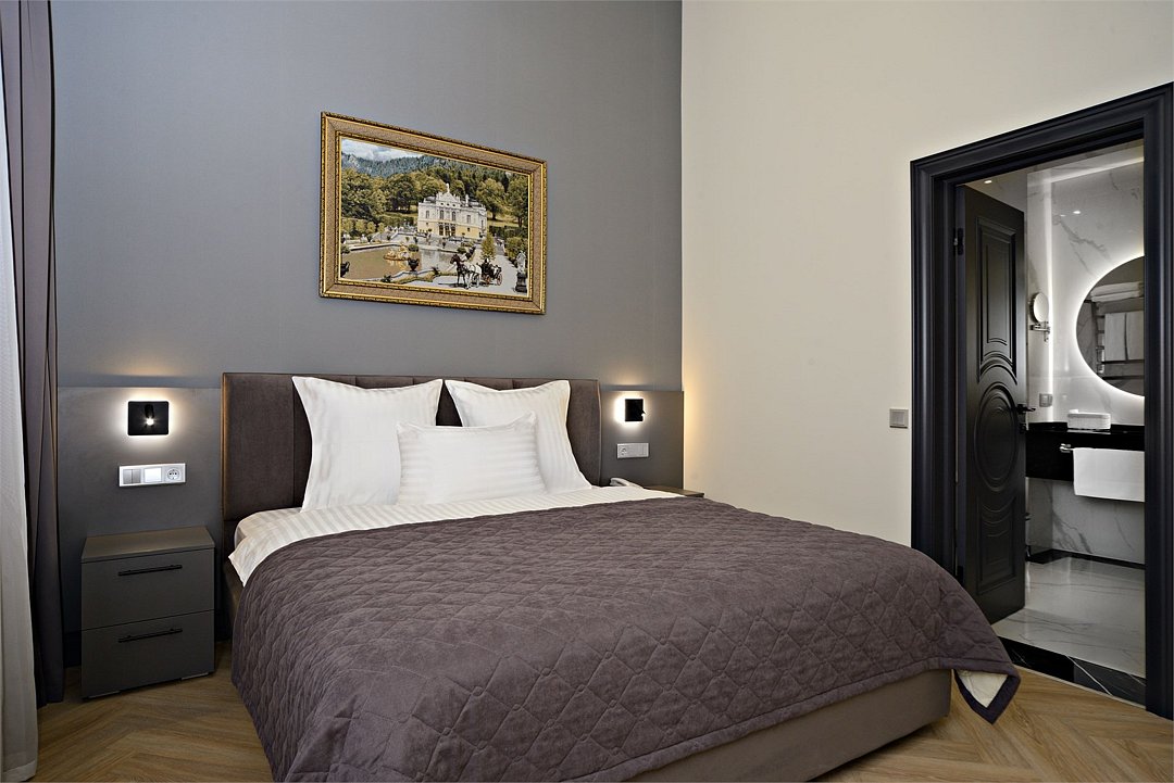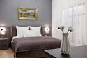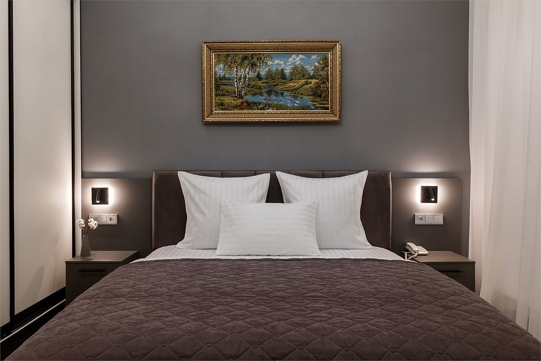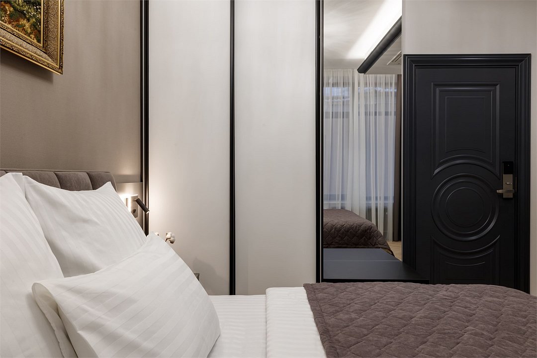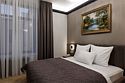 Однокомнатный номер площадью 25 кв.м. В номере: двухспальная кровать, односпальная кровать, гардероб, телевизор, кондиционер, мини-холодильник, стол, стул, электрический чайник, набор посуды, ванная комната: душ, фен, полотенца, косметические принадлежности, тапочки, халат.Услуги и удобства