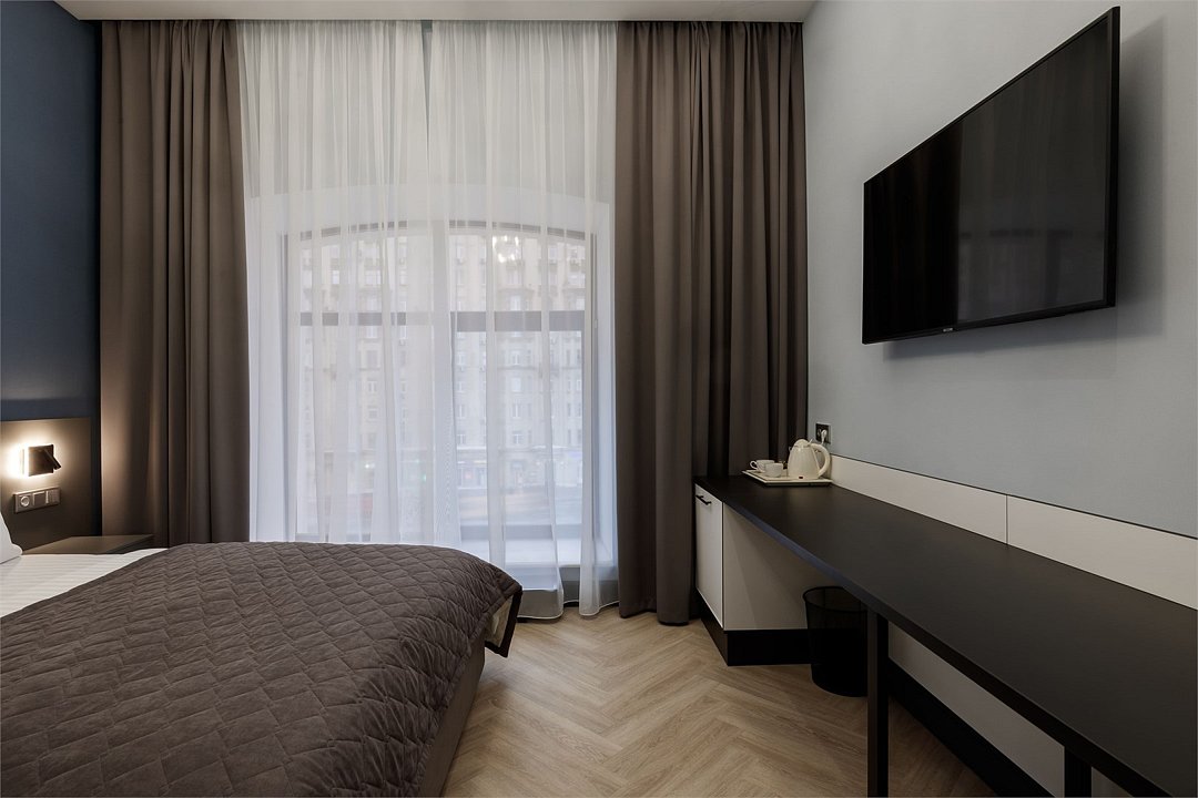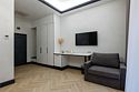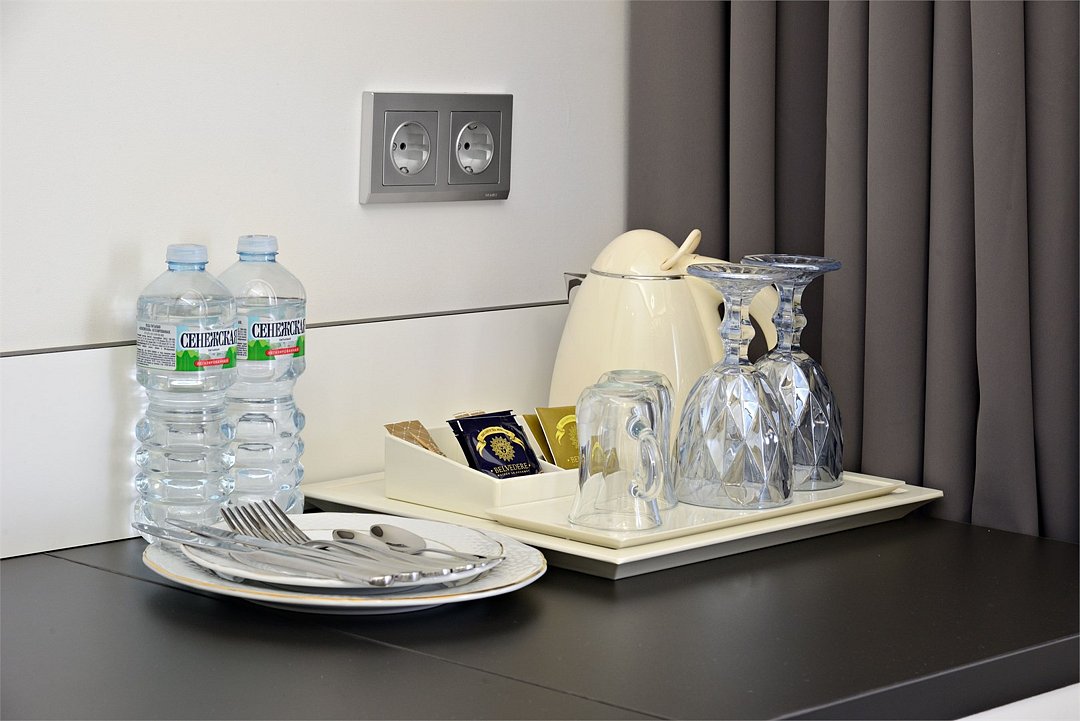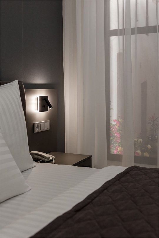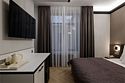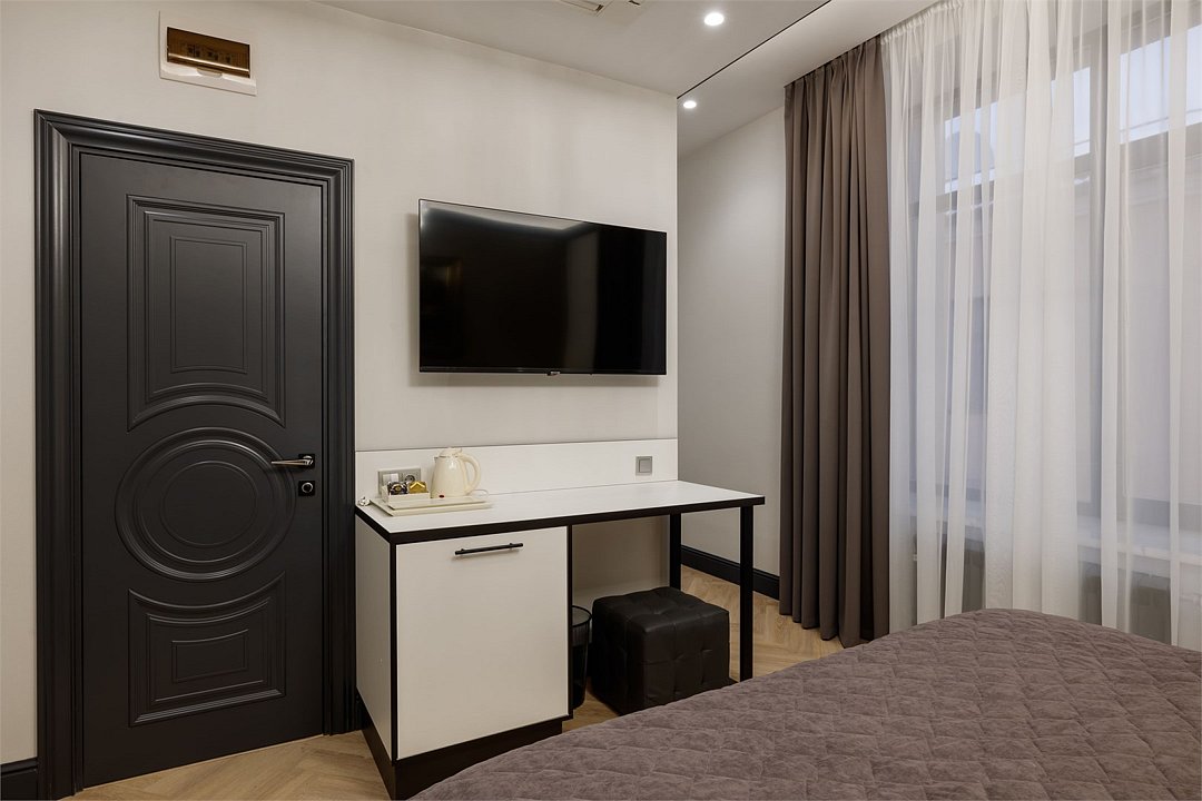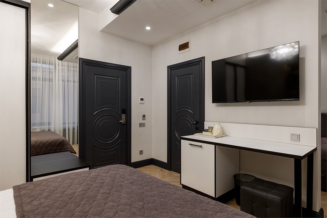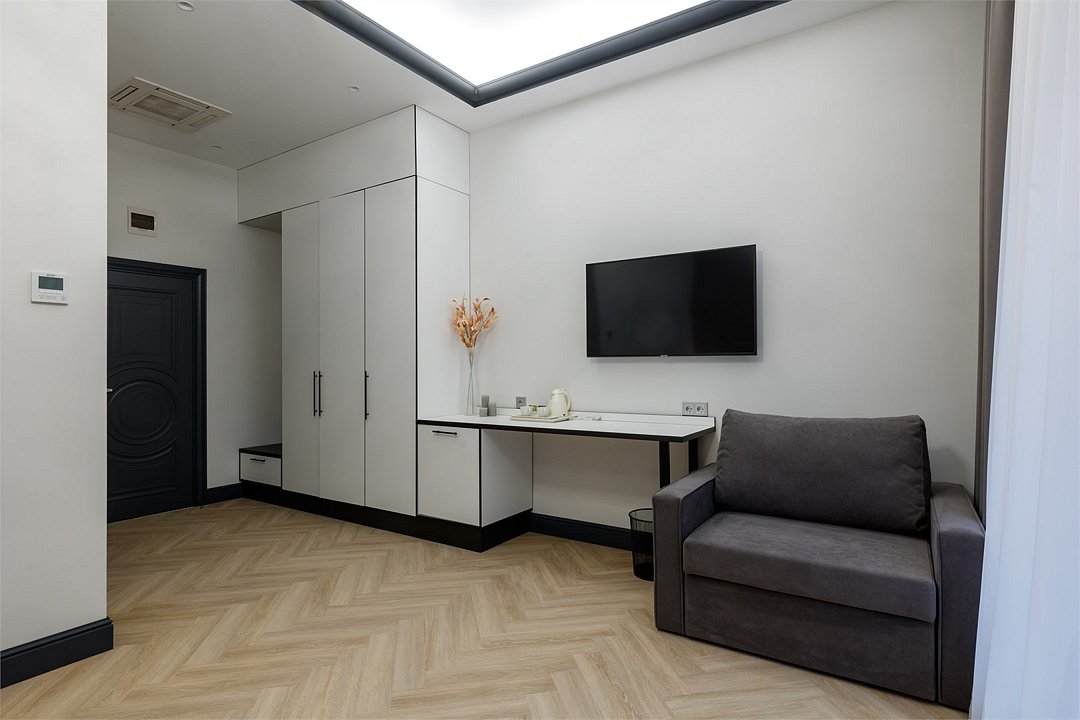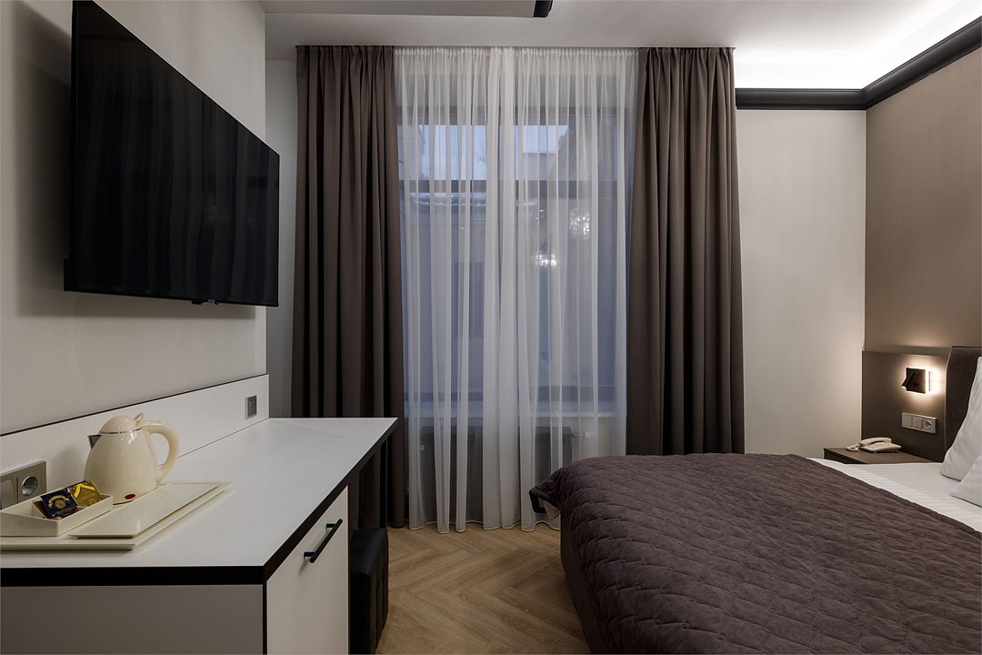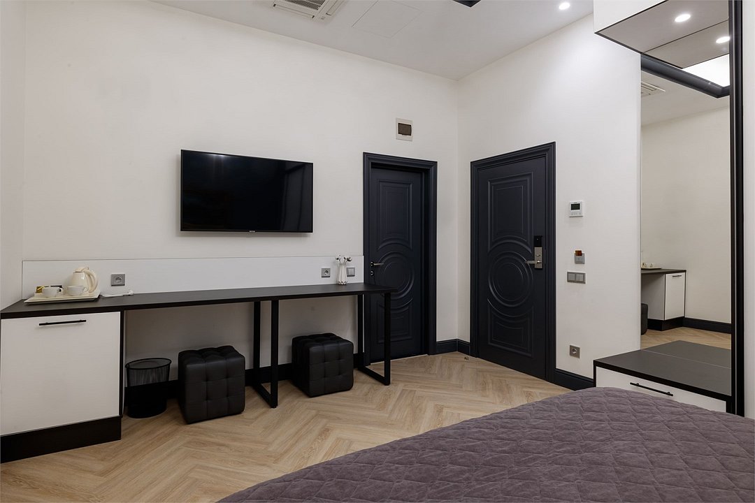 Однокомнатный просторный номер с фальш-окном (без окна), площадью 24 кв.м. В номере: двухспальная кровать, гардероб, телевизор, кондиционер, мини-холодильник, стол, стул, электрический чайник, набор посуды, ванная комната: душ, фен, полотенца, косметические принадлежности, тапочки, халат.Услуги и удобства