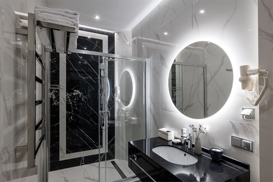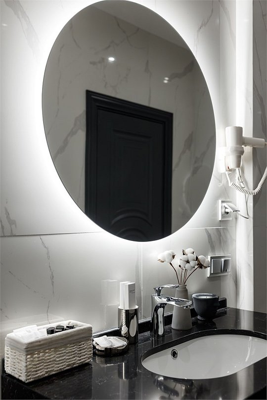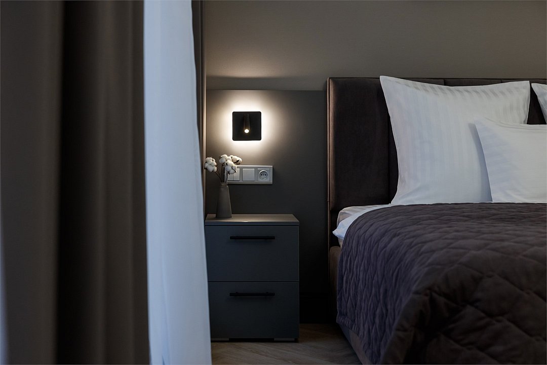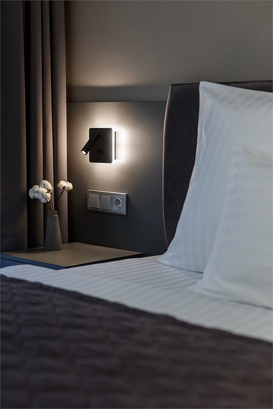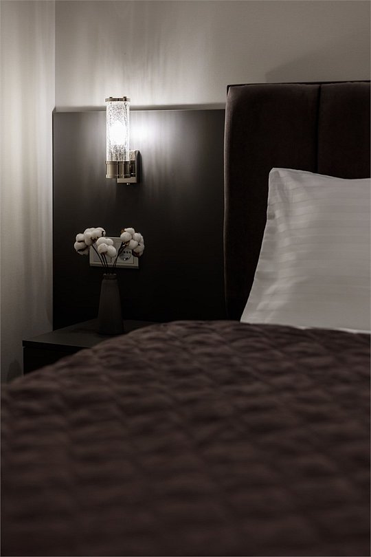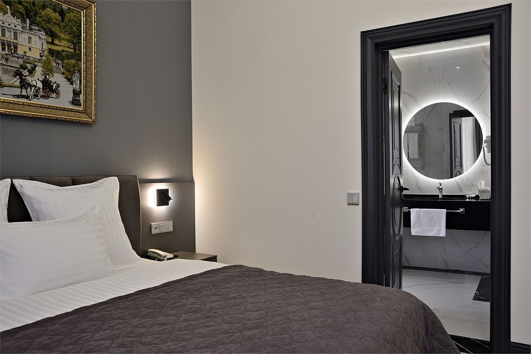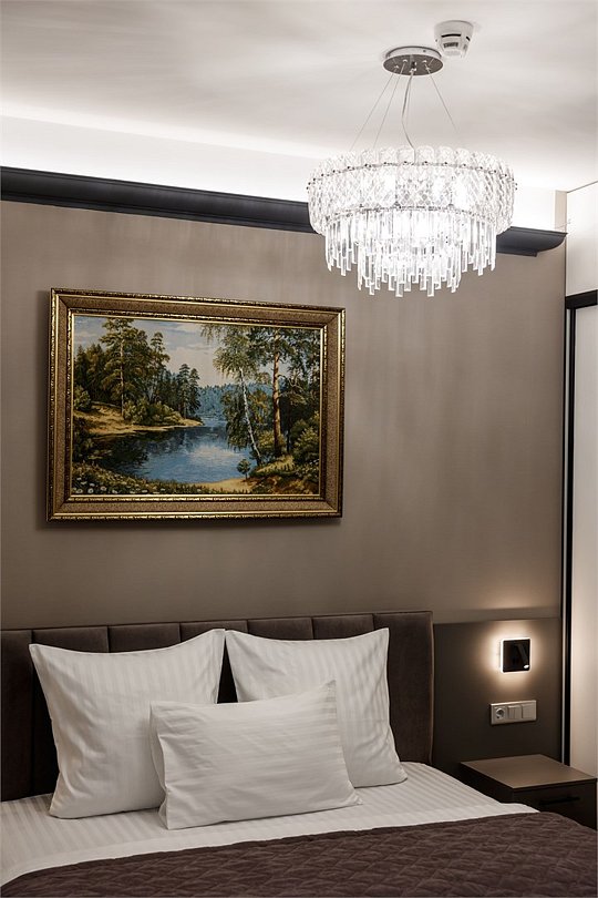 Однокомнатный номер площадью 25 кв.м. В номере: двухспальная кровать, кресло, тумба, гардероб, телевизор, кондиционер, мини-холодильник, стол, стул, электрический чайник, набор посуды, ванная комната: душ, фен, мини увеличительное зеркало, полотенца, косметические принадлежности, тапочки, халат.Услуги и удобства