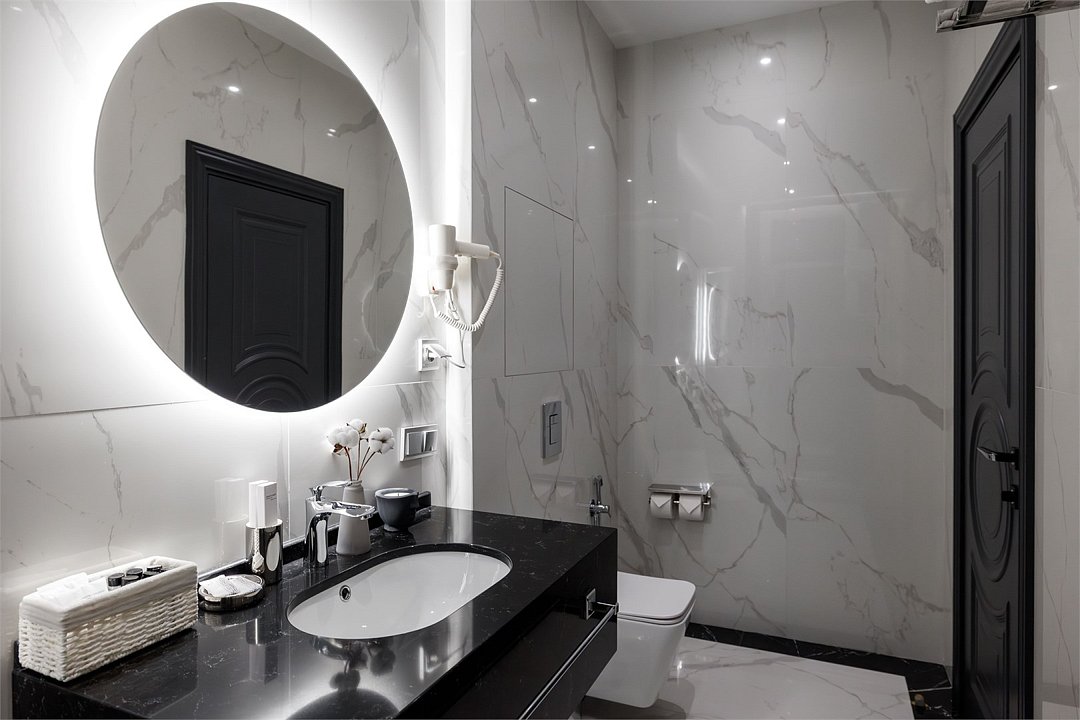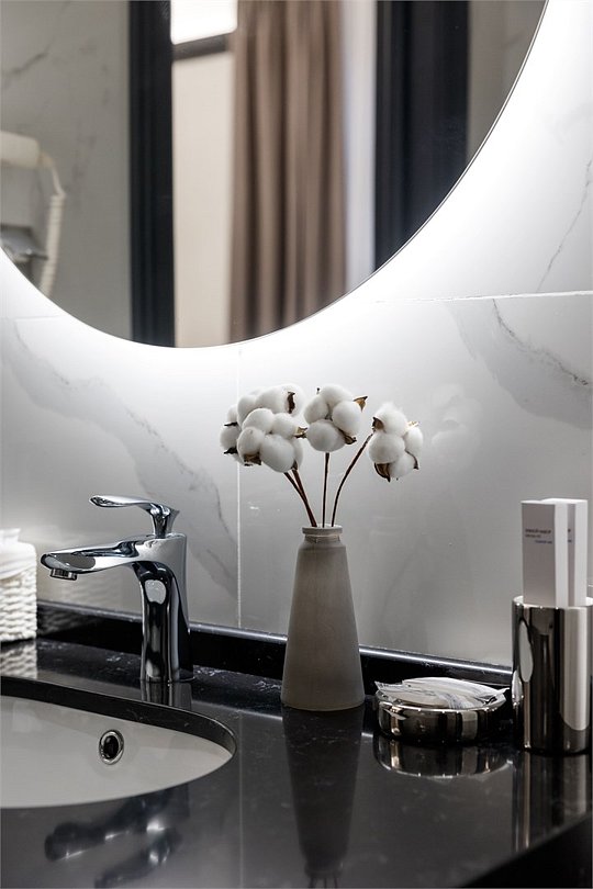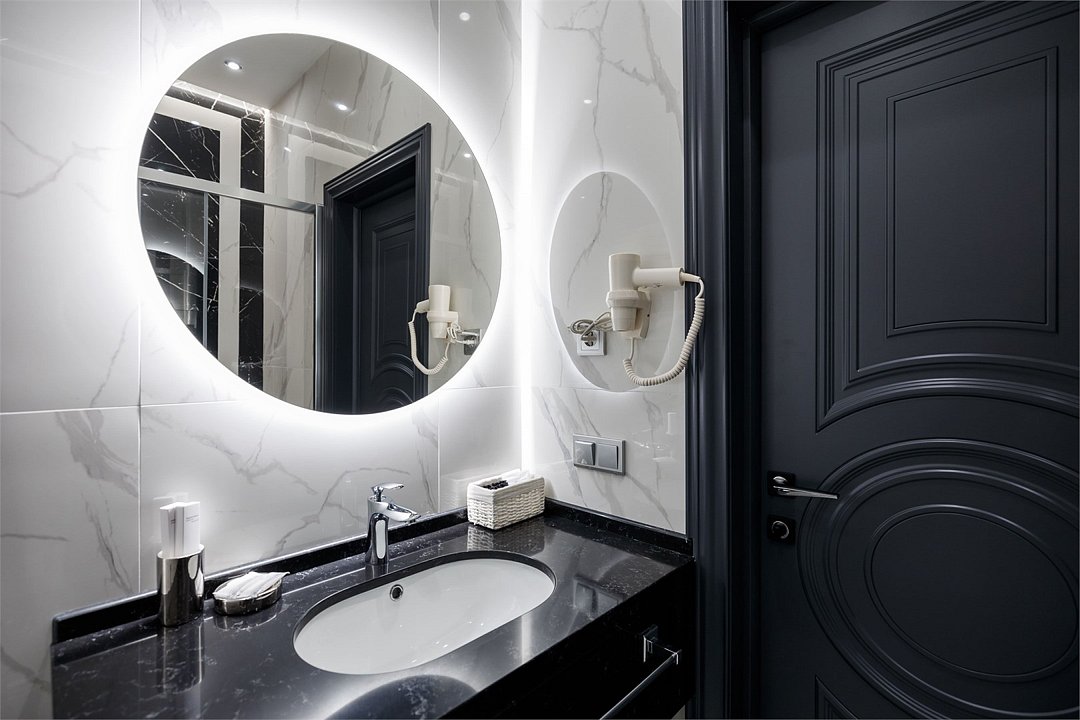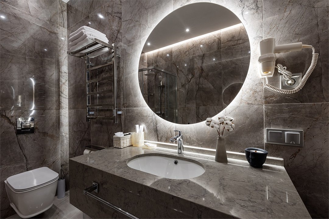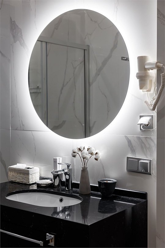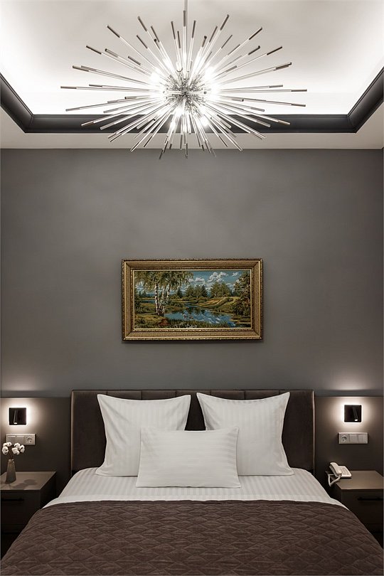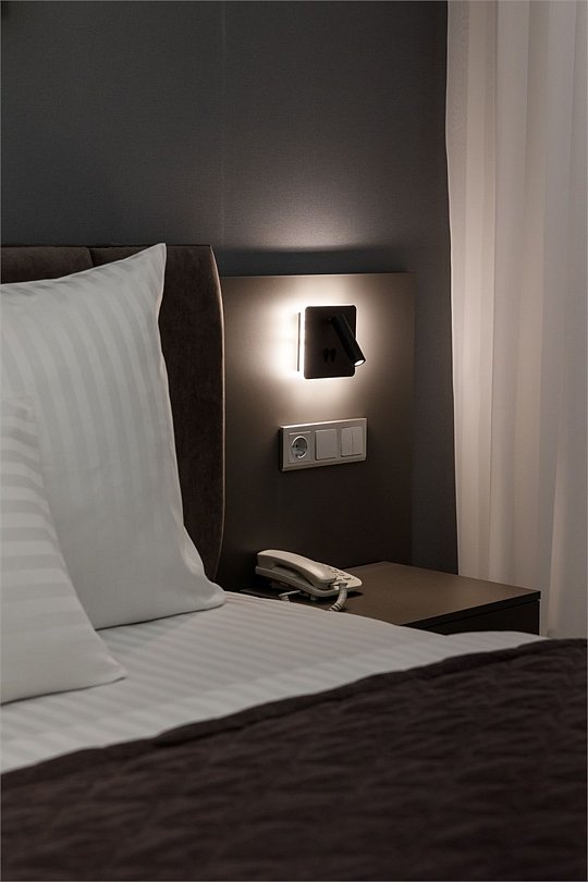 Однокомнатный номер площадью 25 кв.м. В номере: двухспальная кровать, кресло, тумба, гардероб, телевизор, кондиционер, мини-холодильник, стол, стул, электрический чайник, набор посуды, ванная комната: душ, фен, мини увеличительное зеркало, полотенца, косметические принадлежности, тапочки, халат.Услуги и удобства