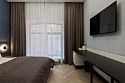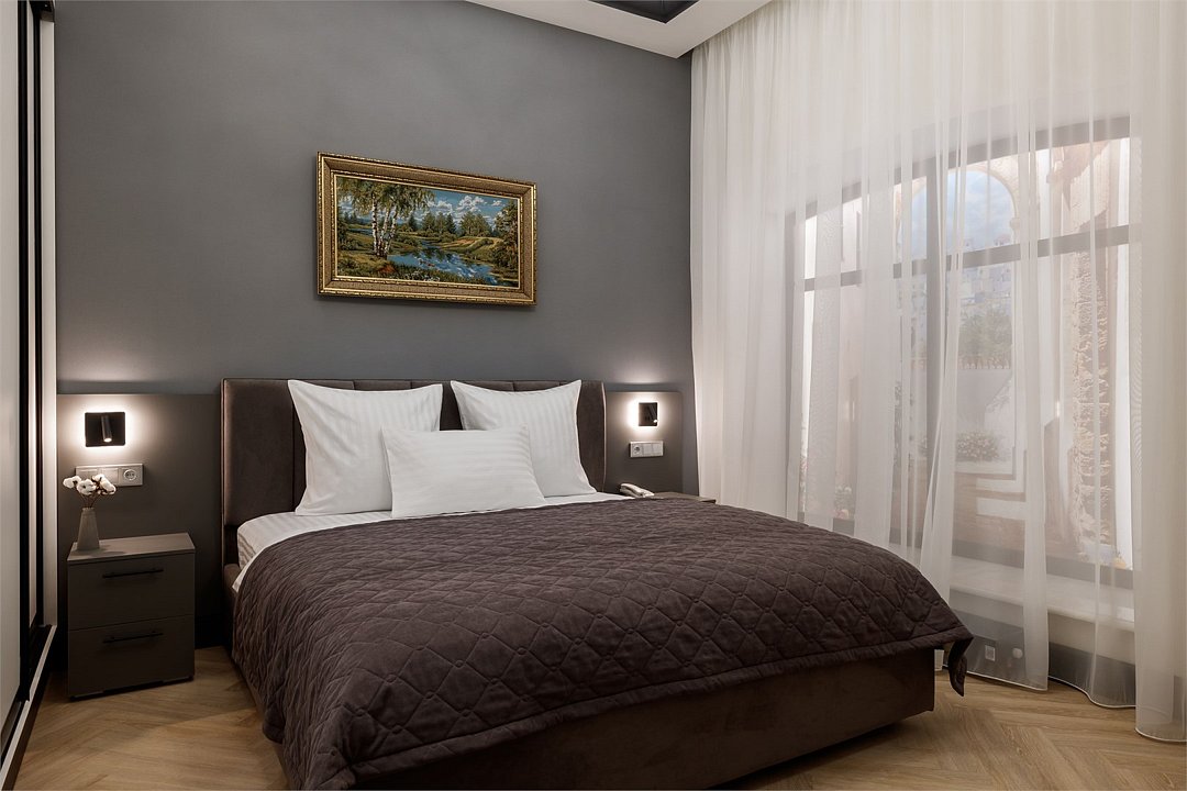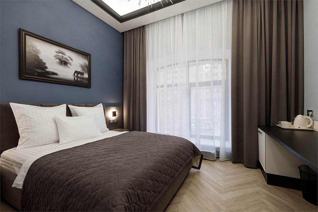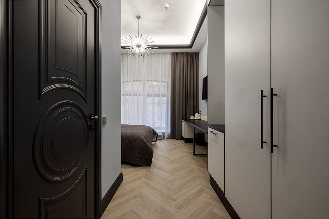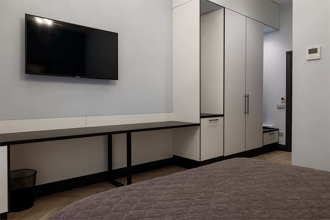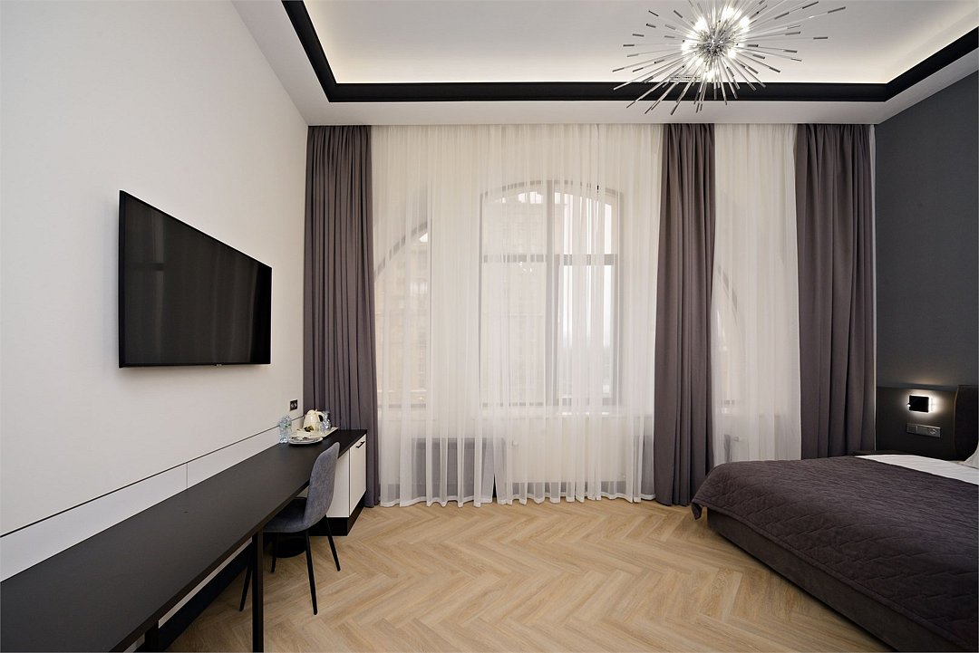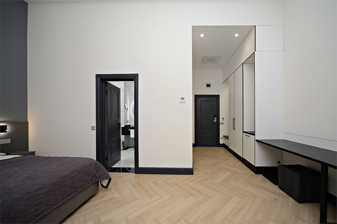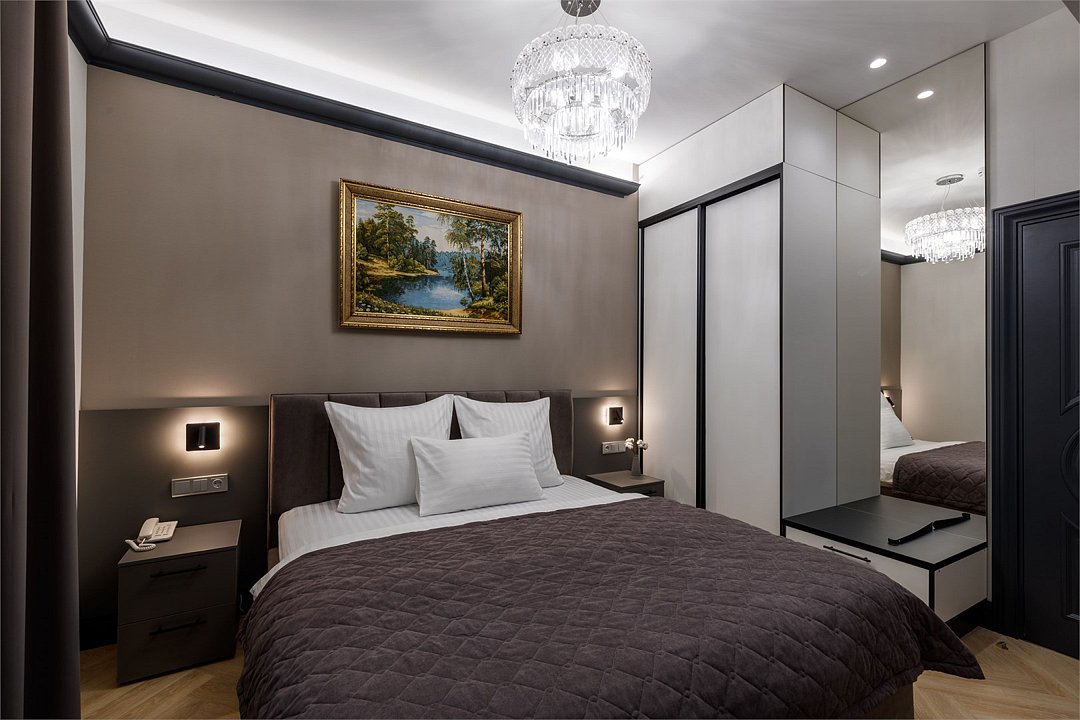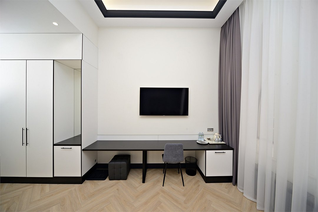 Wi-Fi, фен, система безопасности, электронные замки, санузел, халаты, банные полотенца, тапочки, двуспальная кровать, шкаф для одежды, гардеробная, вешалки, зеркало, комод, чайный набор, набор посуды, обслуживание номеров, сейф, унитаз, раковина, душ, вид на город, вид во двор, высокие потолки, меню подушек, туалетные средства, внутренний телефон, телевизор с плоским экраном, мини-холодильник, номер для некурящих, чайная станция, уборка номера, вешалки-плечики, бутилированная вода, шапочка для душа, мыло, без питомцевВ гостиничном номере