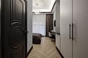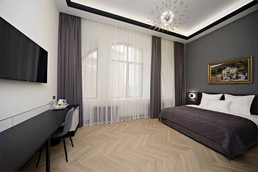 Однокомнатный, просторный номер площадью 30 кв.м. В номере: двухспальная кровать, кресло-кровать, тумба, гардероб, телевизор, кондиционер, мини-холодильник, стол, стул, лампа, электрический чайник, набор посуды, ванная комната: душ, фен, мини увеличительное зеркало, полотенца, косметические принадлежности, тапочки, халат.Услуги и удобства