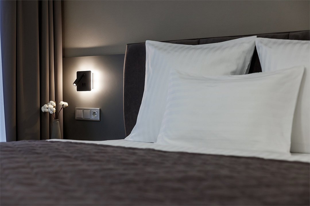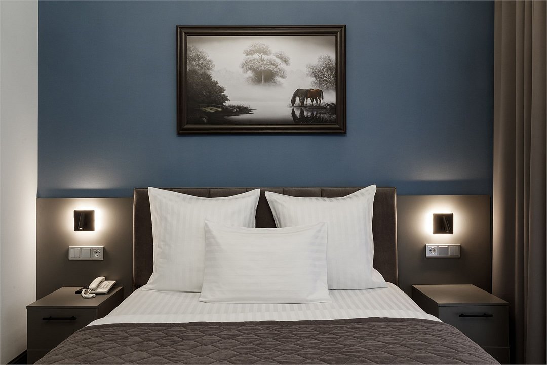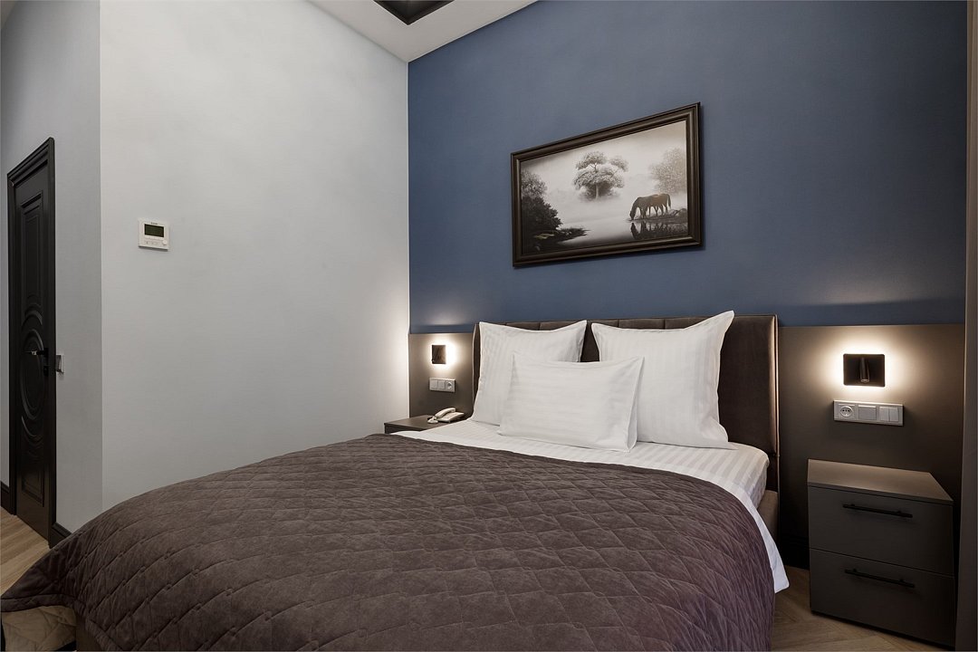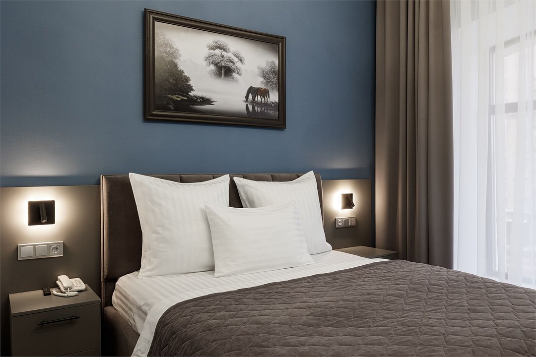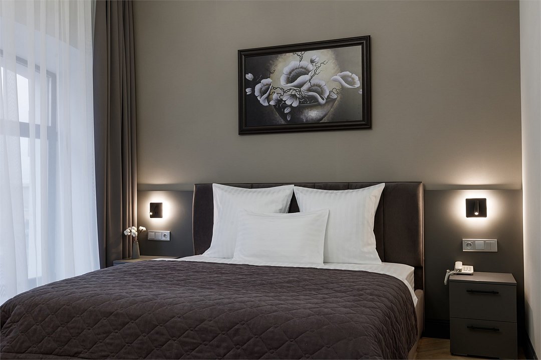 Однокомнатный номер площадью 15 кв.м. В номере: двухспальная кровать, гардероб, телевизор, кондиционер, мини-холодильник, стол, стул, электрический чайник, набор посуды, ванная комната: душ, фен, полотенца, косметические принадлежности, тапочки, халат.Услуги и удобства