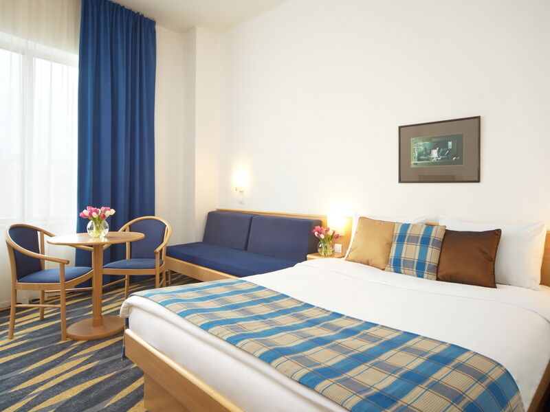 Шестиэтажный корпус отеля со стеклянным фасадом возвышается на Новослободской улице. Жилой фонд включает в себя 255 комфортабельных двухместных номеров категории Стандарт и Комфорт. В номерах современный интерьер, выдержанные в светлой цветовой гамме с использованием ярки синих оттенков. Комнаты оснащены санузлом с душем или ванной, необходимой техникой - есть сплит-система, телевизор, холодильник, фен, электрочайник.
