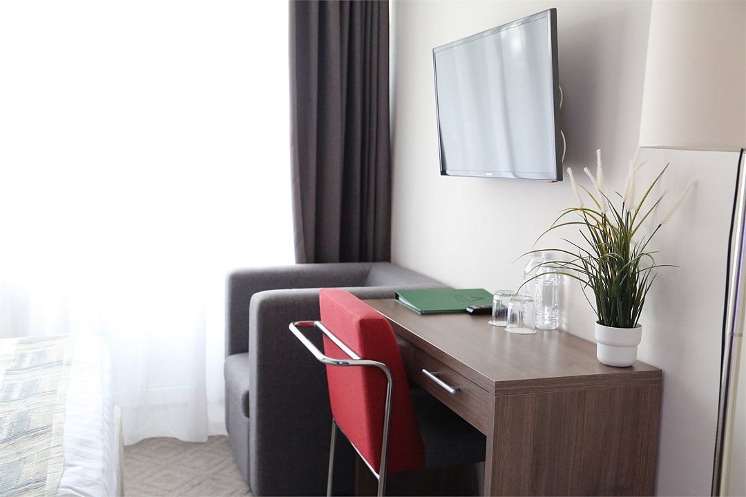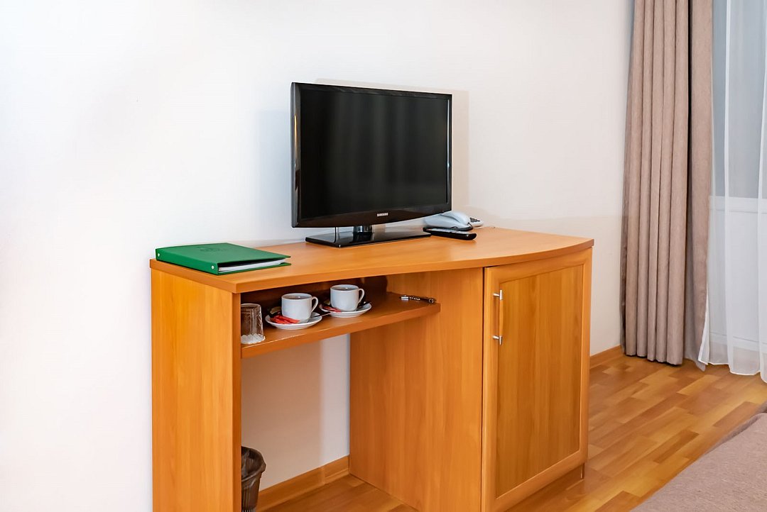 телевизор, Wi-Fi, светильник, настольные лампы, фен, электронные замки, ванная комната, душевая кабина, банные полотенца, тапочки, гигиенические средства, косметические средства, балкон с красивым видом, две односпальные кровати, тумбы, вешалки, письменный стол, зеркало, чайник, унитаз, раковина, туалетные средства, туалет, внутренний телефон, мини-холодильник, шкаф-купе, вид на лес, вешалки-плечикиВ гостиничном номере