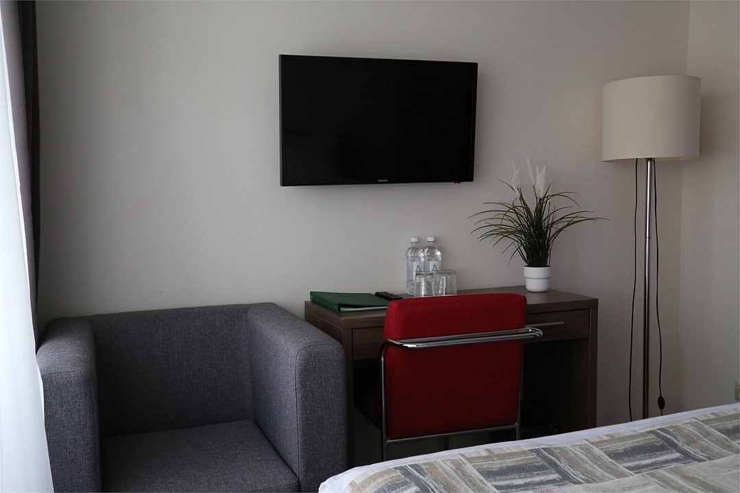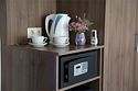 телевизор, телефон, холодильник, кондиционер, светильник, настольные лампы, фен, будильник, система безопасности, ванная комната, душевая кабина, банные принадлежности, банные полотенца, гигиенические средства, косметические средства, две односпальные или большая двуспальная кровать, кресла, тумбы, шкаф для одежды, вешалки, журнальный столик, письменный стол, багажная тумба, зеркало, чайный набор, сейф, чайник, унитаз, раковина, ковровое покрытие, отопление, душ, вид на сад, кресло, стул, стол, туалетные средства, туалетВ гостиничном номере
