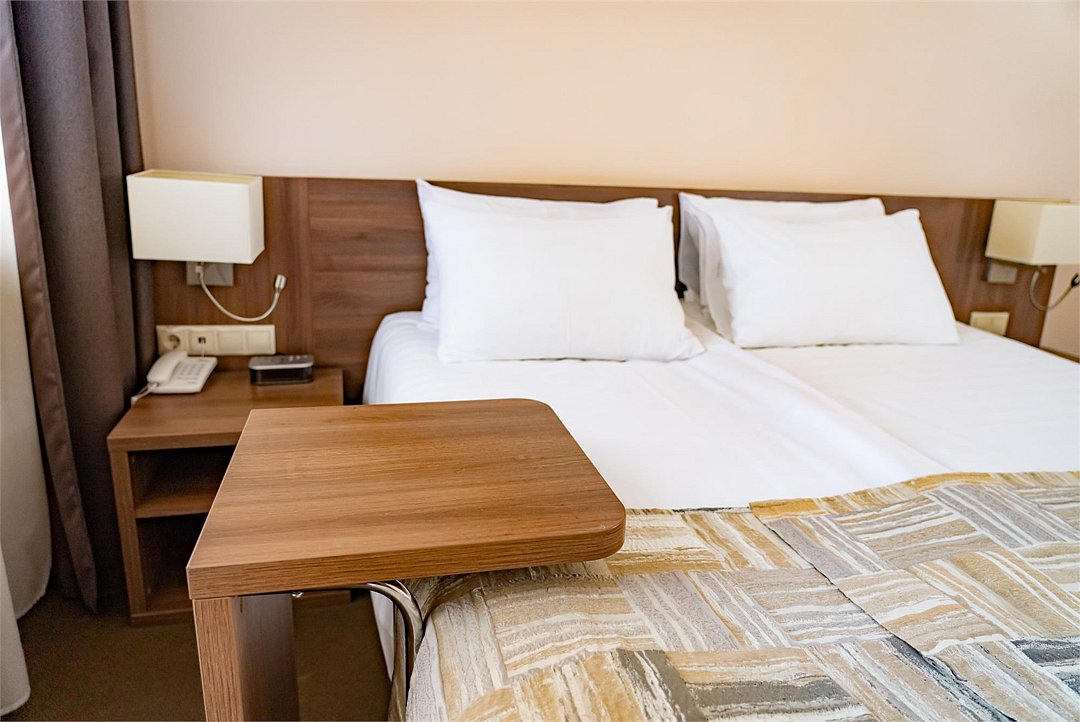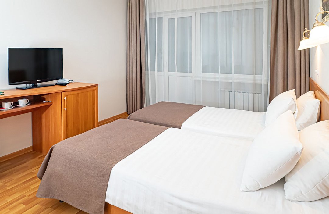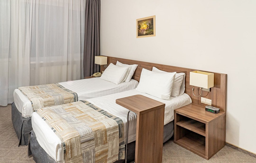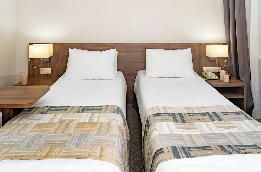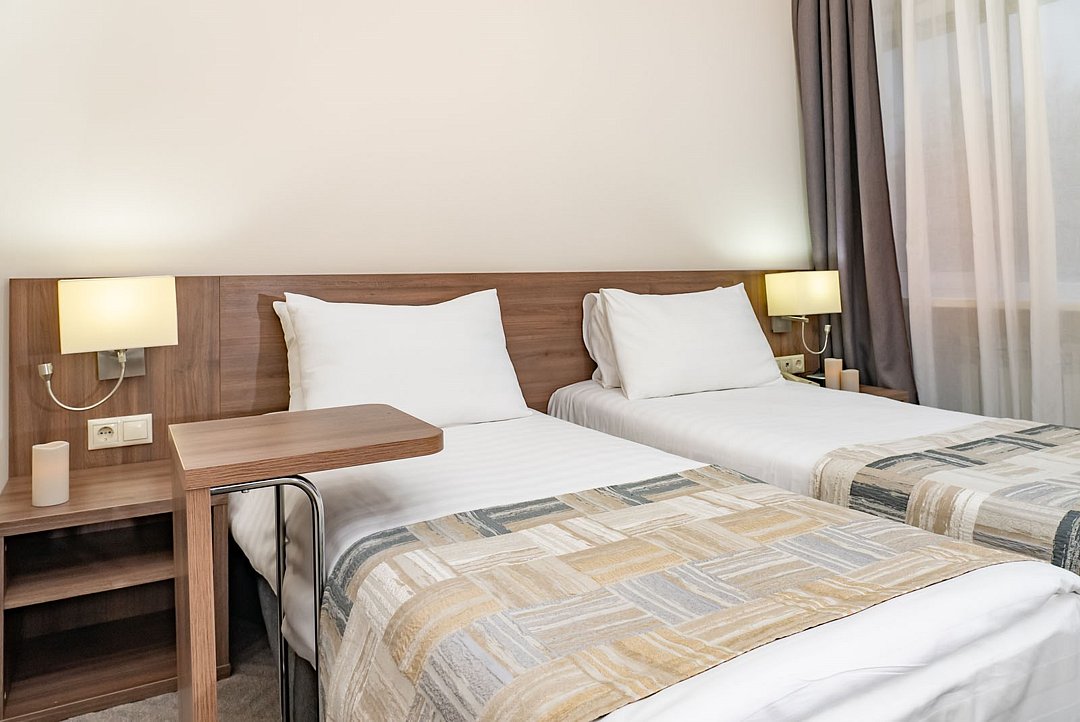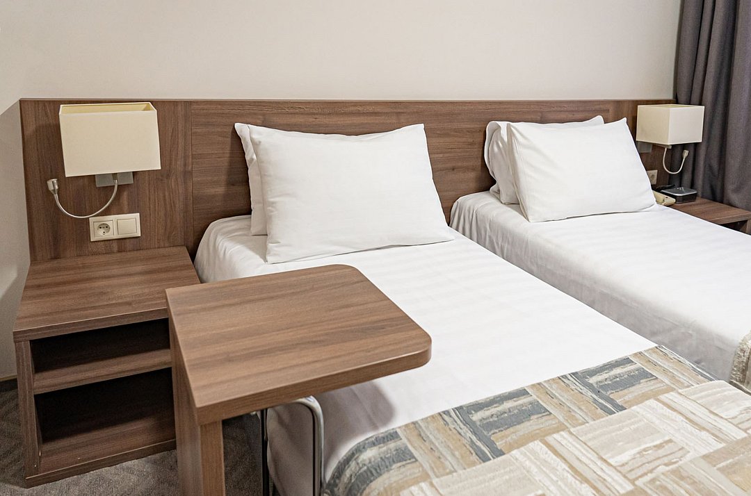 Однокомнатный двухместный номер повышенной комфортности, с кондиционером. В номере две раздельные кровати 90*200 (по запросу сдвигаются), душевая кабина. Номер расположен в Главном корпусе.Услуги и удобства