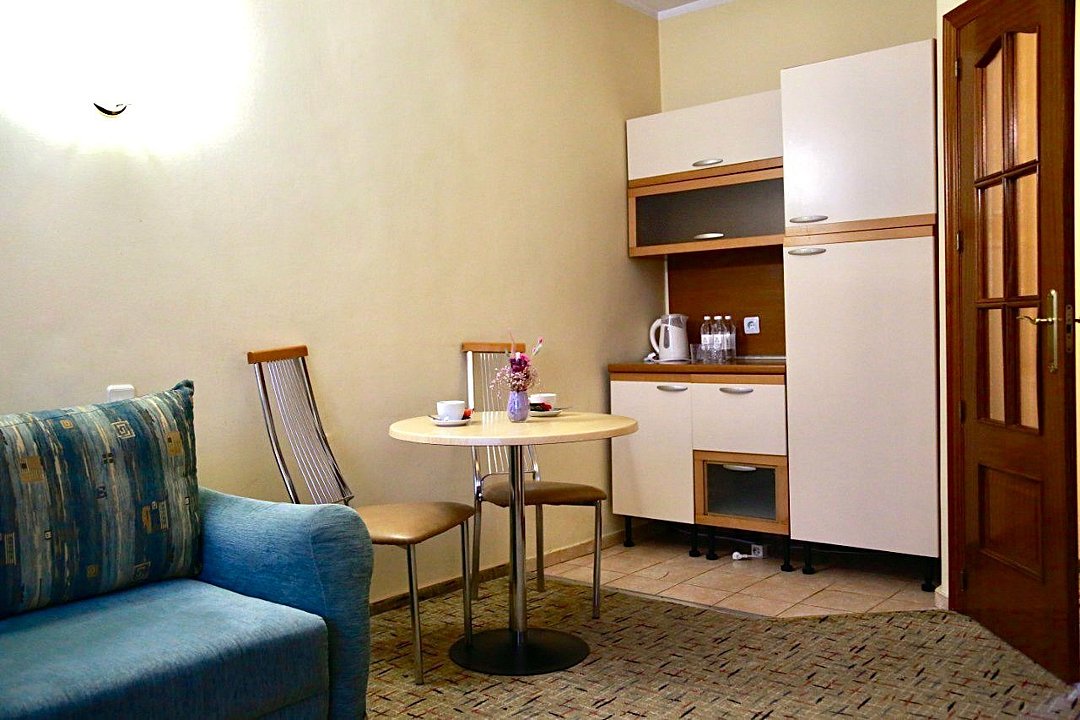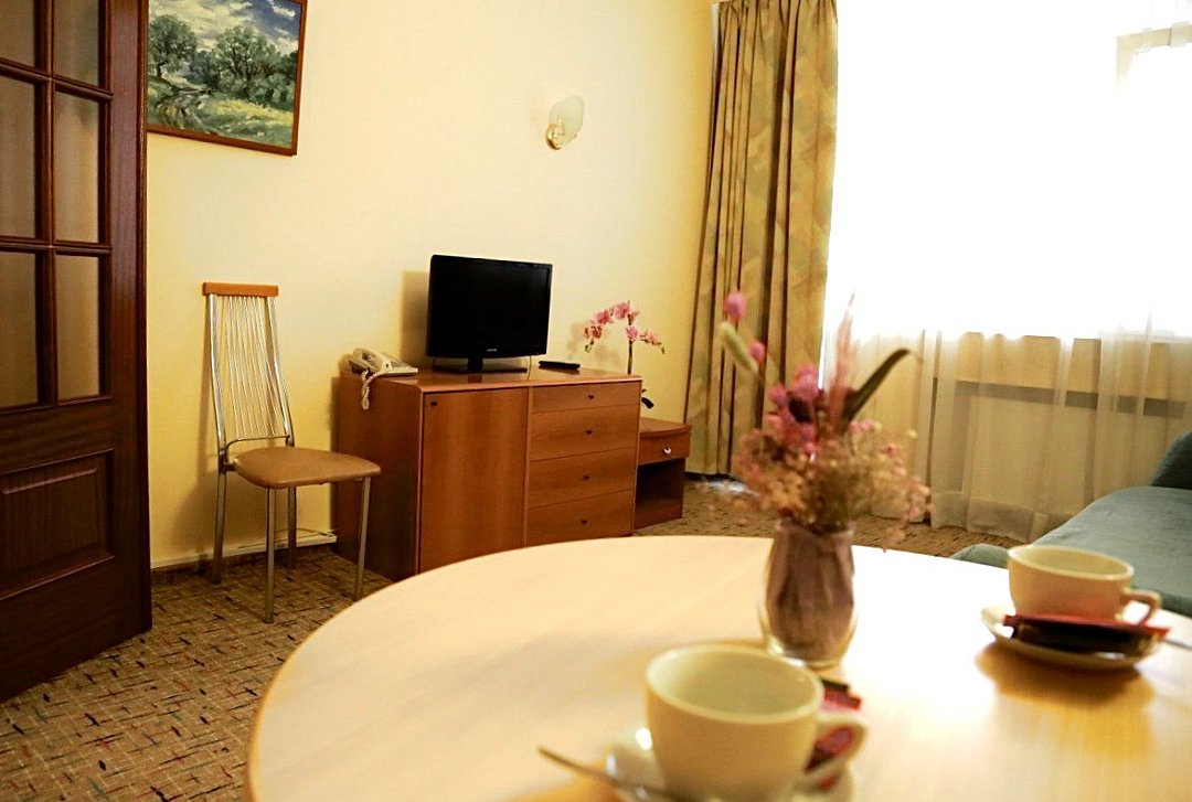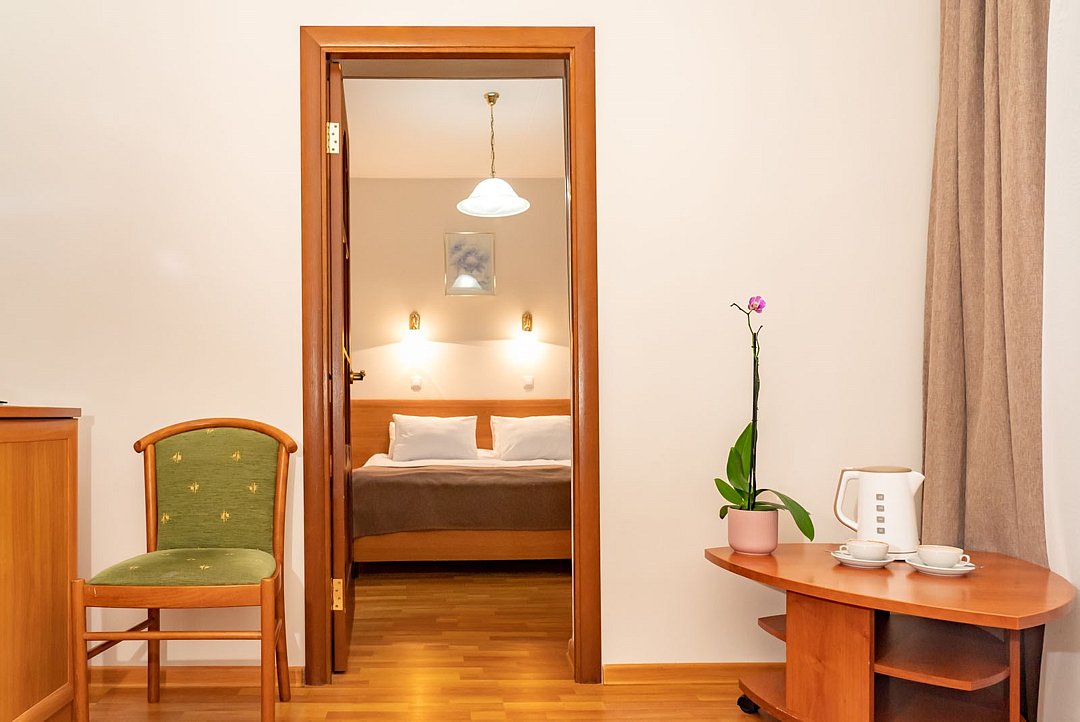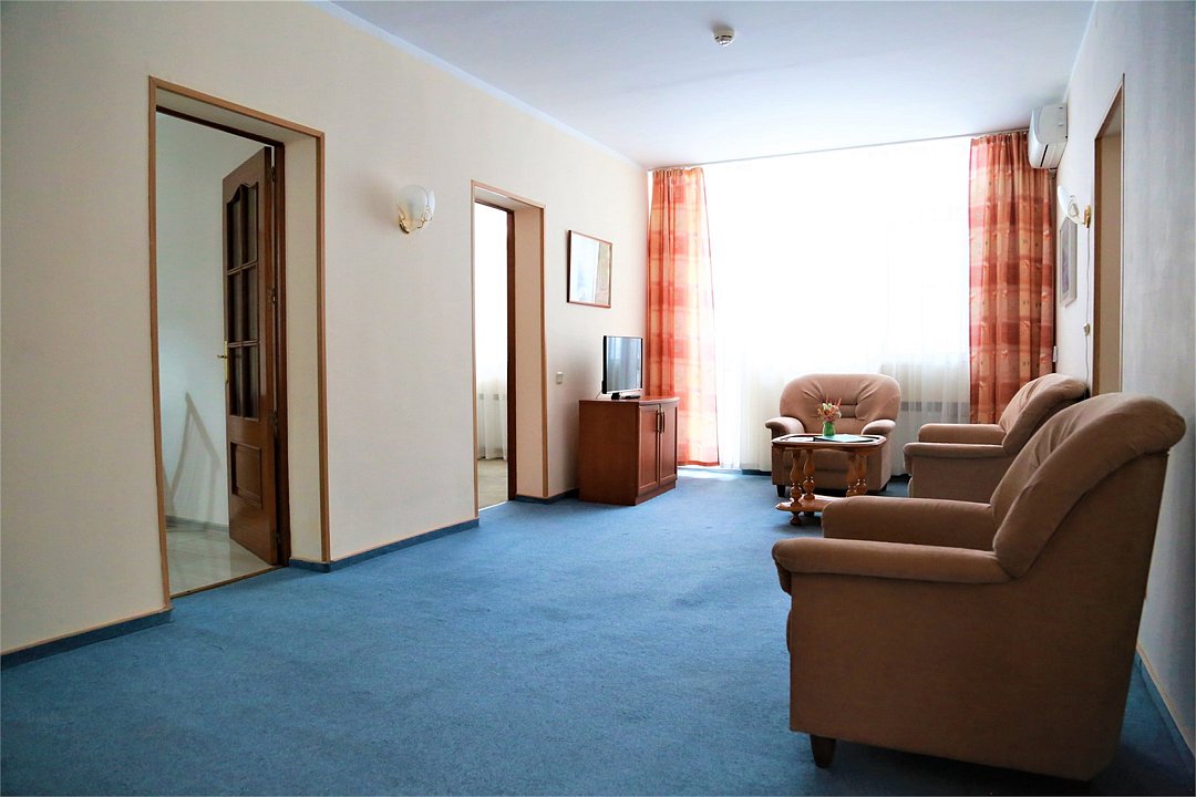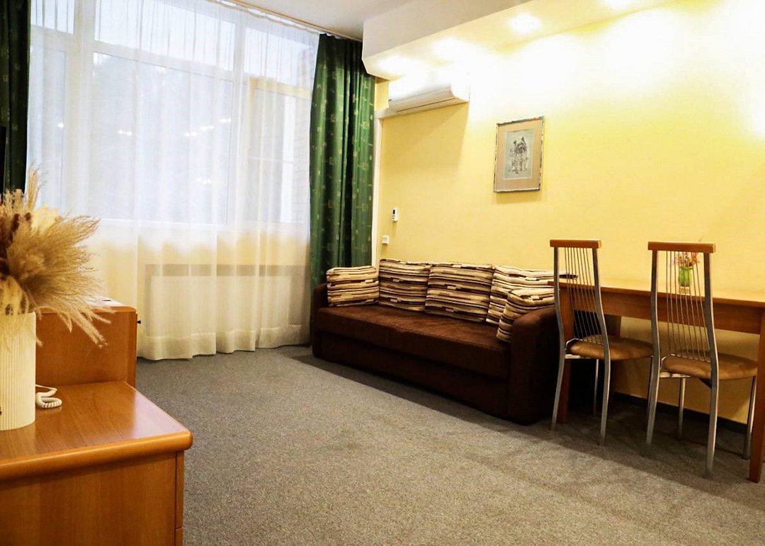 Просторный номер повышенной комфортности, который прекрасно подойдет для длительного отдыха с семьей . В номере спальня , гостиная с диваном, мини - кухня, обеденная зона. Номер расположен в главном корпусе, что особенно удобно для семей с малышами. Две кровати 90*200 (по запросу сдвигаются).Услуги и удобства