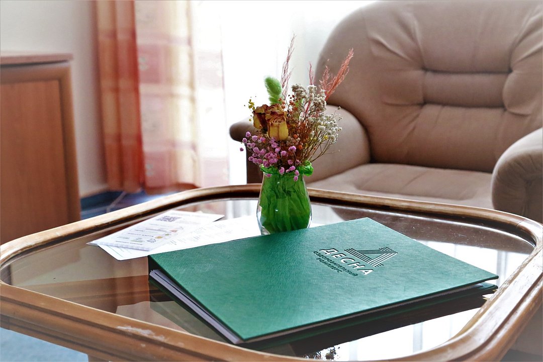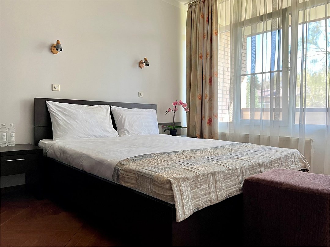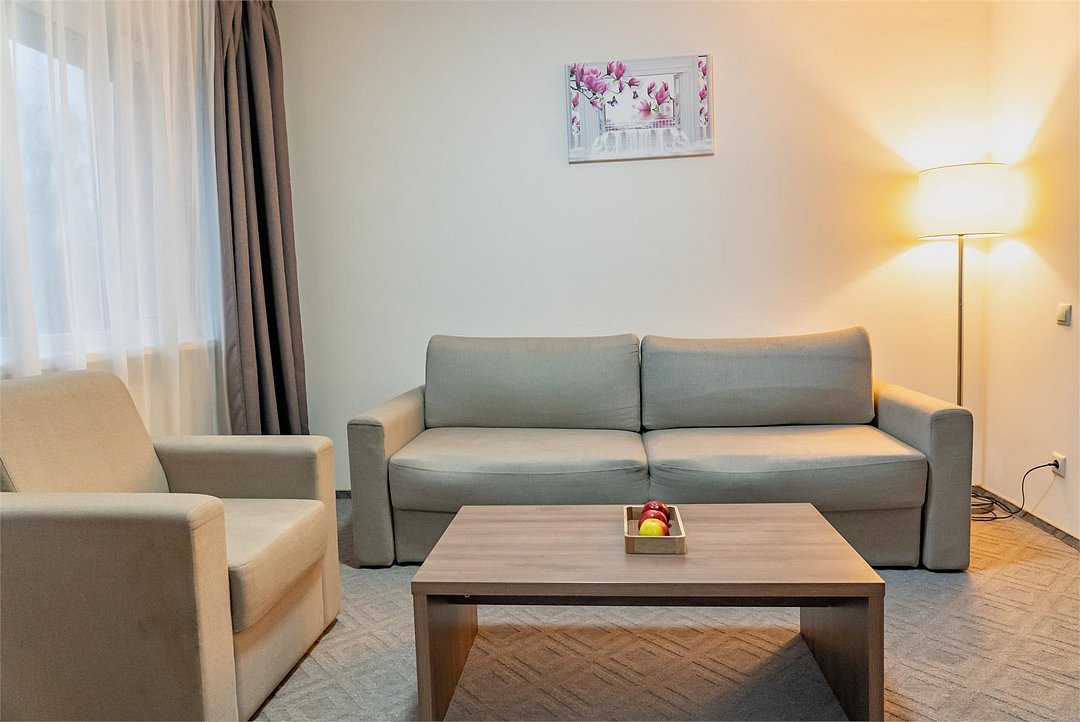 Двухкомнатный номер с кухонным уголком. В спальне две кровати 90*200 объединены топпером, по запросу возможно раздельное размещение. В просторной гостиной диваном, который по запросу раскладывается. Номера расположены в третьем корпусе. Все номера с балконами, откуда открывается потрясающий вид на лес.Услуги и удобства