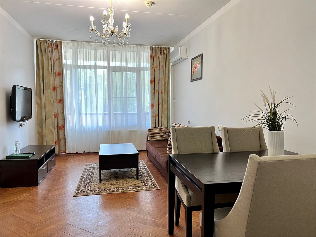 Апартамент двухкомнатный двухместный с кухней - просторный, уютный двухкомнатный номер с отдельной кухней, который прекрасно подойдет для длительного отдыха с семьей. В номере спальня с двуспальной кроватью 160*200, гостиная с диваном, кухня, балкон с видом на тихий лес.Услуги и удобства