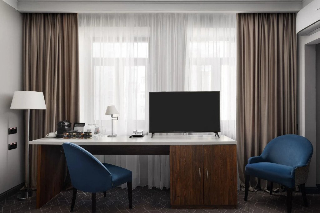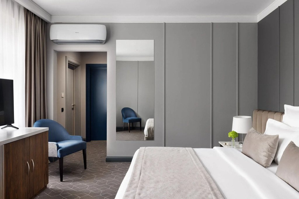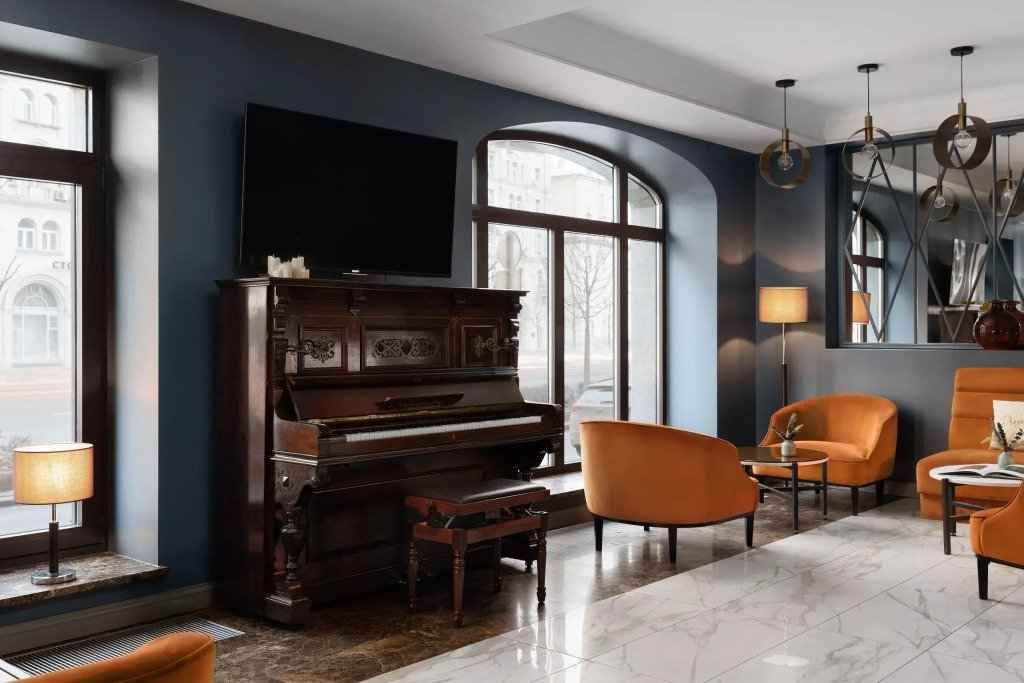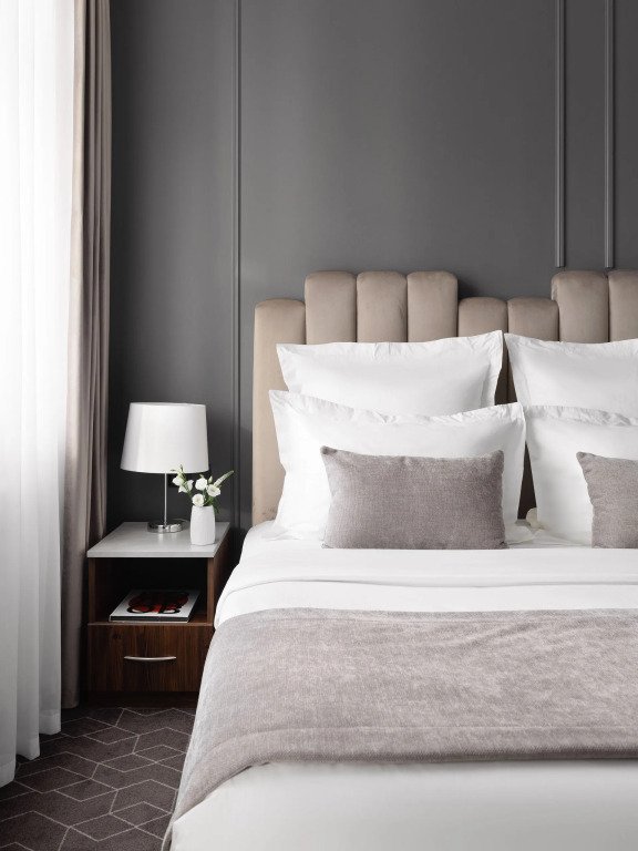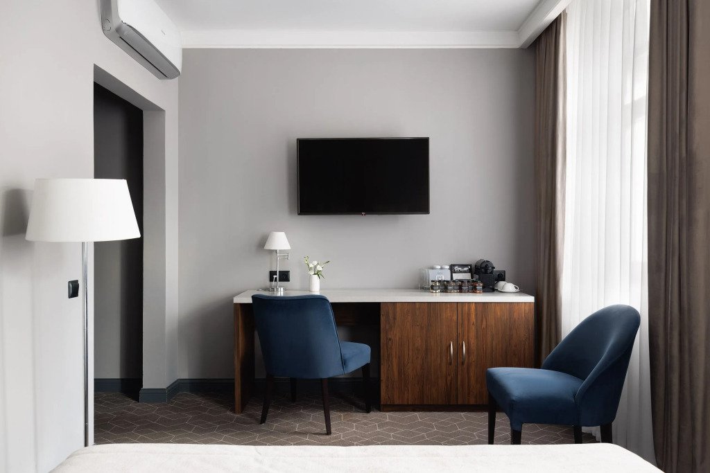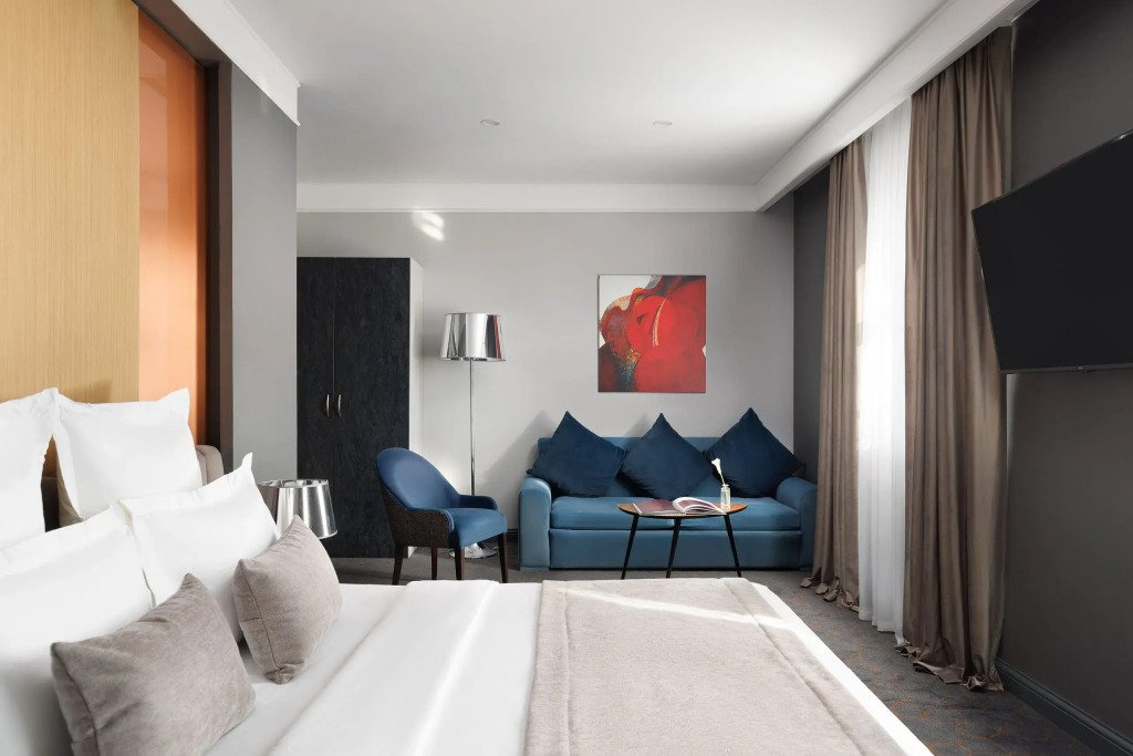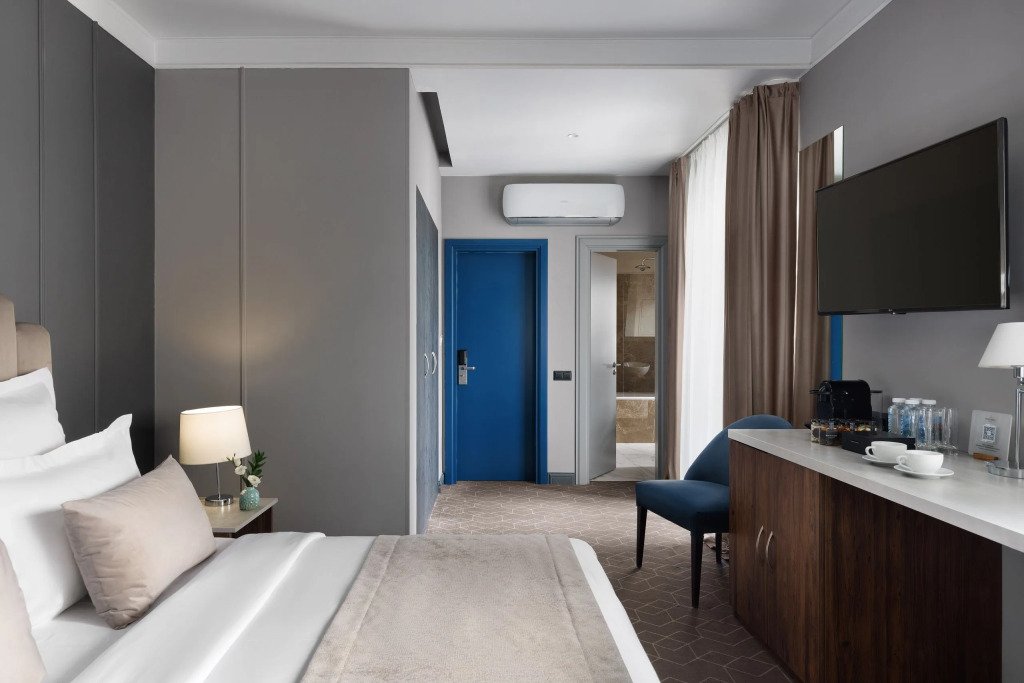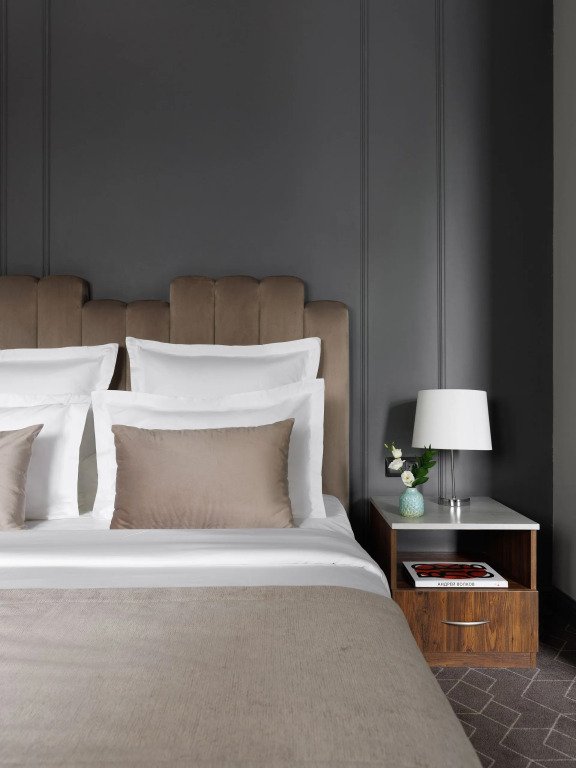 Все номера отеля выполнены в современном стиле с использованием материалов премиум класса, натурального мрамора и лучших тканей. Фасад здания облицован природным камнем.