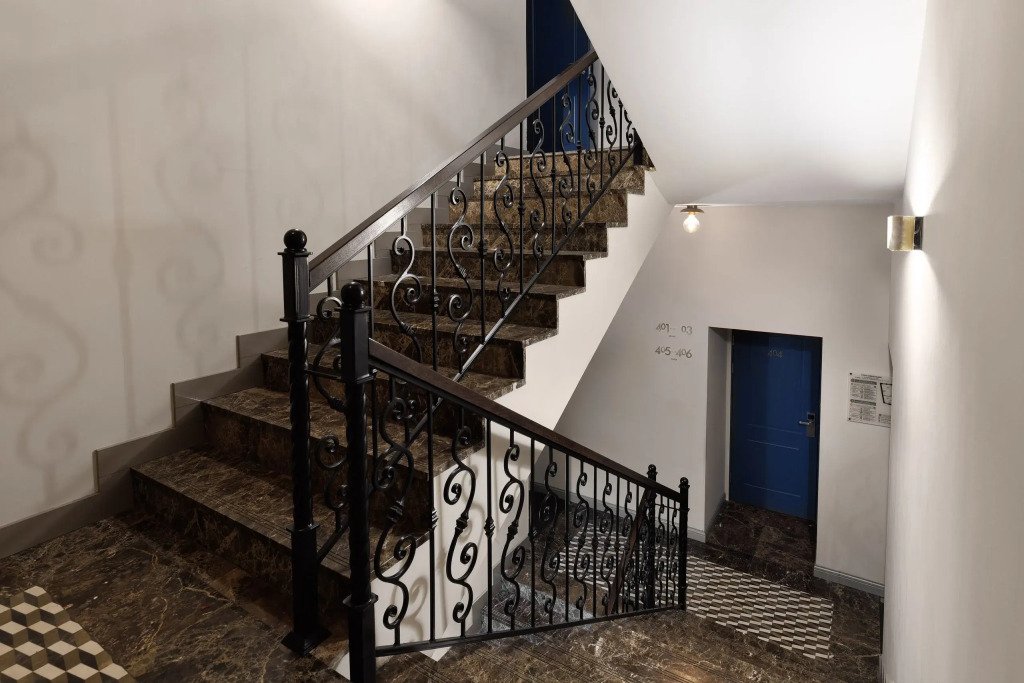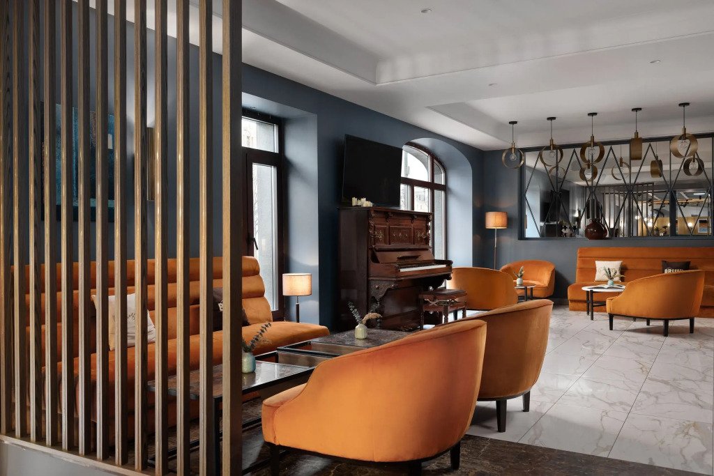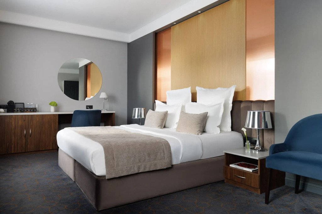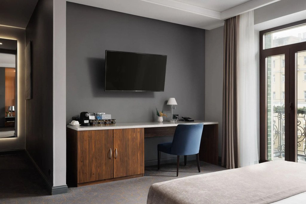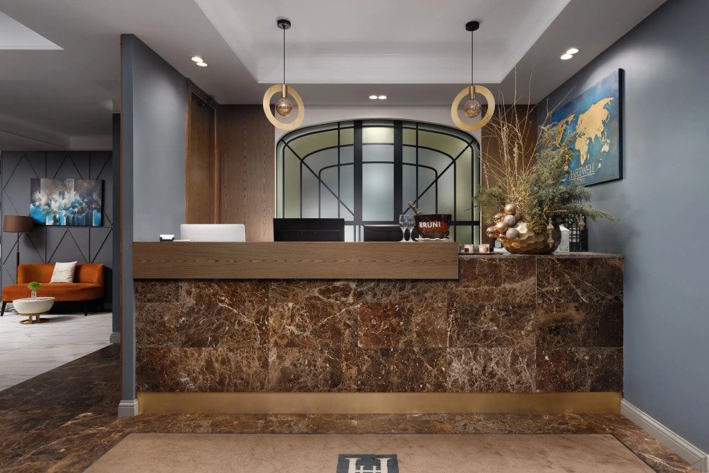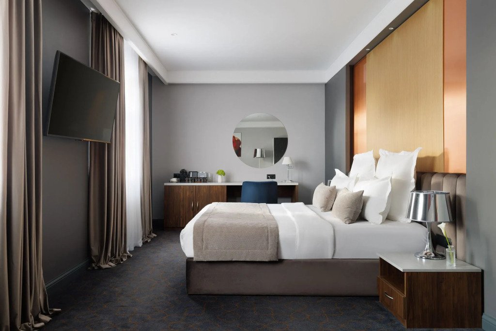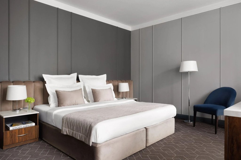 Все номера отеля выполнены в современном стиле с использованием материалов премиум класса, натурального мрамора и лучших тканей. Фасад здания облицован природным камнем.