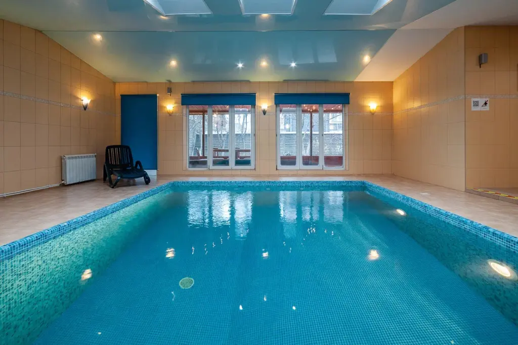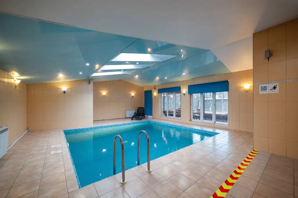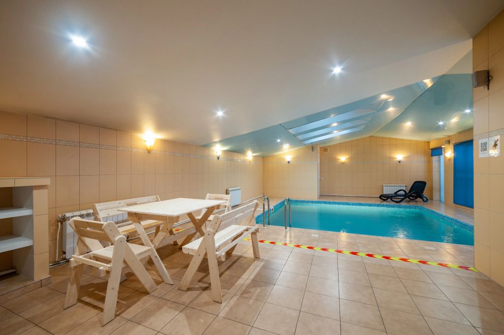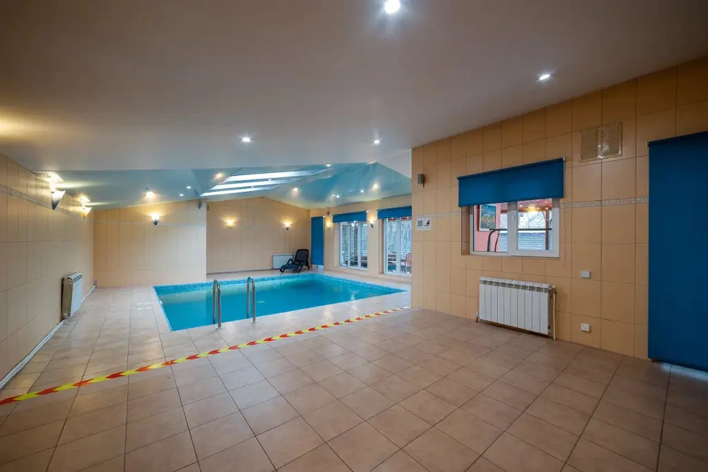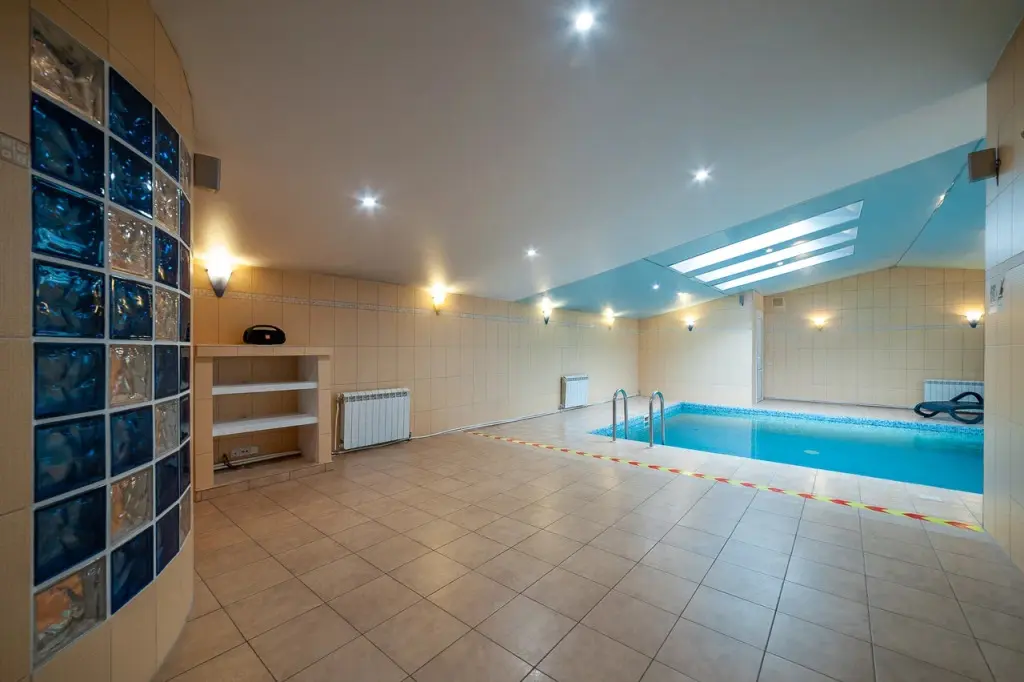 Отдельное крыло дома оборудовано бассейном с подсветкой и перепадом глубины, а также сауной, зоной отдыха и душевой.