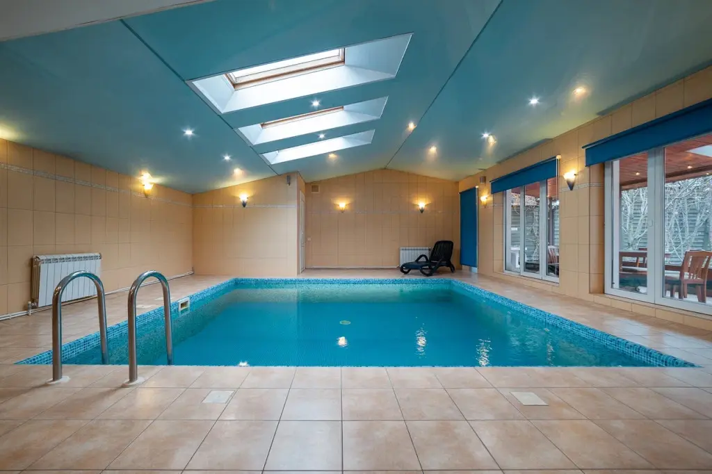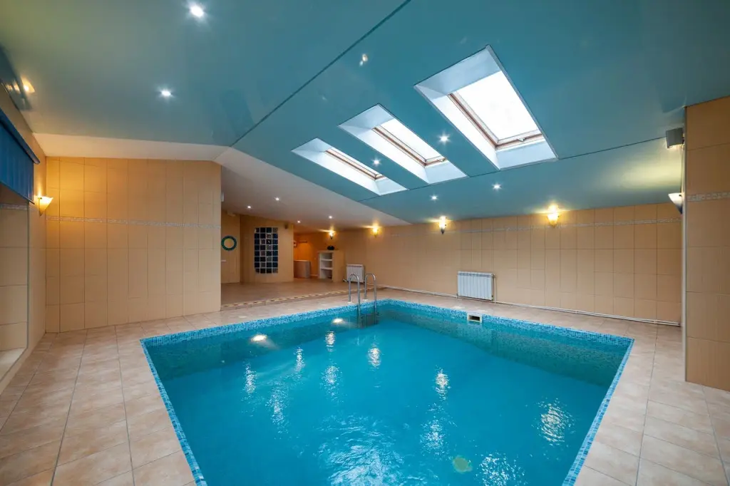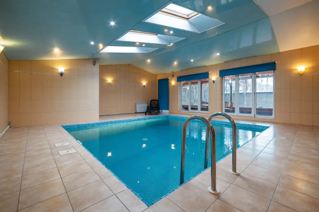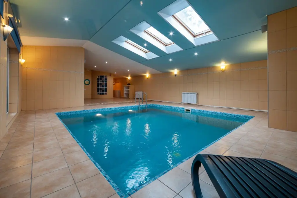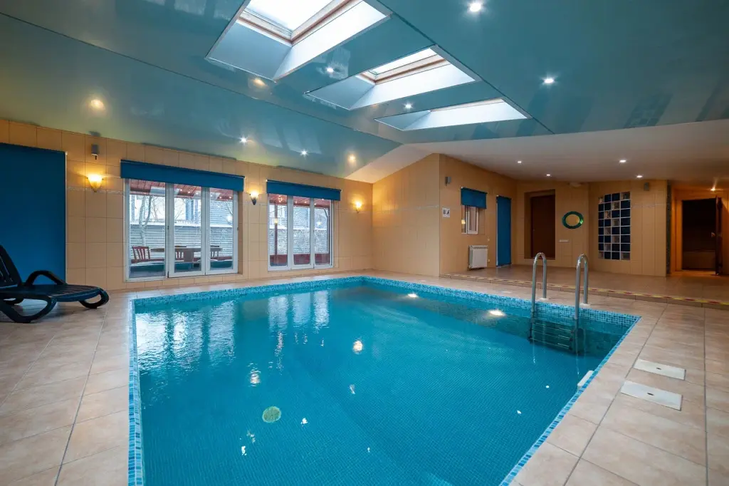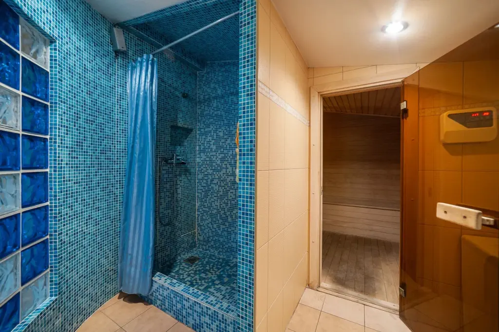 Отдельное крыло дома оборудовано бассейном с подсветкой и перепадом глубины, а также сауной, зоной отдыха и душевой.