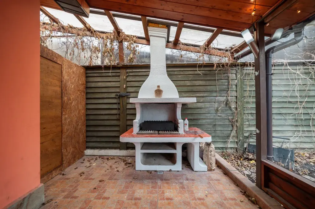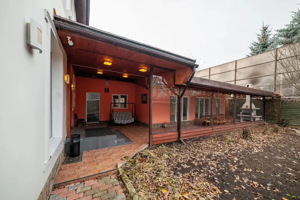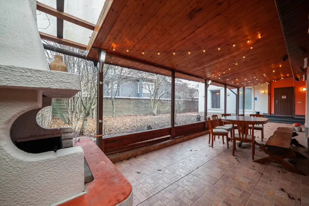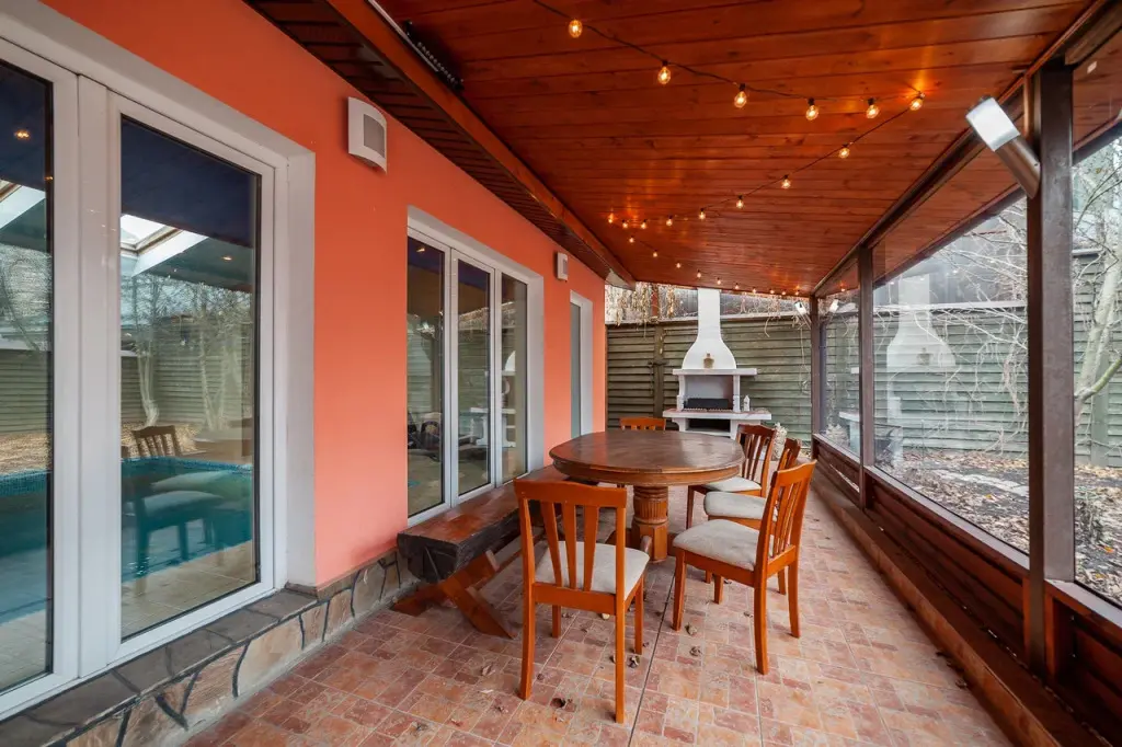 Крытое патио на улице с мебелью и зоной барбекю создаёт идеальную атмосферу для отдыха на свежем воздухе и проведения вечеринок под открытым небом.