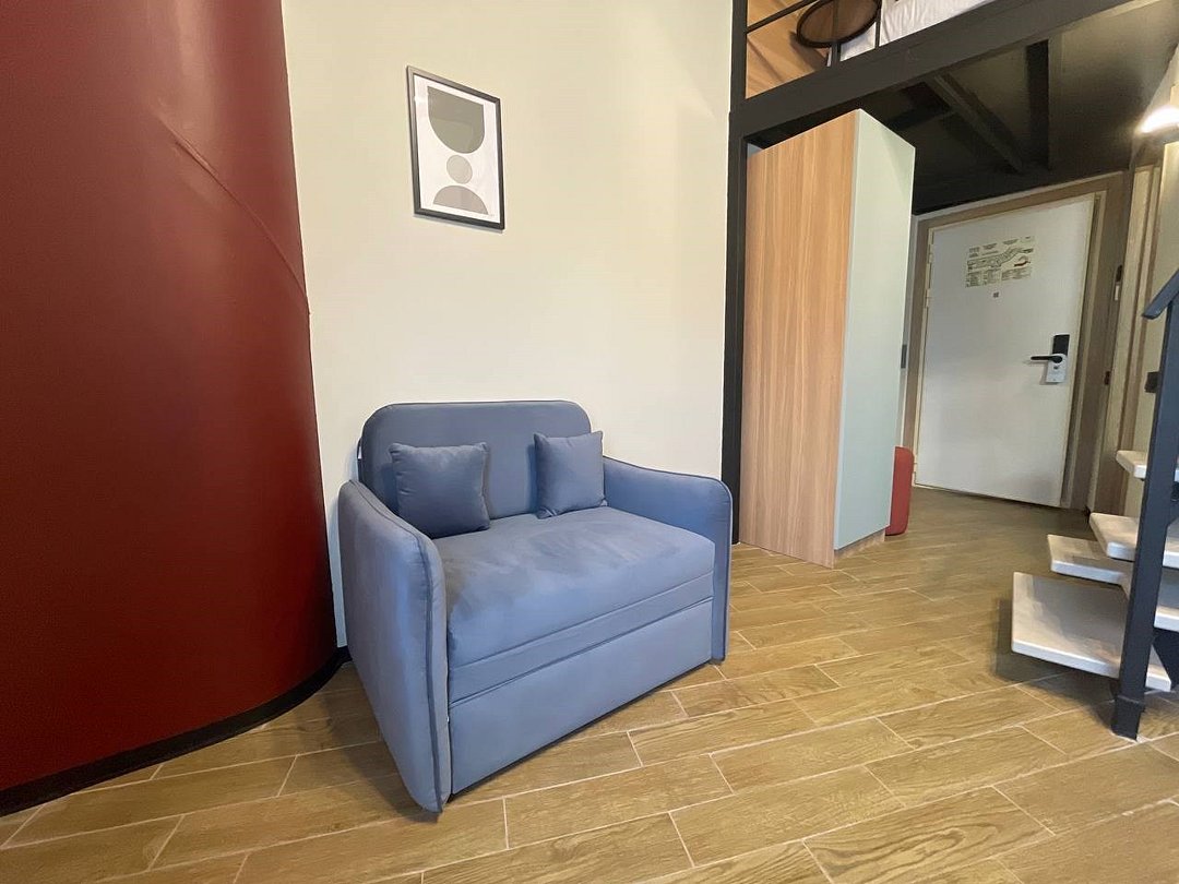Двухуровневый просторный номер для трехместного размещения с двуспальной кроватью и раскладным диваном, с кухней, Салют ТВ, кондиционером.Услуги и удобства