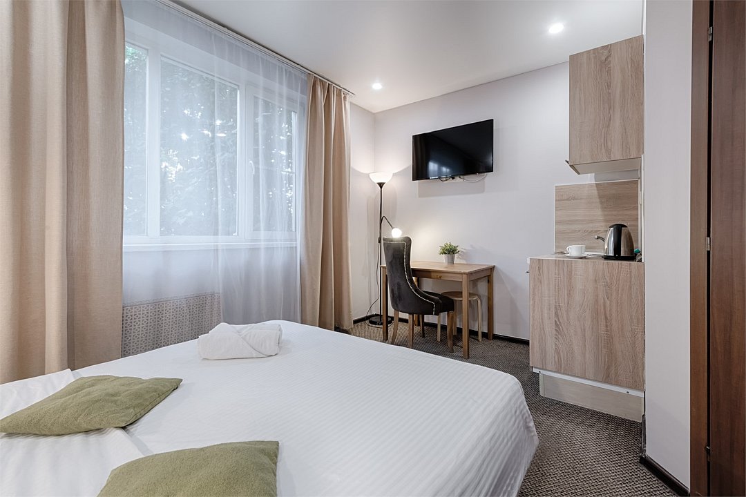 телевизор, кабельное телевидение, Wi-Fi, интернет, холодильник, светильник, кулер, фен, микроволновая печь, утюг, ванна или душевая кабина, санузел, тапочки, косметические средства, две односпальные кровати, вешалки, обеденный стол, зеркало, кухня, чайный набор, набор посуды, обслуживание номеров, чайник, раковина, питьевая вода, обеденная зона, отопление, душ, вид на город, кулер на этаже, кухонная посуда, стаканы, кухонная утварь, столовые приборы, стул, стол, туалет, мини-холодильник, мини-кухня, кухонный уголокВ гостиничном номере