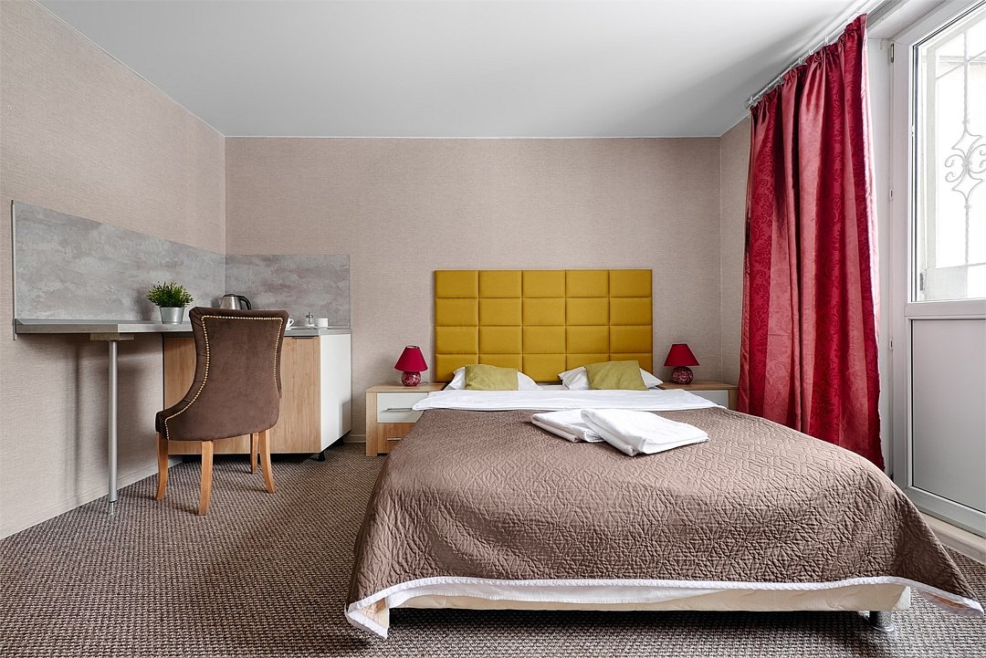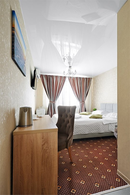 телевизор, кабельное телевидение, Wi-Fi, интернет, фен, микроволновая печь, утюг, ванна, кровать «Queen size», гардеробная, зеркало, чайный набор, минеральная вода, чайник, отопление, вид во двор, стаканы, стол, туалет, мини-холодильникВ гостиничном номере