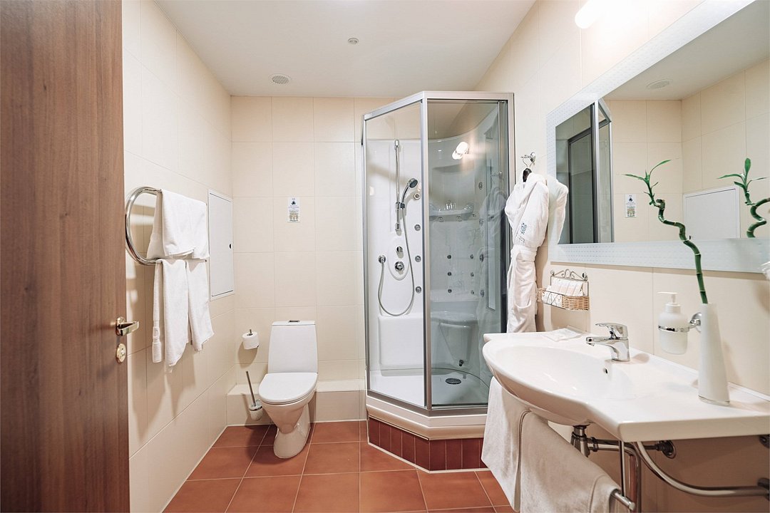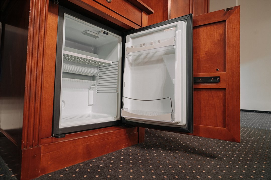 телевизор, Wi-Fi, интернет, телефон, холодильник, кондиционер, светильник, настольные лампы, фен, электронные замки, обогреватель, душевая кабина, гидромассажный душ, банные принадлежности, банные полотенца, тапочки, гигиенические средства, кровать «King size», ортопедический матрас, тумбы, стулья, шкаф для одежды, вешалки, журнальный столик, письменный стол, багажная тумба, зеркало, мебельный гарнитур, мини-бар, чайный набор, набор посуды, обслуживание номеров, информационная карта, меню, сейф, унитаз, раковина, косметическое зеркало, ковровое покрытие, отопление, вид на город, вид во двор, стаканы, столовые приборыВ номере