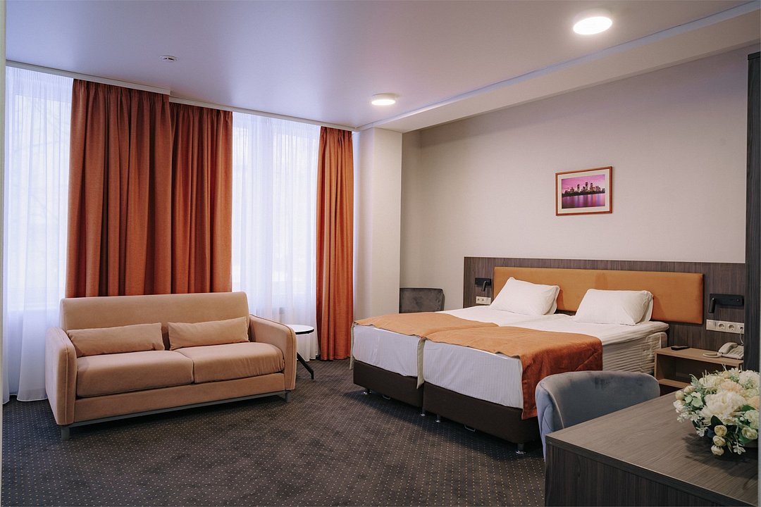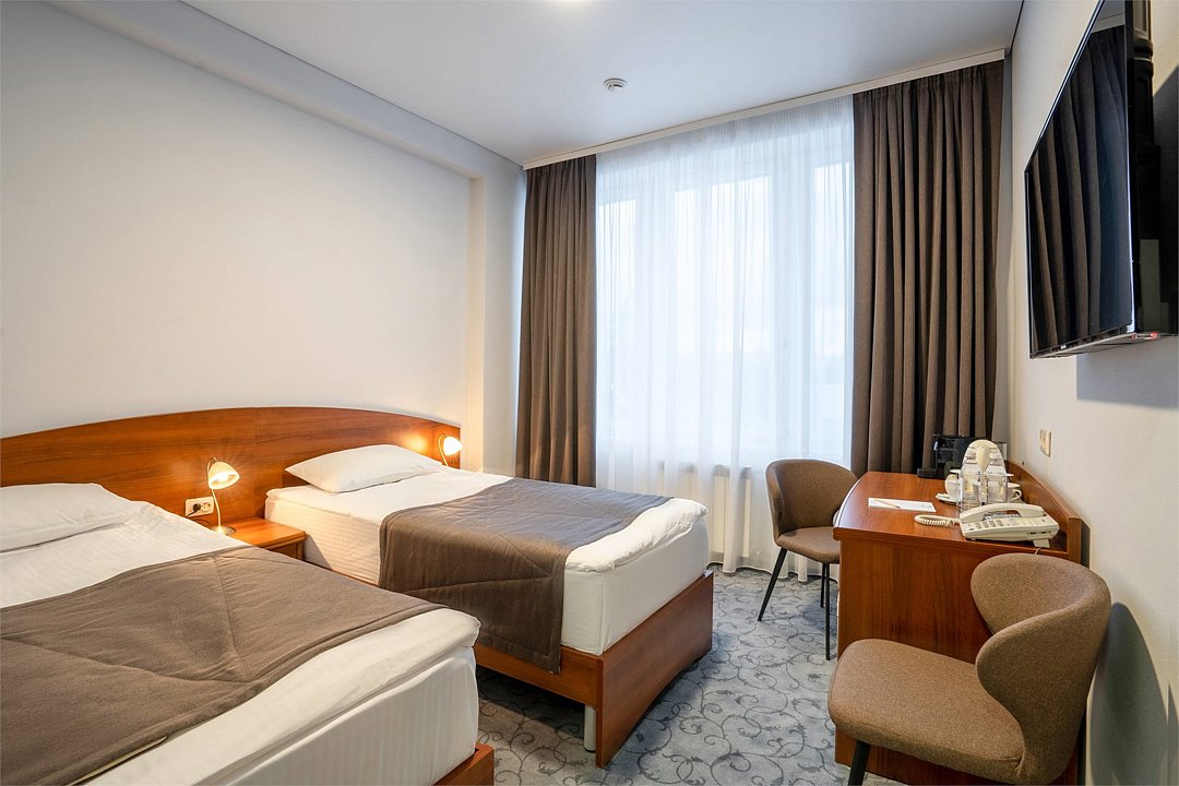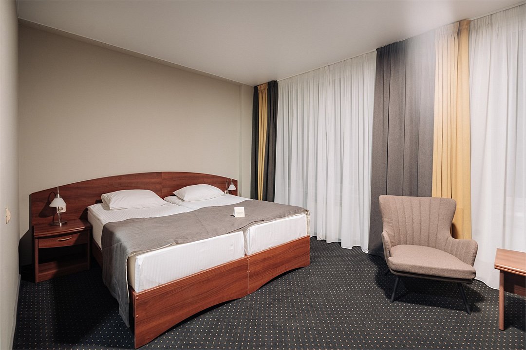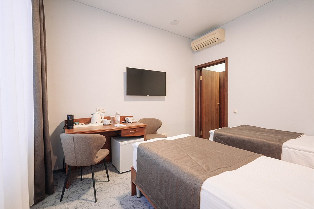 Двухместный номер с двумя кроватями. Просторная комната, оснащенная современной мебелью, чайной станцией, выполнена в теплых пастельных тонах. В каждом номере тапочки, французская гипоаллергенная косметика; позволит гостям в полной мере насладиться отдыхом. Площадь номера 15 кв.м.Услуги и удобства