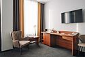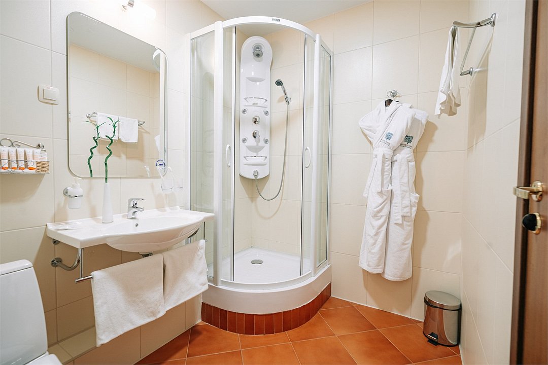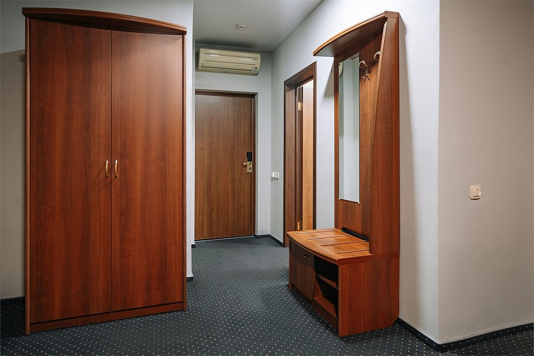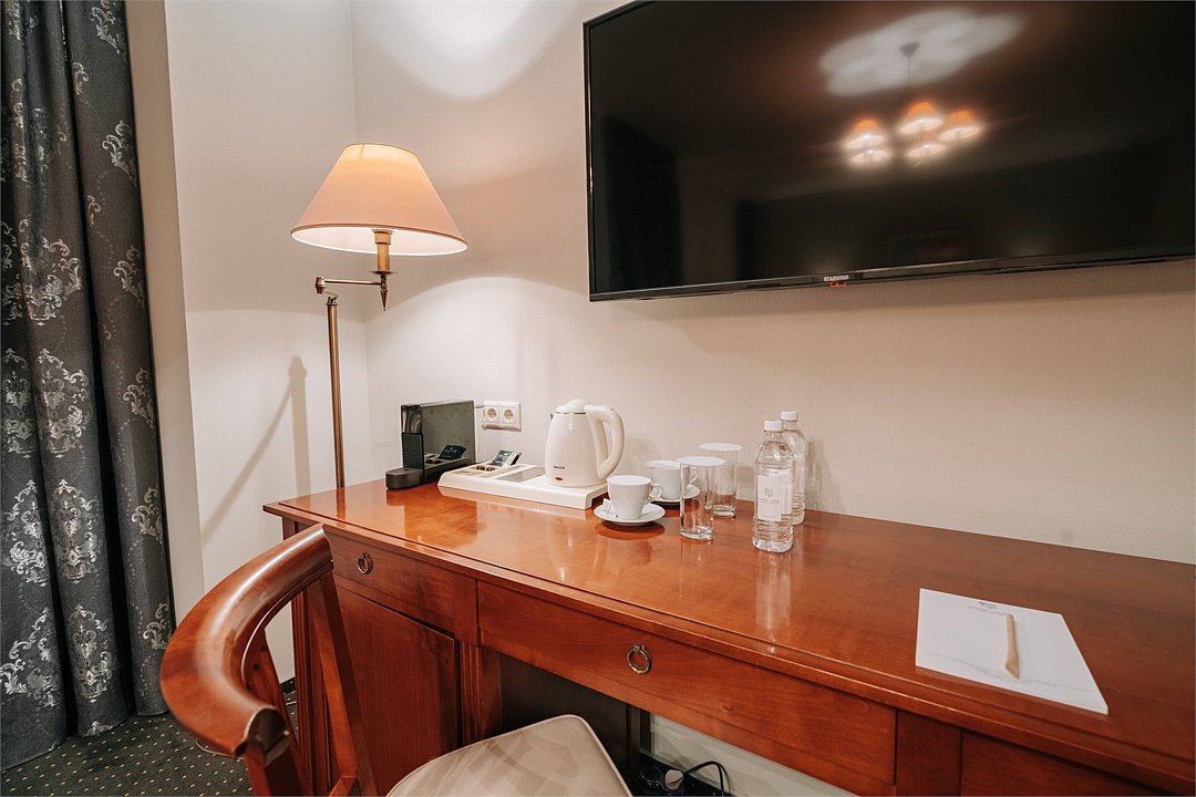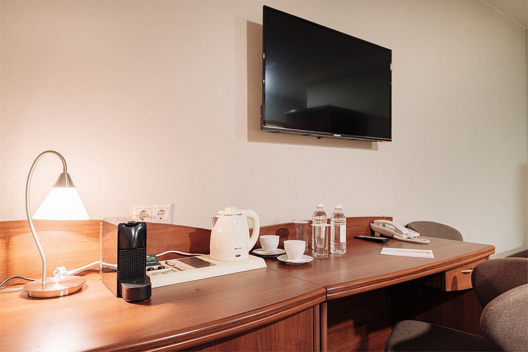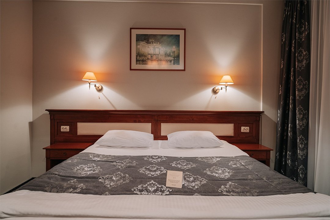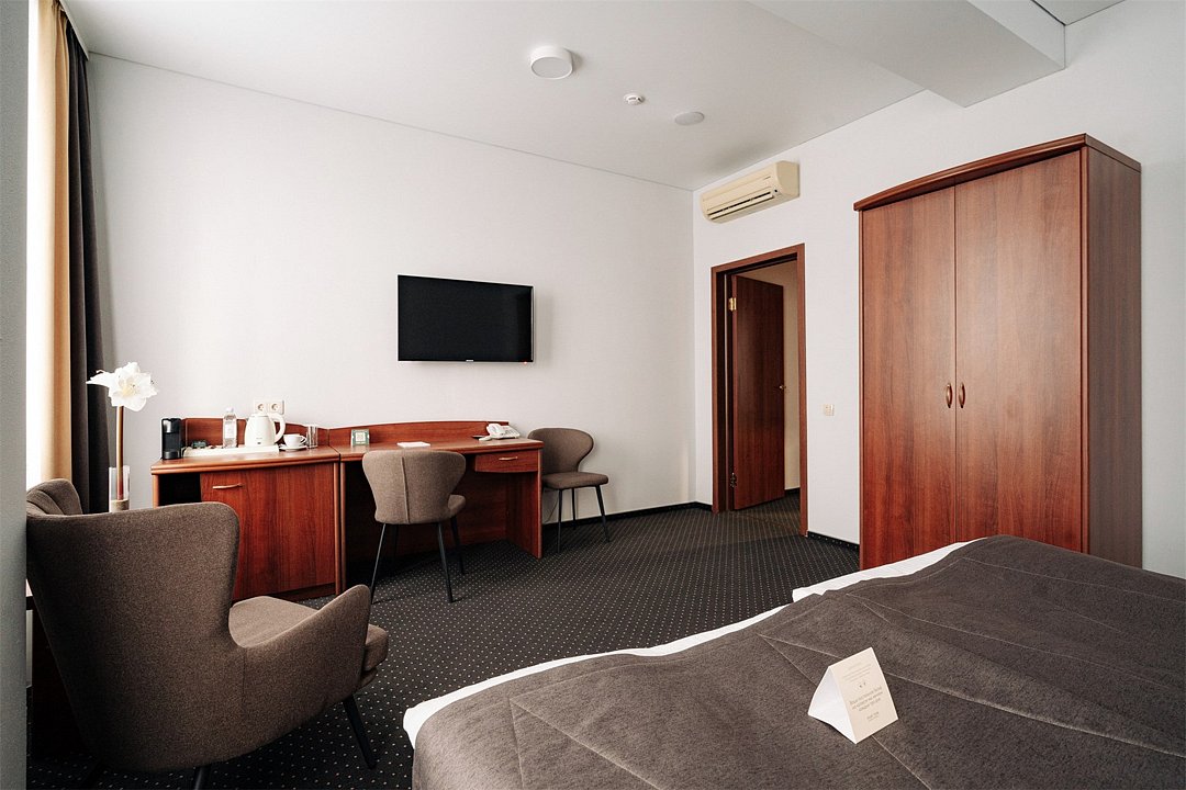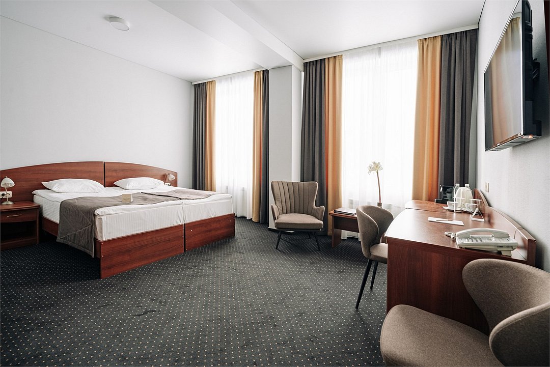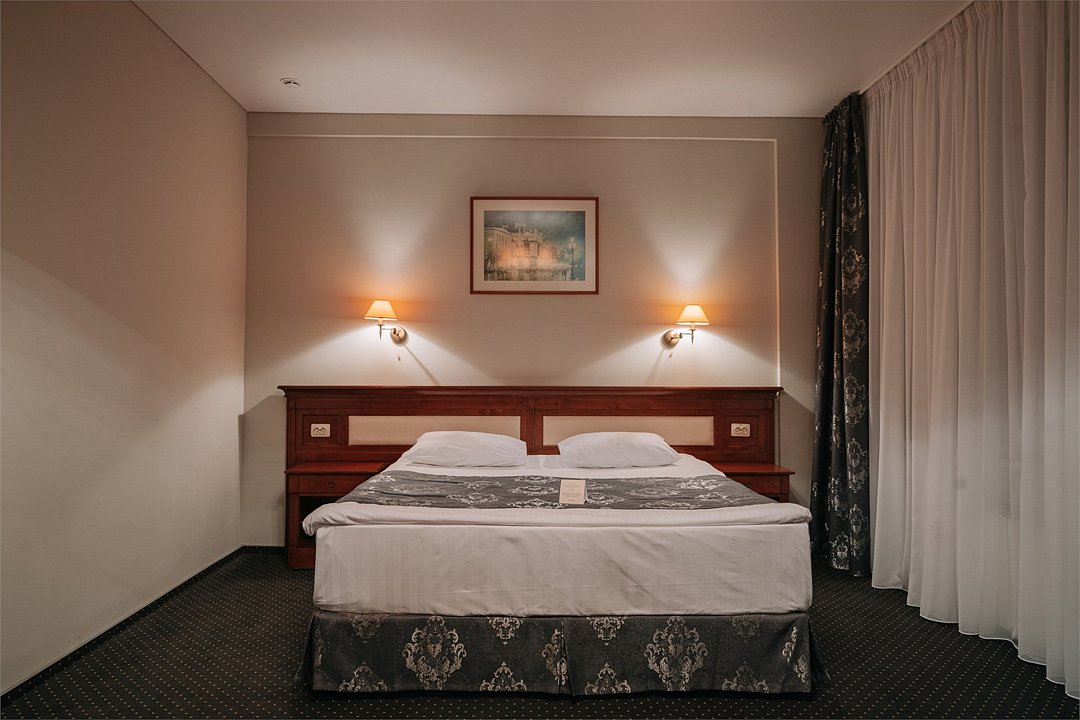 Двухместный номер с кроватью «Кинг сайз». Просторная комната, оснащенная современной мебелью, чайной станцией, кофе машиной, выполнена в теплых пастельных тонах. В каждом номере тапочки, французская гипоаллергенная косметика; позволит гостям в полной мере насладиться отдыхом. Площадь номера 27 кв.м.Услуги и удобства