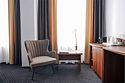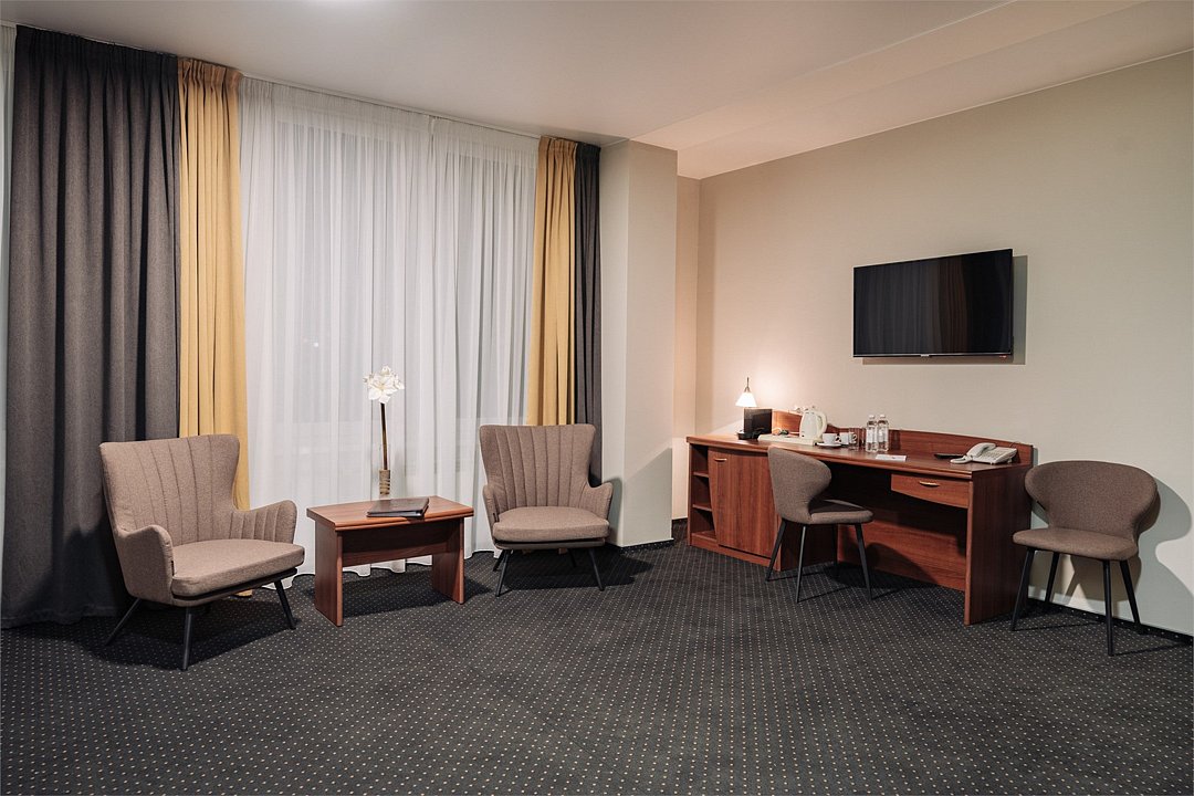 Двухместный номер с кроватью «Кинг сайз» и итальянской мебелью из натурального дерева. Оригинальный дизайн номеров этой категории удовлетворит пожелания самых взыскательных гостей. Большие обзорные окна делают номер еще более просторным и светлым. Номер оборудован чайной станцией, кофе машиной, выполнен в теплых пастельных тонах. В каждом номере тапочки, французская гипоаллергенная косметика; позволит гостям в полной мере насладиться отдыхом. Площадь номера 35 кв.м.Услуги и удобства