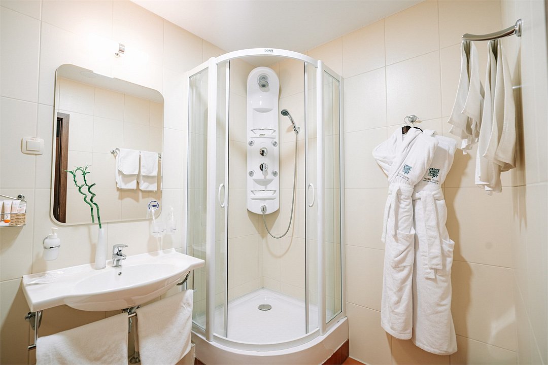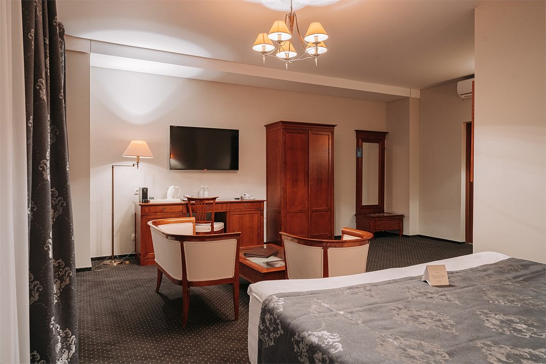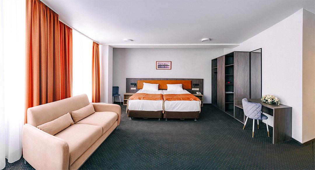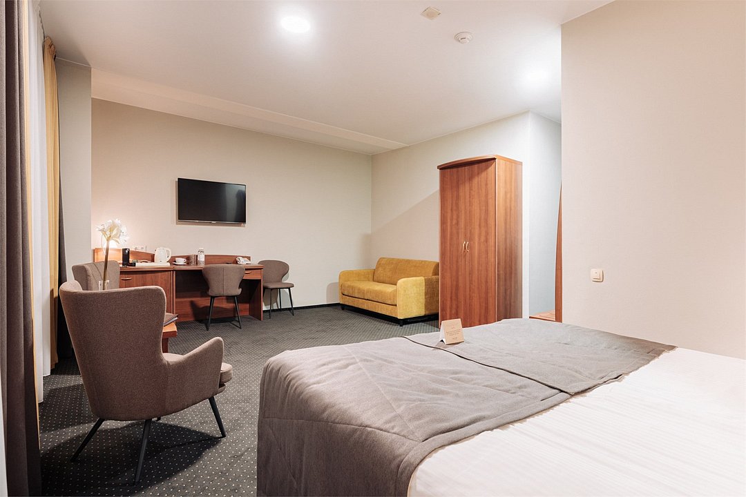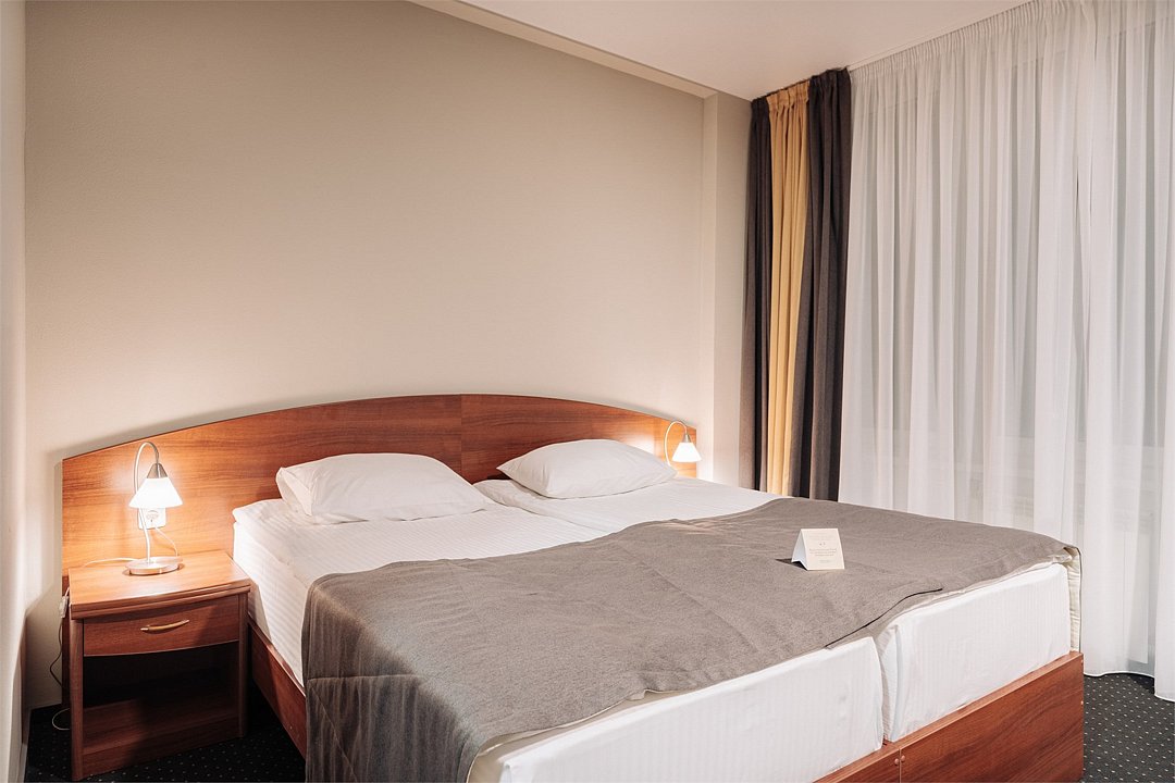 Двухместный номер с кроватью «Кинг сайз». Просторная комната, оснащенная современной мебелью, чайной станцией, кофе машиной, выполнена в теплых пастельных тонах. В каждом номере тапочки, французская гипоаллергенная косметика; позволит гостям в полной мере насладиться отдыхом. Площадь номера 32 кв.м.Услуги и удобства