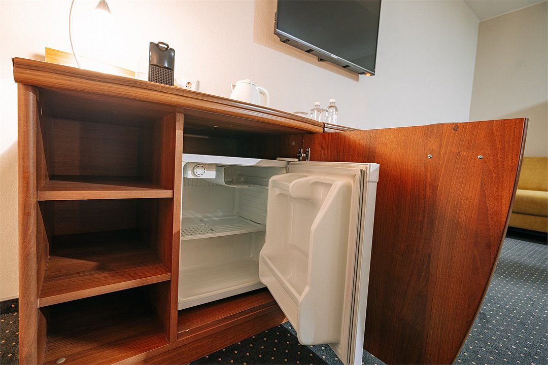 телевизор, Wi-Fi, интернет, телефон, холодильник, кондиционер, светильник, настольные лампы, фен, электронные замки, микроволновая печь, утюг, обогреватель, душевая кабина, тапочки, кровать «King size», тумбы, стулья, шкаф для одежды, вешалки, письменный стол, обеденный стол, зеркало, кухня, информационная карта, меню, стиральная машина, чайник, унитаз, раковина, ковровое покрытие, отопление, вид на город, кресло, раздельный санузел, вид во двор, кухонная посуда, стаканы, раскладной диванВ номере