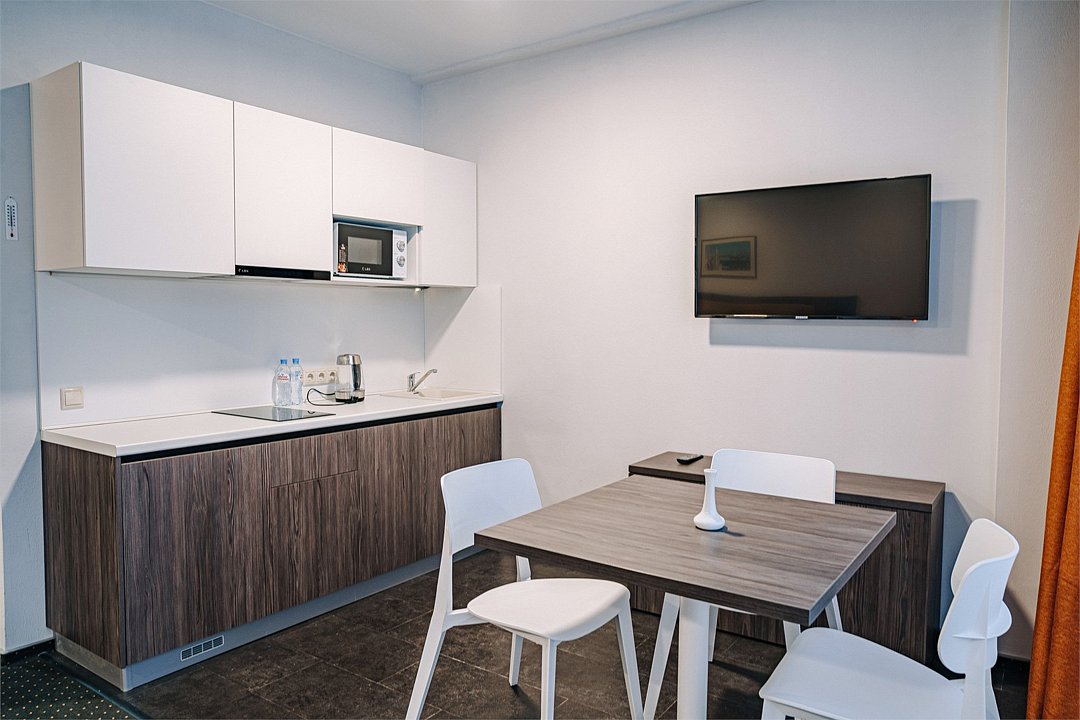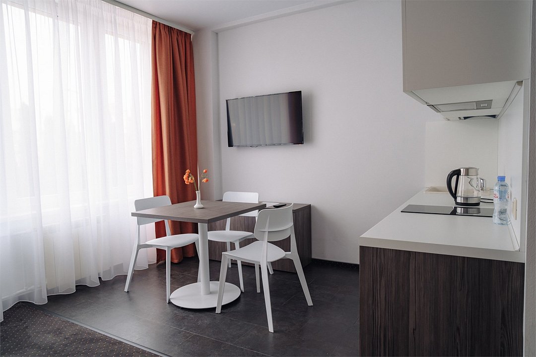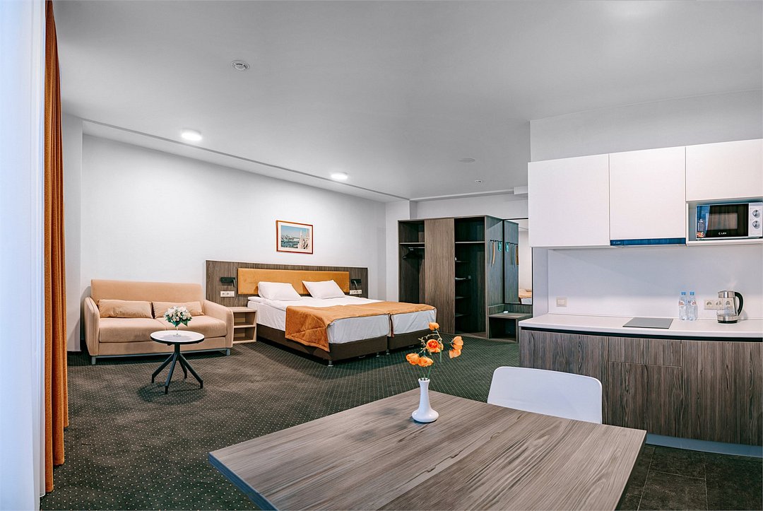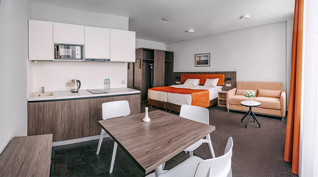 Просторный многофункциональный однокомнатный номер категории студия с кухней, европейский дизайн, подходит для комфортного размещения, в том числе для длительного проживания.Услуги и удобства