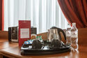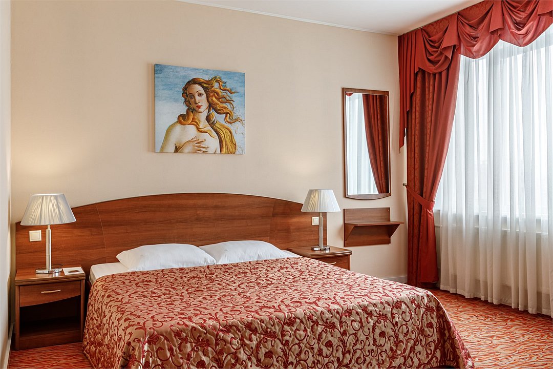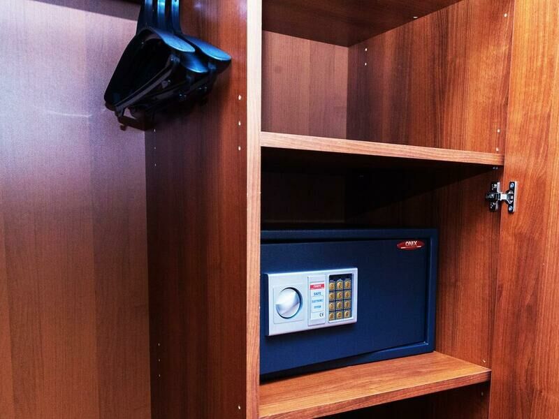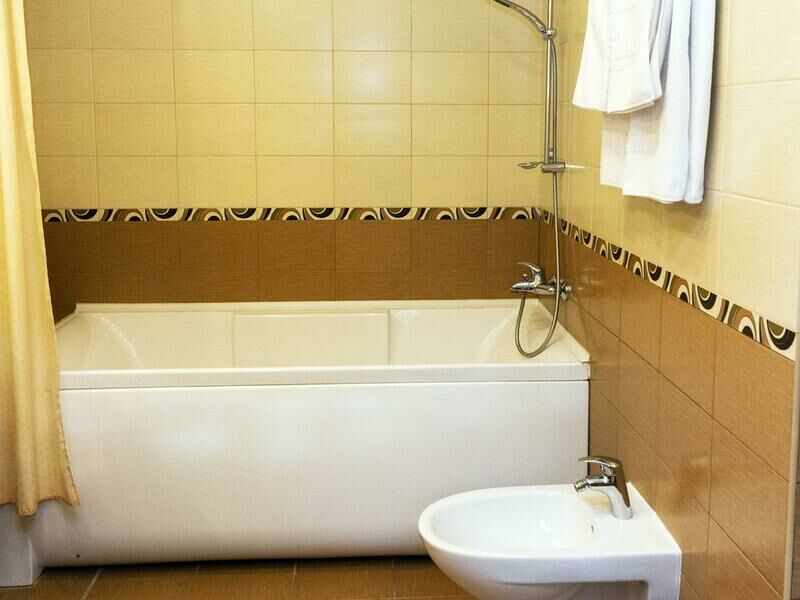 телевизор, спутниковое телевидение, кабельное телевидение, интерактивное телевидение, Wi-Fi, телефон, кондиционер, светильник, настольные лампы, фен, система безопасности, электронные замки, ванная комната, ванна, санузел, тапочки, гигиенические средства, косметические средства, двуспальная кровать, ортопедический матрас, тумбы, стулья, шкаф для одежды, вешалки, письменный стол, багажная тумба, зеркало, мини-бар, письменные принадлежности, чайный набор, информационная карта, меню, сейф, чайник, унитаз, раковина, косметическое зеркало, вид на город, вид во двор, без питомцевВ номере