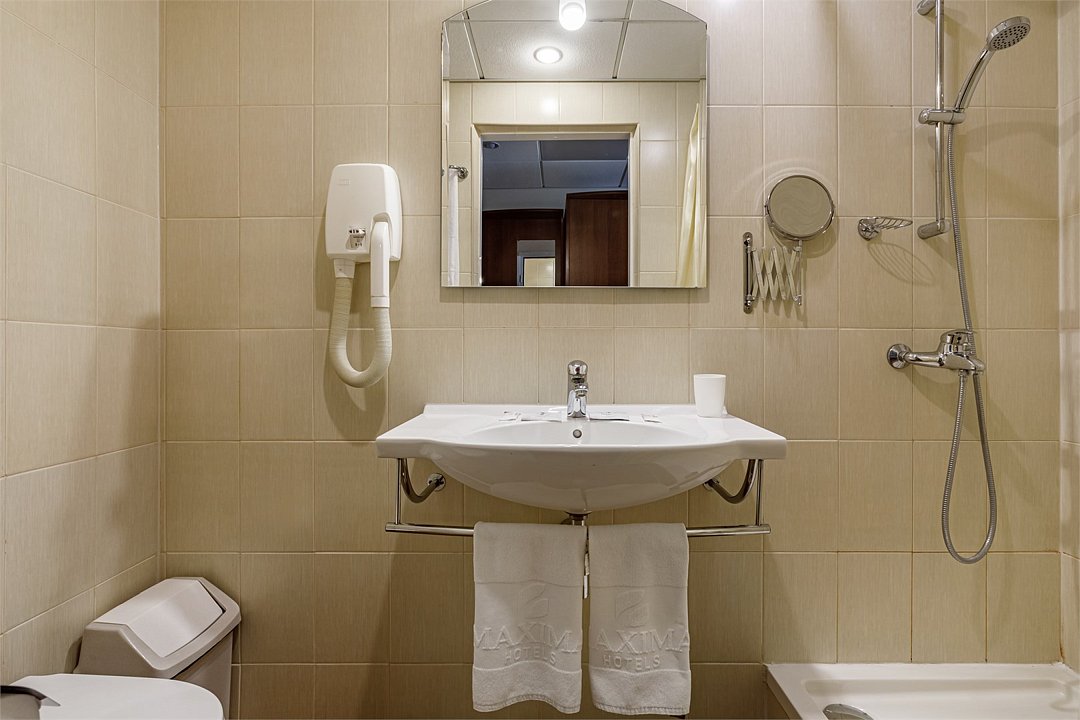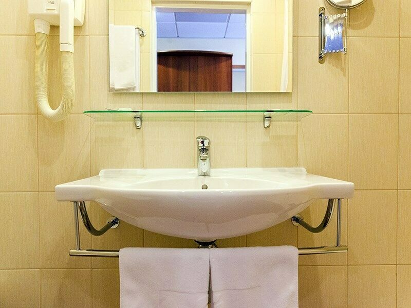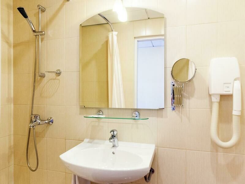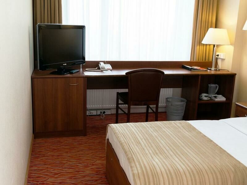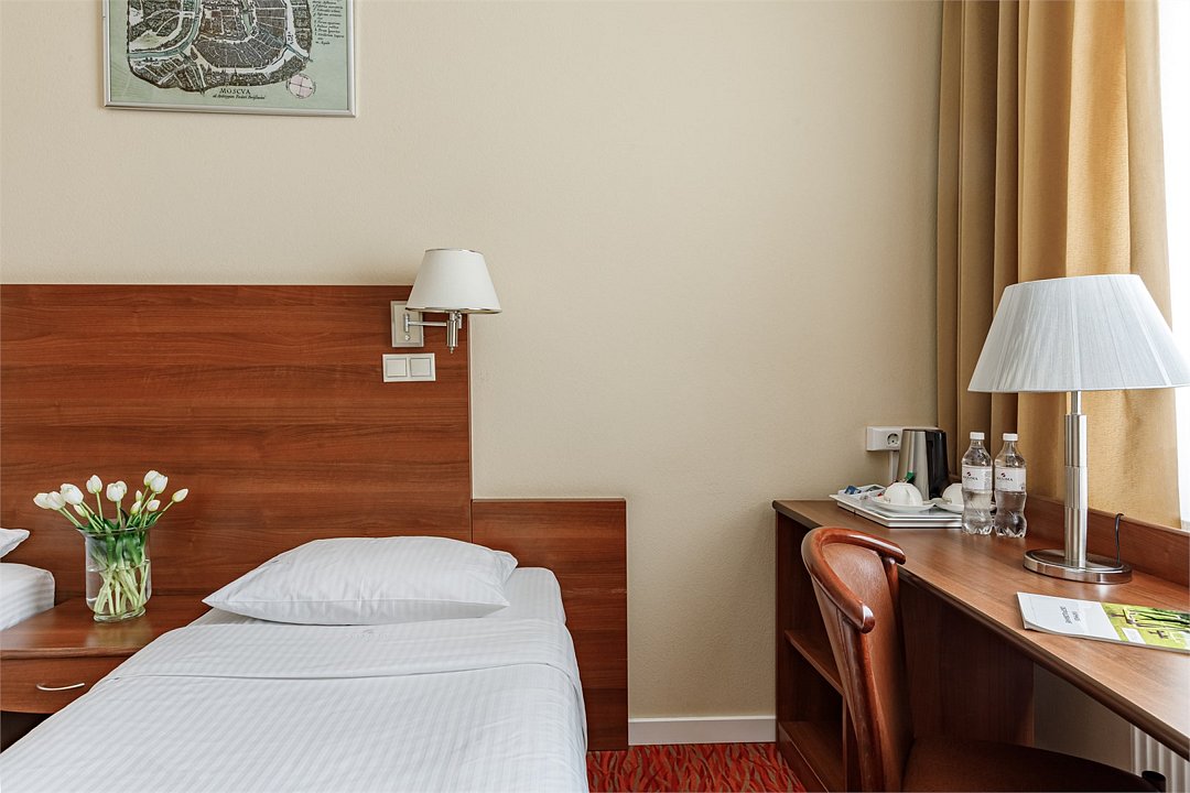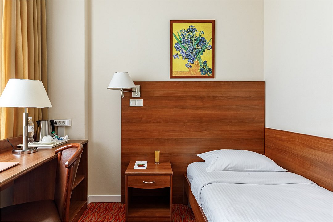 телевизор, спутниковое телевидение, кабельное телевидение, интерактивное телевидение, Wi-Fi, телефон, кондиционер, светильник, настольные лампы, фен, электронные замки, ванная комната, душевая кабина, санузел, гигиенические средства, косметические средства, односпальная кровать, ортопедический матрас, тумбы, стулья, шкаф для одежды, вешалки, письменный стол, багажная тумба, зеркало, письменные принадлежности, чайный набор, обслуживание номеров, информационная карта, меню, чайник, унитаз, раковина, вид на город, вид во двор, без питомцевВ номере