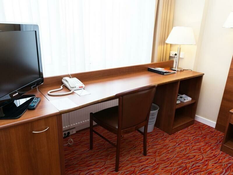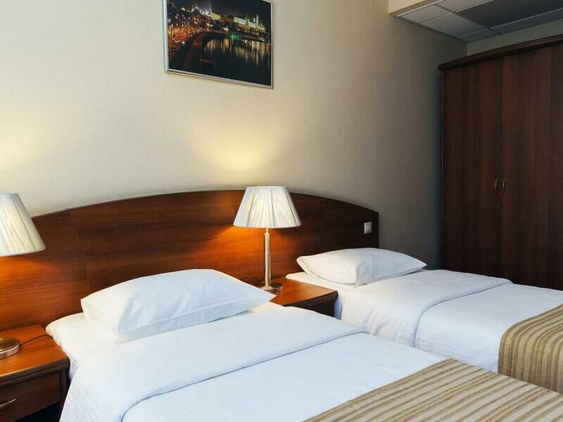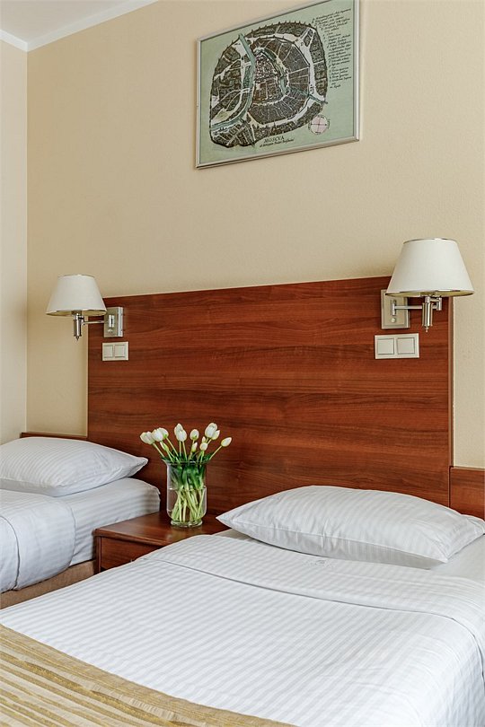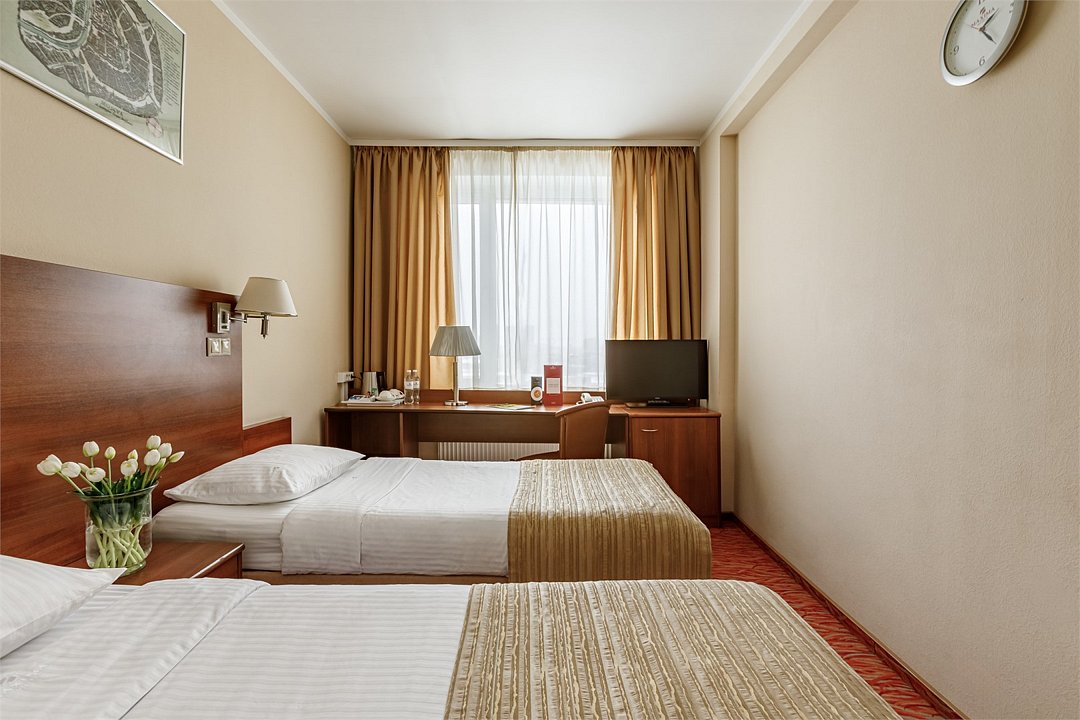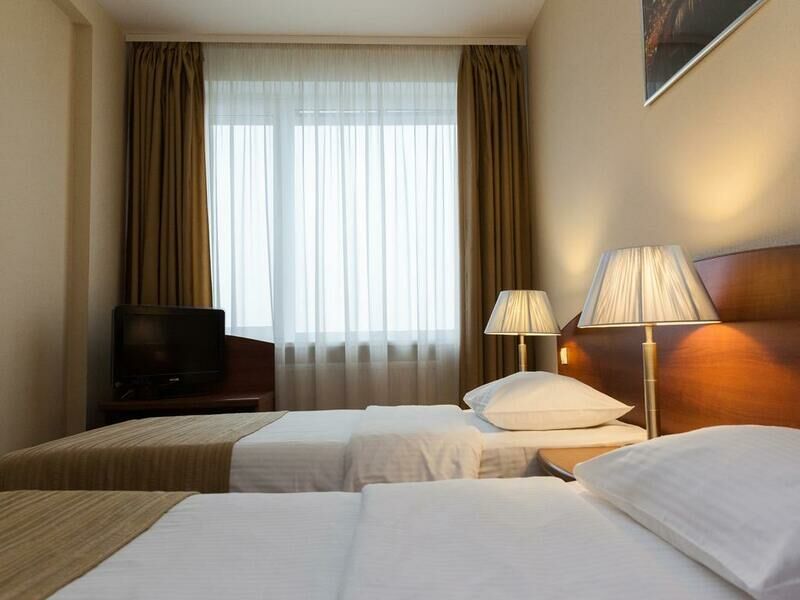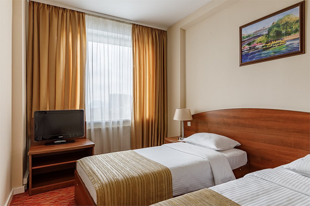 телевизор, спутниковое телевидение, кабельное телевидение, интерактивное телевидение, Wi-Fi, телефон, кондиционер, светильник, настольные лампы, фен, электронные замки, ванная комната, ванна или душевая кабина, санузел, тапочки, гигиенические средства, косметические средства, две односпальные кровати, ортопедический матрас, тумбы, стулья, шкаф для одежды, вешалки, письменный стол, багажная тумба, зеркало, мини-бар, письменные принадлежности, чайный набор, информационная карта, меню, сейф, чайник, унитаз, раковина, вид на город, вид во двор, без питомцевВ номере
