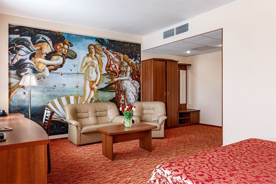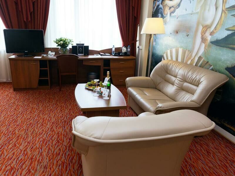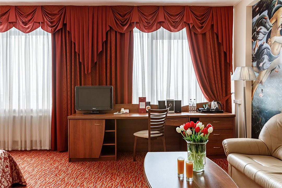 - Площадь номера 38 кв.м. - Кровать queen-size 180*200 см. - Бесплатный Wi-Fi - Музыкальная система - Индивидуальный сейф - Швейный набор - Чайная пара - Чай, кофе, сахар и сливки - Док-станция для зарядки и синхронизации apple-устройств - Минеральная вода - Центральное кондиционирование с индивидуальным пультом управления - Телефон - Набор мягкой мебели (кресло и раскладной диван) - Журнальный столик - Письменный стол - ЖК телевизор - Шкаф для верхней одежды - Дополнительное место предоставляется по запросу (стоимость без питания 1500 руб./сутки) - Дети до 10 лет включительно размещаются бесплатно без предоставления дополнительного места В ванной комнате: - Ванна - Фен - Одноразовый зубной набор - Тапочки - Банный халат - Комплект полотенец - Косметические принадлежностиУслуги и удобства