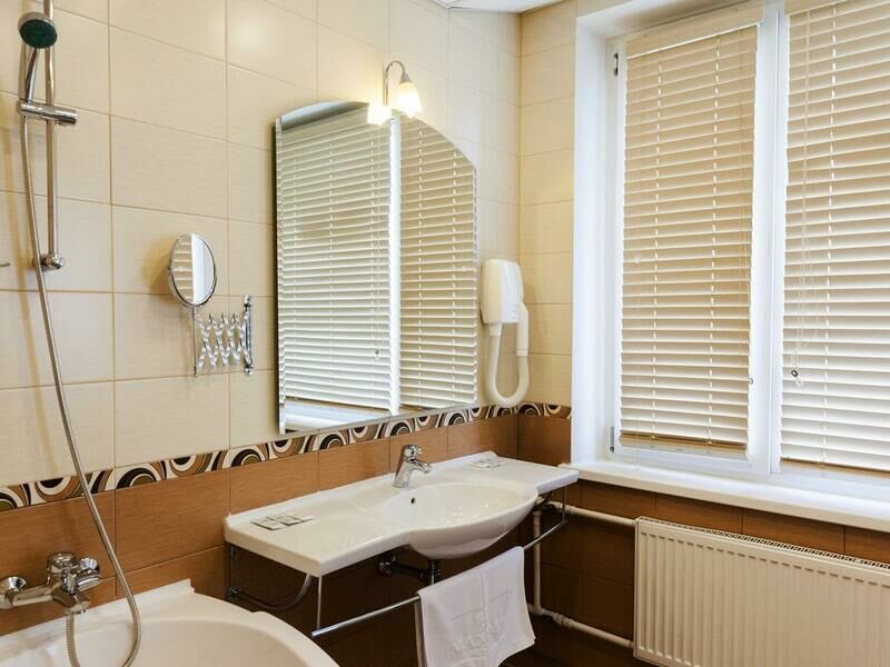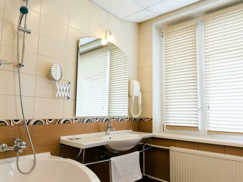 телевизор, спутниковое телевидение, кабельное телевидение, интерактивное телевидение, Wi-Fi, телефон, кондиционер, светильник, настольные лампы, фен, система безопасности, электронные замки, ванная комната, ванна или душевая кабина, санузел, тапочки, гигиенические средства, косметические средства, двуспальная кровать, ортопедический матрас, тумбы, стулья, шкаф для одежды, вешалки, письменный стол, багажная тумба, зеркало, мини-бар, письменные принадлежности, чайный набор, информационная карта, меню, сейф, чайник, унитаз, раковина, вид на город, вид во двор, можно с питомцами, пакетик для выгулаВ номере