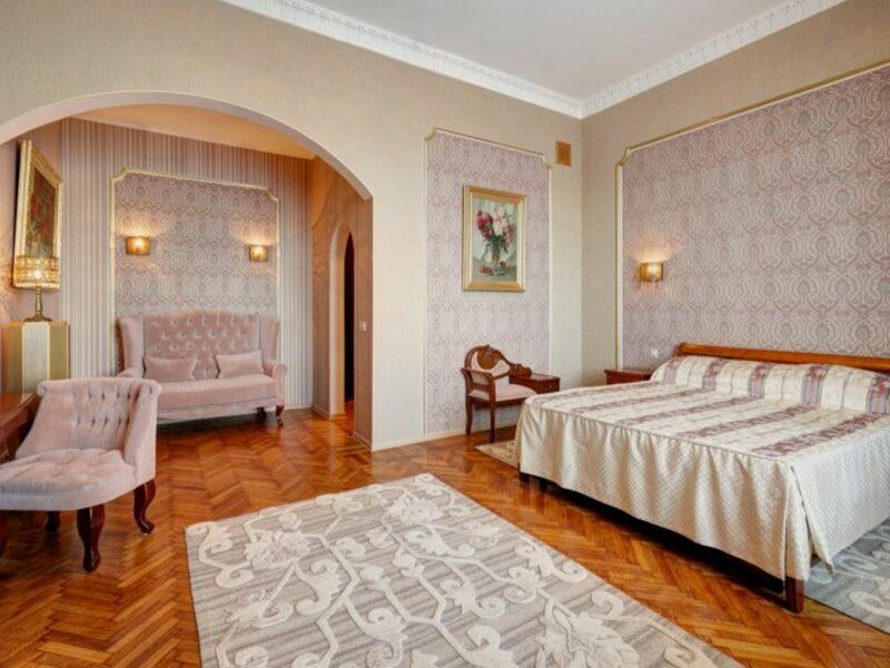 Элегантные однокомнатные номера в классическом стиле, каждый из которых неповторим. С большой двуспальной кроватями.