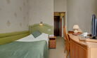 Номер нормальных размеров. Сантехника среднего качества, ванная а не душ. Мини бар пустой, зато литр воды каждый день, и набор для чая. Годная звукоизоляция от улицы; зато плохая - через дверь. Благо, отель полупустой, по коридору мало кто ходит.