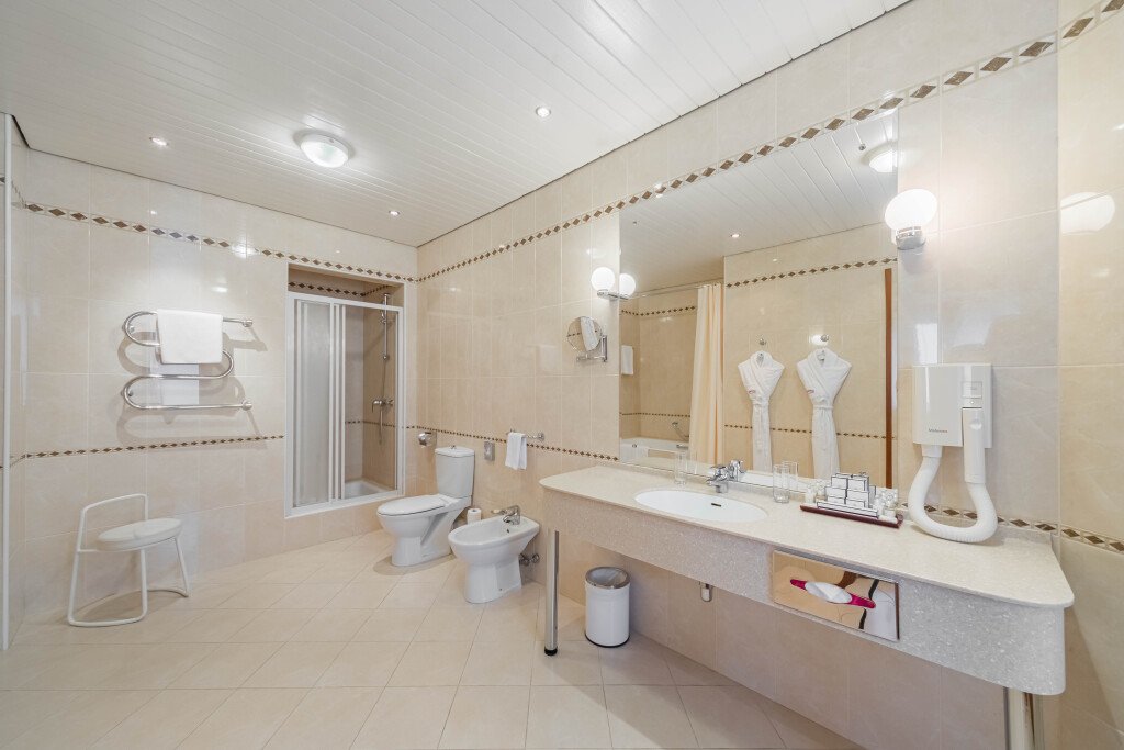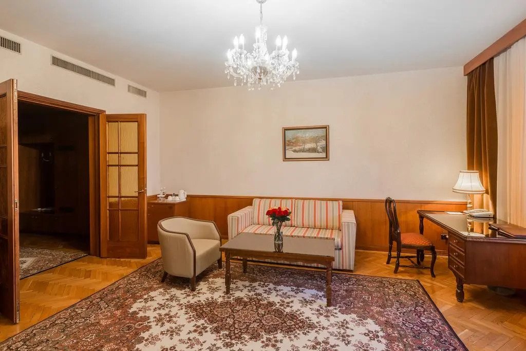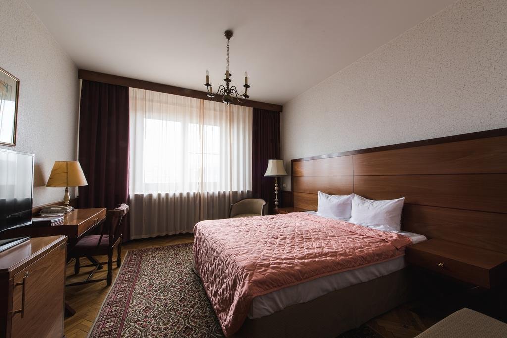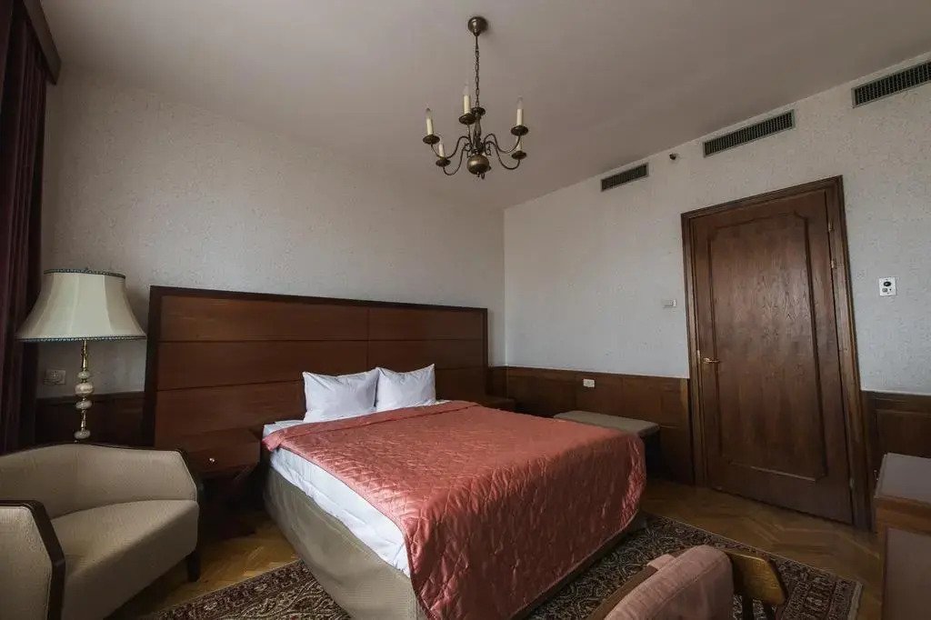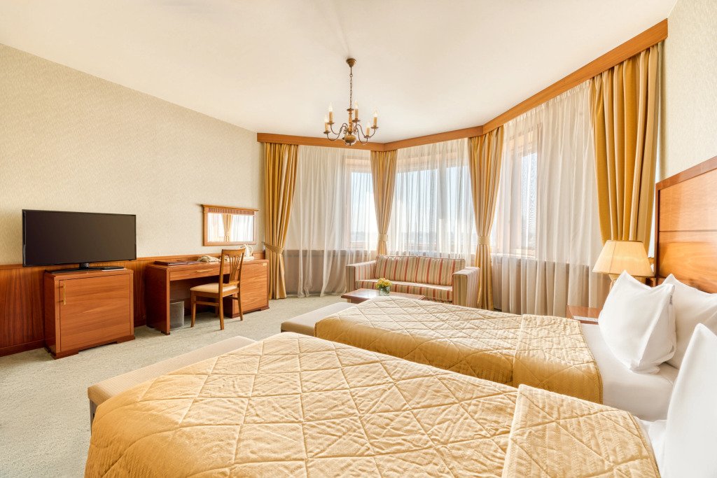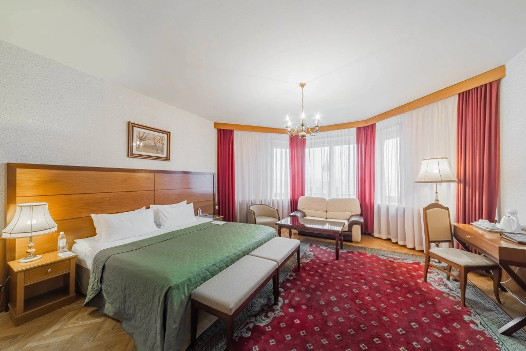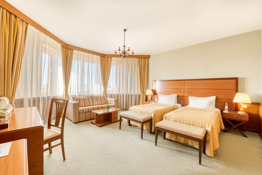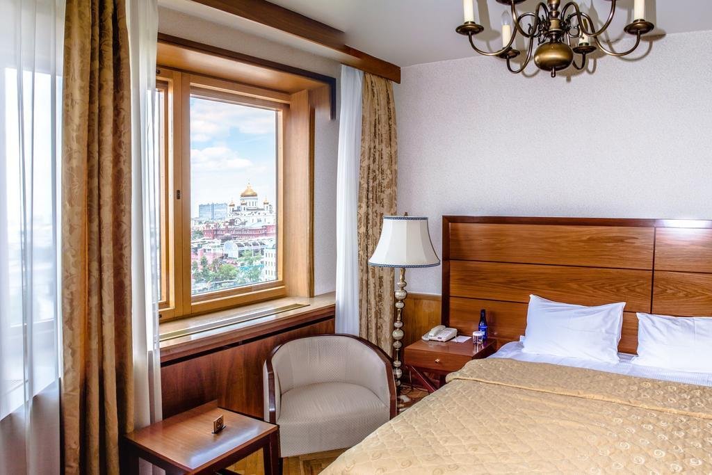 Номера оборудованы телефоном, спутниковым телевидением, сейфом, мини-баром и сервисным оснащением. С верхних этажей открывается панорамный вид на центральную часть города, памятник Петру I, храм Христа Спасителя и улицу Большая Якиманка.